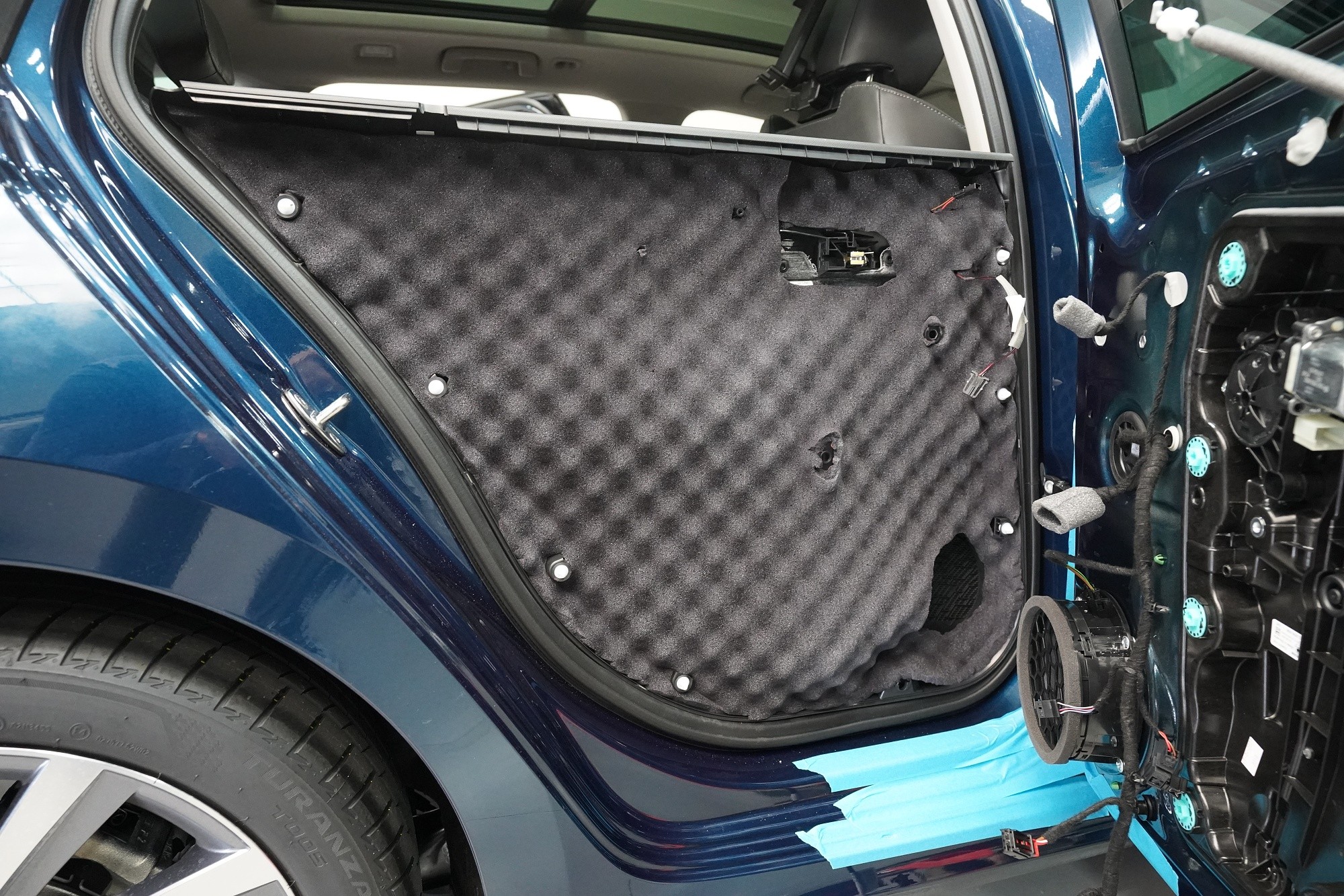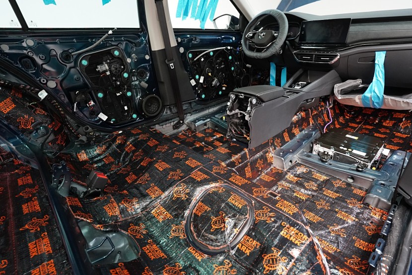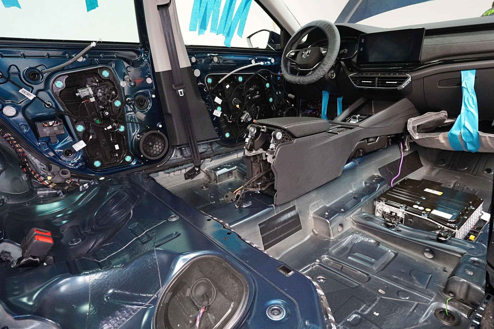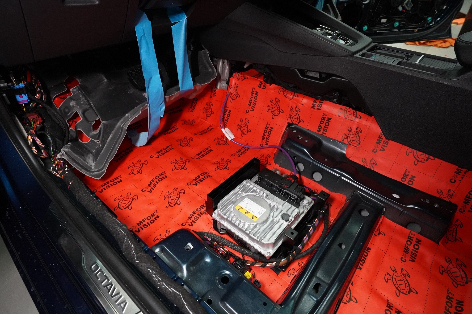Odhlučnění vozidla Škoda Octavia 4. I čtvrtá generace bude zajisté bestsellerem značky a my jsme byli v očekávání, zda se kromě nového trendy vzhledu, moderního interiéru a spousty nových technologií dočkáme i vylepšení zvukové izolace. Doufali jsme marně, protože čtvrtá generace nepřináší žádné zlepšení oproti svému předchůdci. Na karoseri prakticky chybí ochrana proti vibracím a totéž se dá prohlásit i o zvukové izolaci. Vůz tedy klasicky trpí na výrazný hluk od předních a zadních pneumatik, vozovky i na okolní silniční a aerodynamický hluk. Naším cílem tedy je posunout protihlukovou izolaci na zcela jiný level a proto jsme se s majitelem domluvili na našem balíčku odhlučnění Premium Plus, který kromě střechy zahrnuje všechny důležité oblasti vozu. Konkrétně tedy odhlučňujeme přední, zadní i páté dveře, podlahu, zavazadlový prostor, zadní podběhy a kapotu. Nad rámec balíčku jsme odhlučnili i torpédo kvůli snížení hluku od motoru. Oproti klasickému balíčku Premium volíme účinnější a silnější materiály i více vrstev se zaměřením především na podlahu a zadní podběhy vozu. Právě tyto oblasti jsou nejvíce zatížené hlukem a je nutné k nim přistupovat s maximální péčí. Na odhlučnění pracují zároveň tři naši technici, kteří montáž zvládnou v rámci 1 pracovního dne.