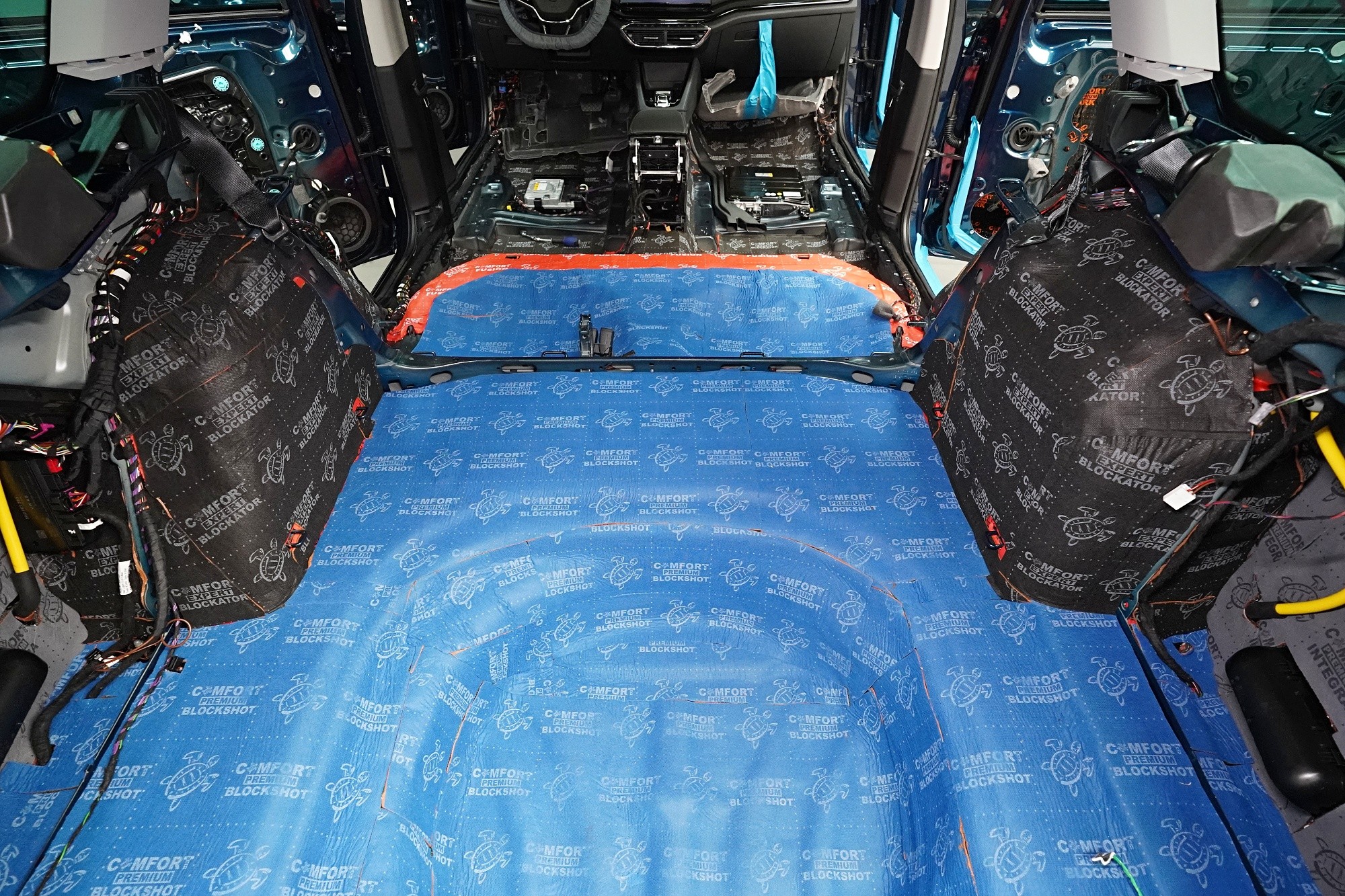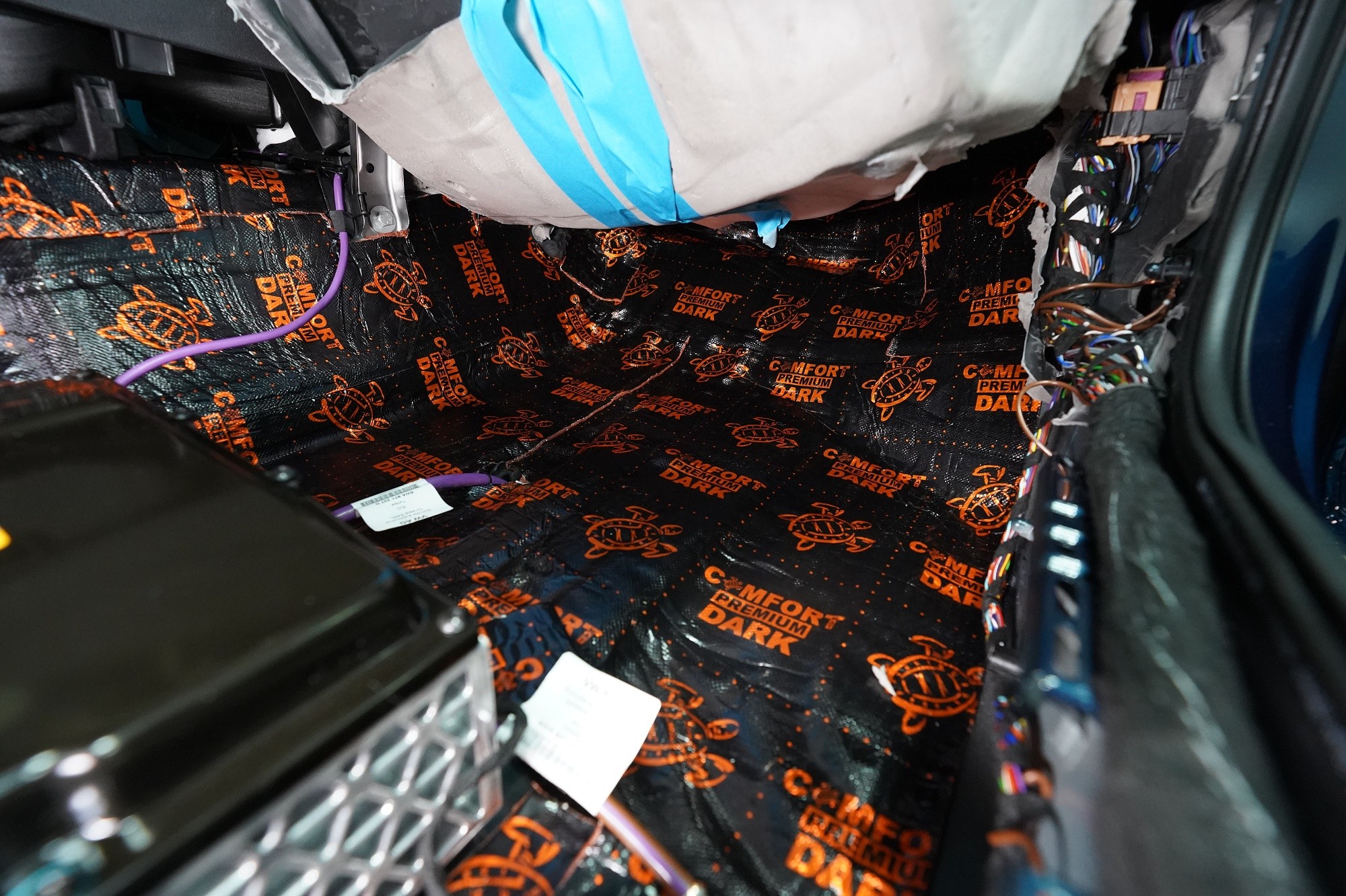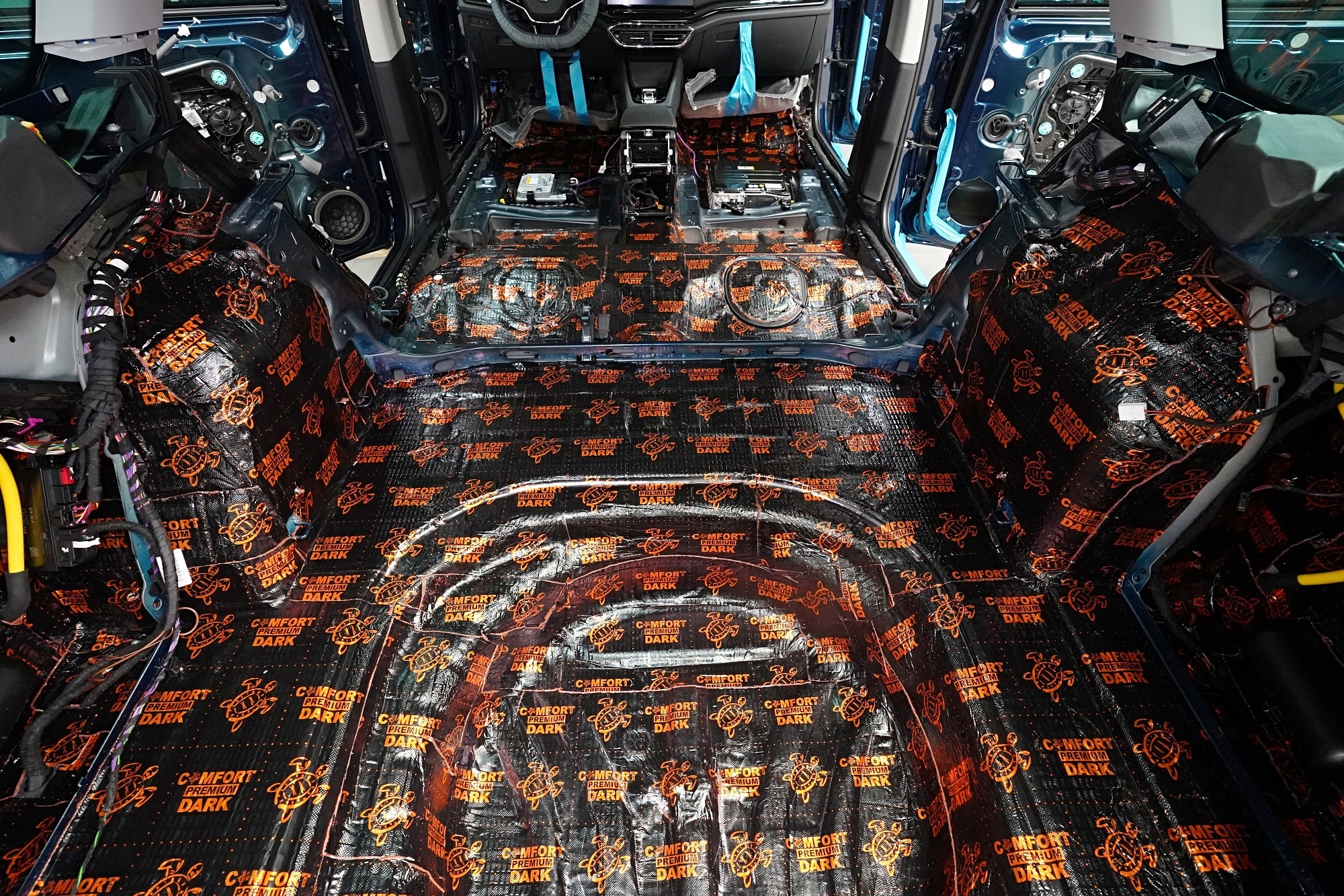 Comfortmat Dark D4 aplikujeme na všechny přístupné oblasti, abychom umožnili absorpci maximálního množství vibrací a nízkofrekvenčního hluku. V přední části podlahy se dostáváme až pod palubní desku, díky čemuž důkladně odhlučníme i přední podběhy z vnitřní části vozu, kde je přístup k větší ploše karoserie. Podlahu odhlučňujeme vysoce účinným antivibračním materiálem o tloušťce 4 mm a zvukově izolačními materiály v druhé a třetí vrstvě o tloušťce 9 mm. Celkem tedy 13 mm zvukové izolace, což má za následek důkladné zamezení hluku od předních pneumatik i bez aplikace z vnější strany.