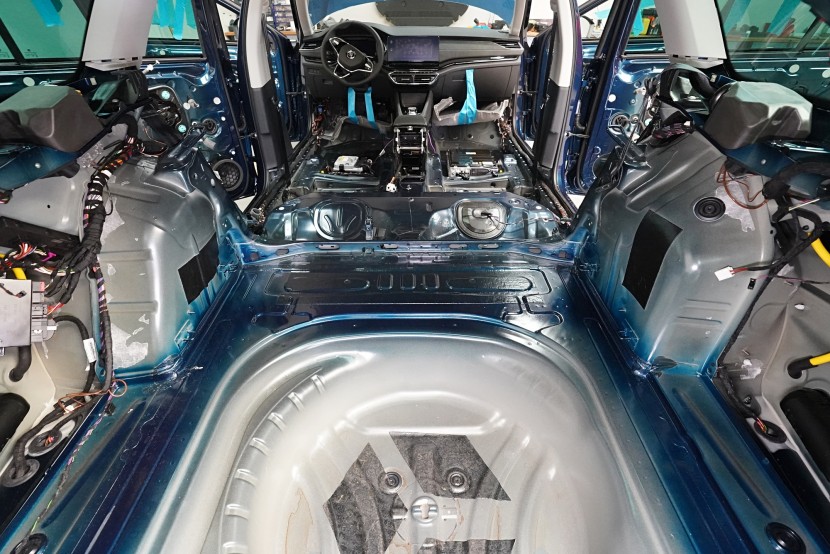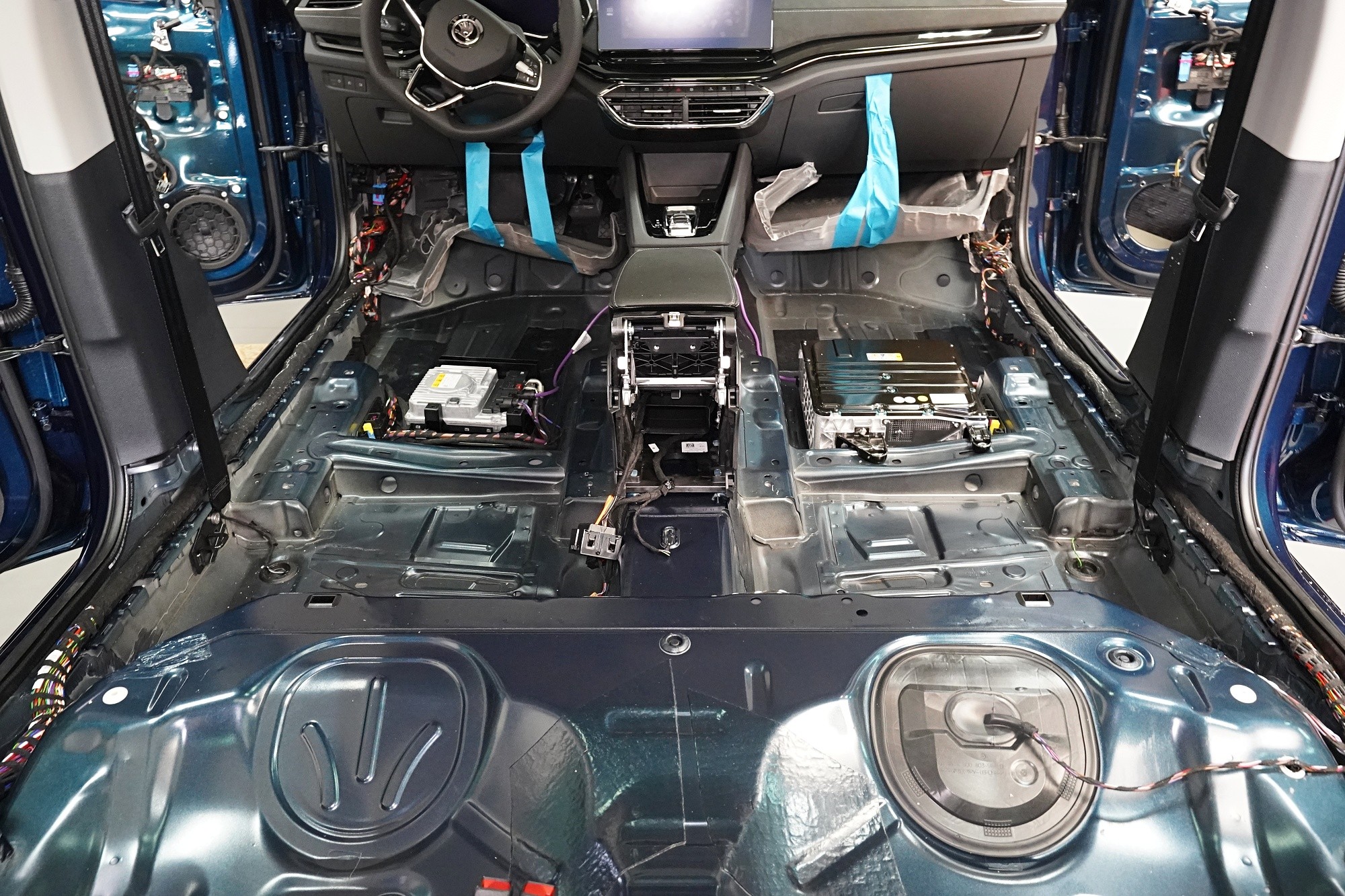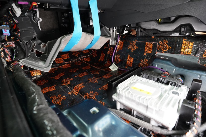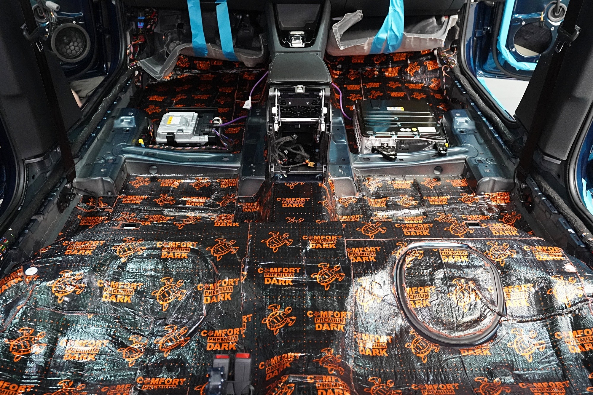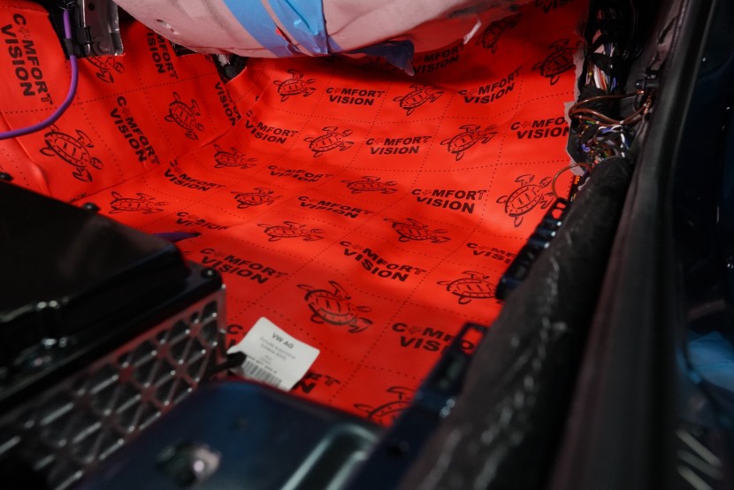 Comfortmat Dark D4 aplikujeme na všechny přístupné oblasti, abychom umožnili absorpci maximálního množství vibrací a nízkofrekvenčního hluku. V přední části podlahy se dostáváme až pod palubní desku, díky čemuž důkladně odhlučníme i přední podběhy z vnitřní části vozu, kde je přístup k větší ploše karoserie. Podlahu odhlučňujeme vysoce účinným antivibračním materiálem o tloušťce 4 mm a zvukově izolačními materiály v druhé a třetí vrstvě o tloušťce 9 mm. Celkem tedy 13 mm zvukové izolace, což má za následek důkladné zamezení hluku od předních pneumatik i bez aplikace z vnější strany.
