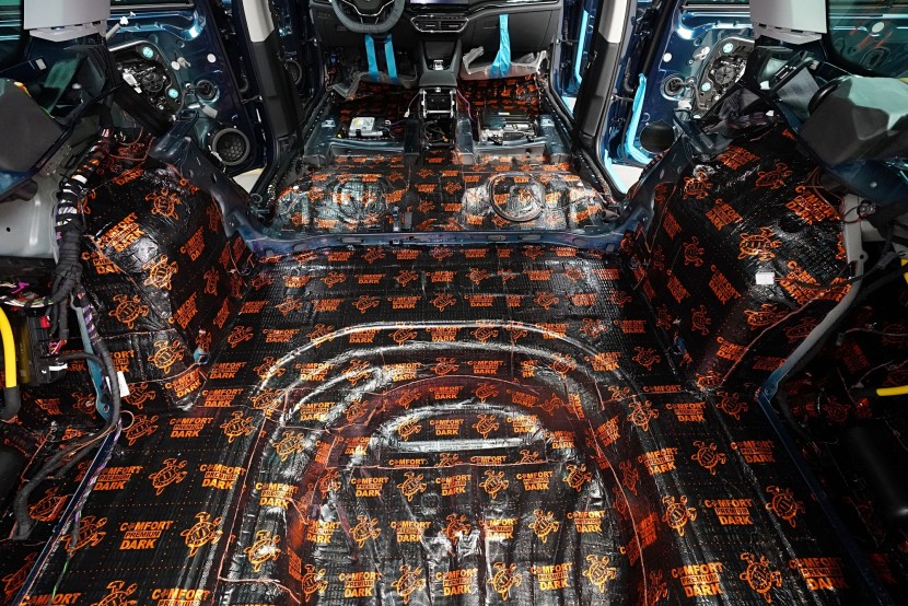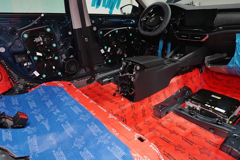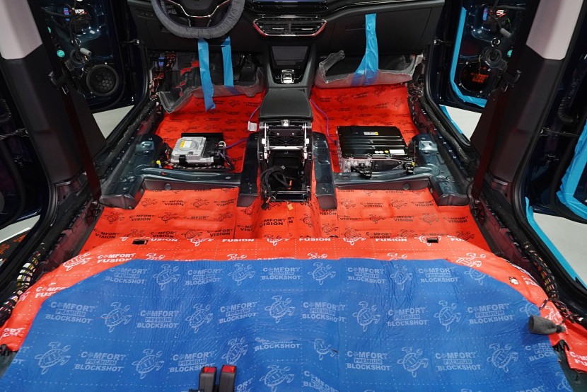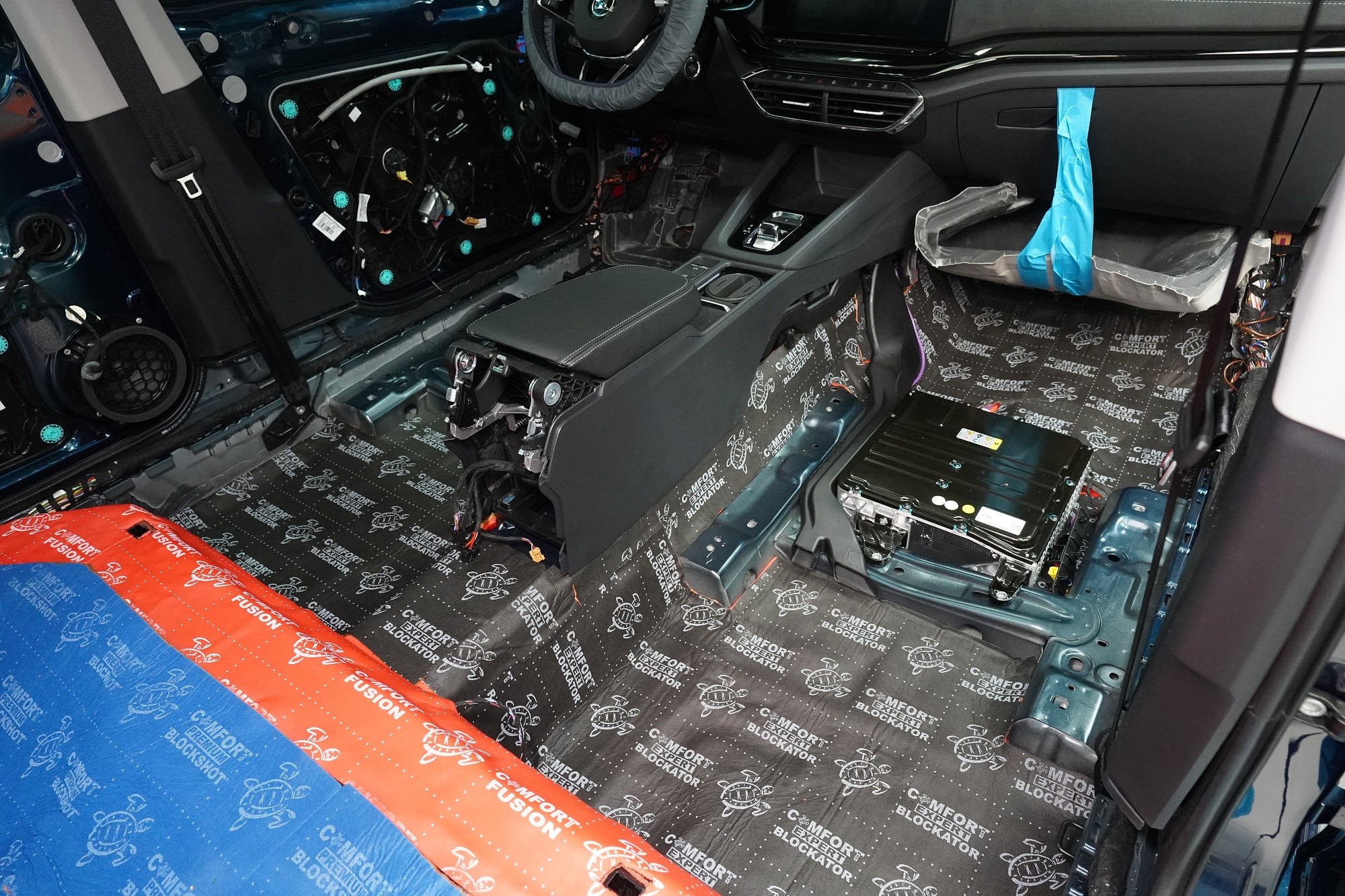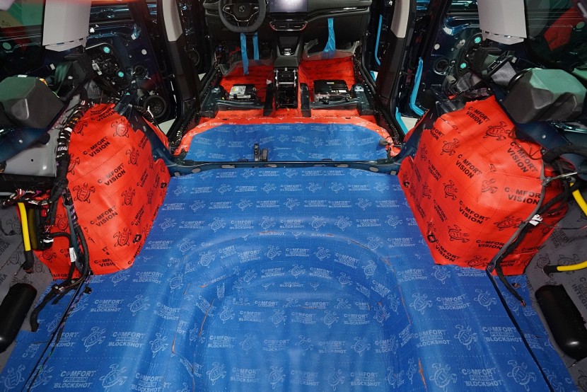 Druhou vrstvu tvoří zvukově a tepelně izolační materiál Comfortmat Vision, který při tloušťce 6 mm vyniká vysokou schopností zvukové izolace a velmi nízkou hmotností. Pro maximální účinnost odhlučnění podlahy bude na něj nalepena ještě třetí vrstva v podobě akustické membrány Comfortmat Blockator. Do zadní části podlahy (pod zadními sedačkami) jsme aplikovali jako druhou vrstvu membránový zvukově izolační materiál Comfortmat Blockshot se schopností zvukové izolace až 31 dB. Tato vrstva je vzhledem k vysoké účinnosti materiálu finální.