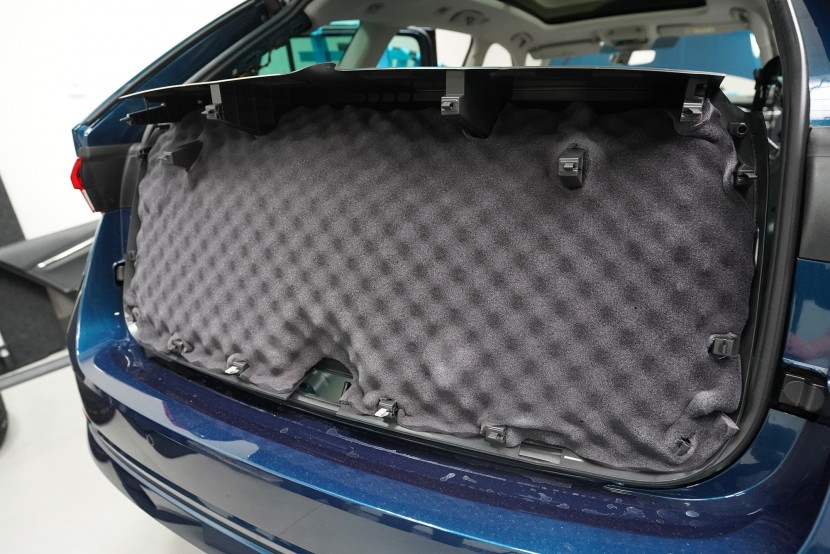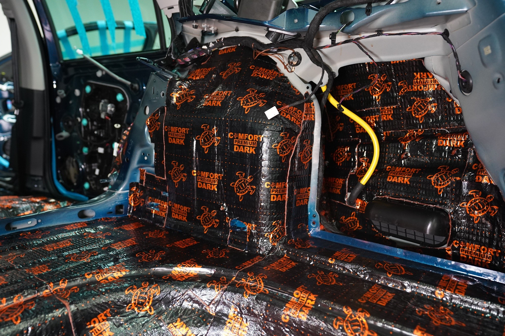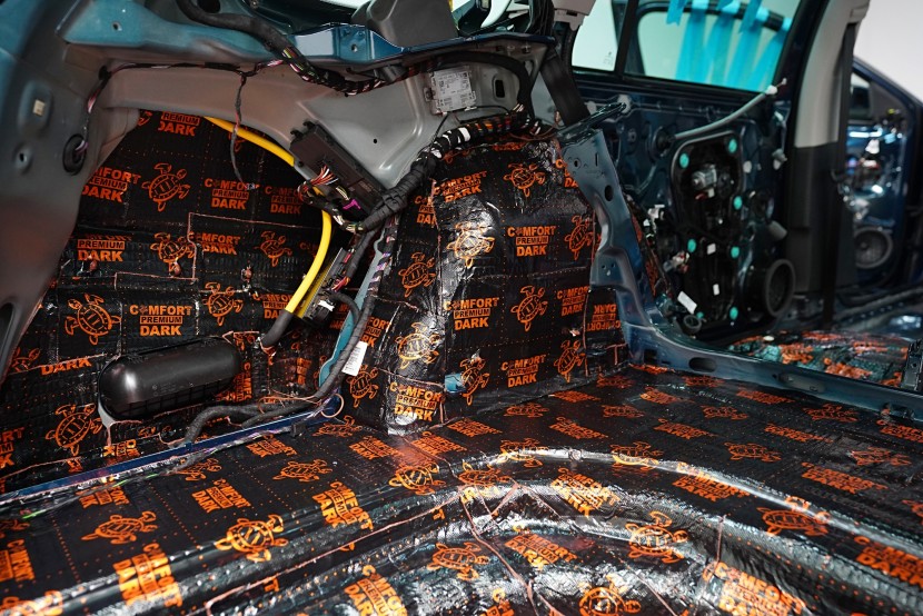 Zavazadlový prostor odhlučňujeme se stejnou pečlivostí. Na všechny plochy kromě zadních podběhů aplikujeme antivibrační materiál Comfortmat Dark D3 o tloušťce 3 mm a MLF 0,49. Pouze na podběhy lepíme účinnější materiál Dark D4 s tloušťkou 4 mm a vyšším akustickým ztrátovým činitelem (MLF) o hodnotě 0,49 jednotek. Takový materiál již dokáže velmi účinně zamezit vibracím a nízkofrekvenčnímu hluku, který je typický zejména u pneumatik.