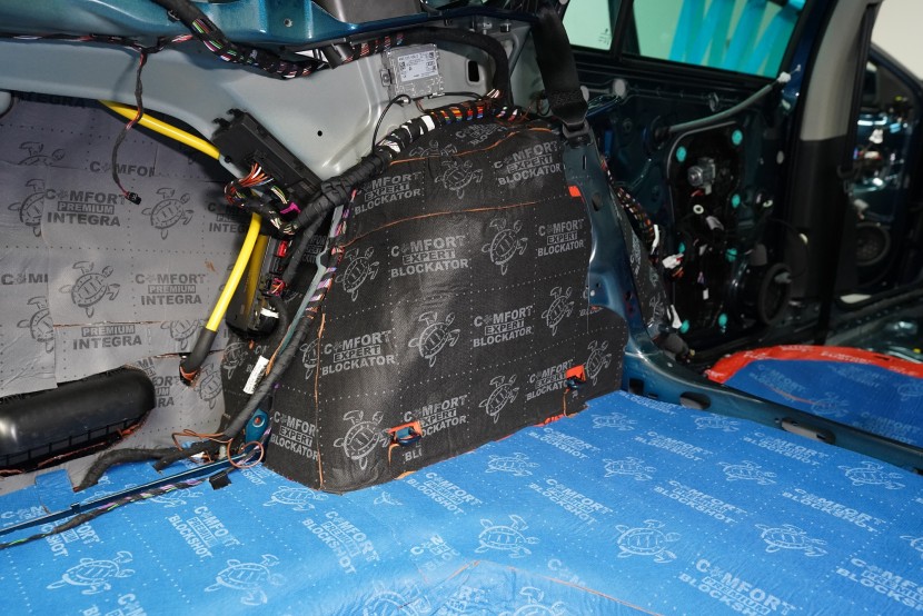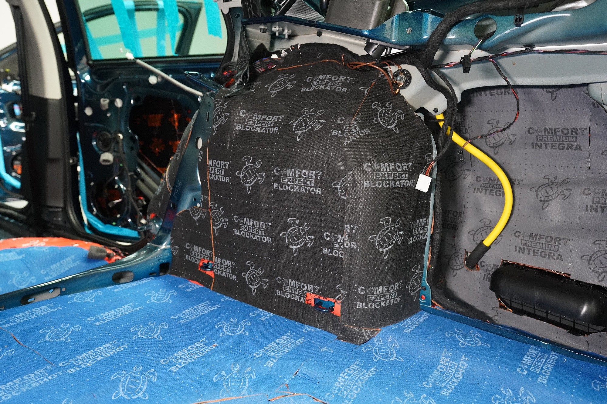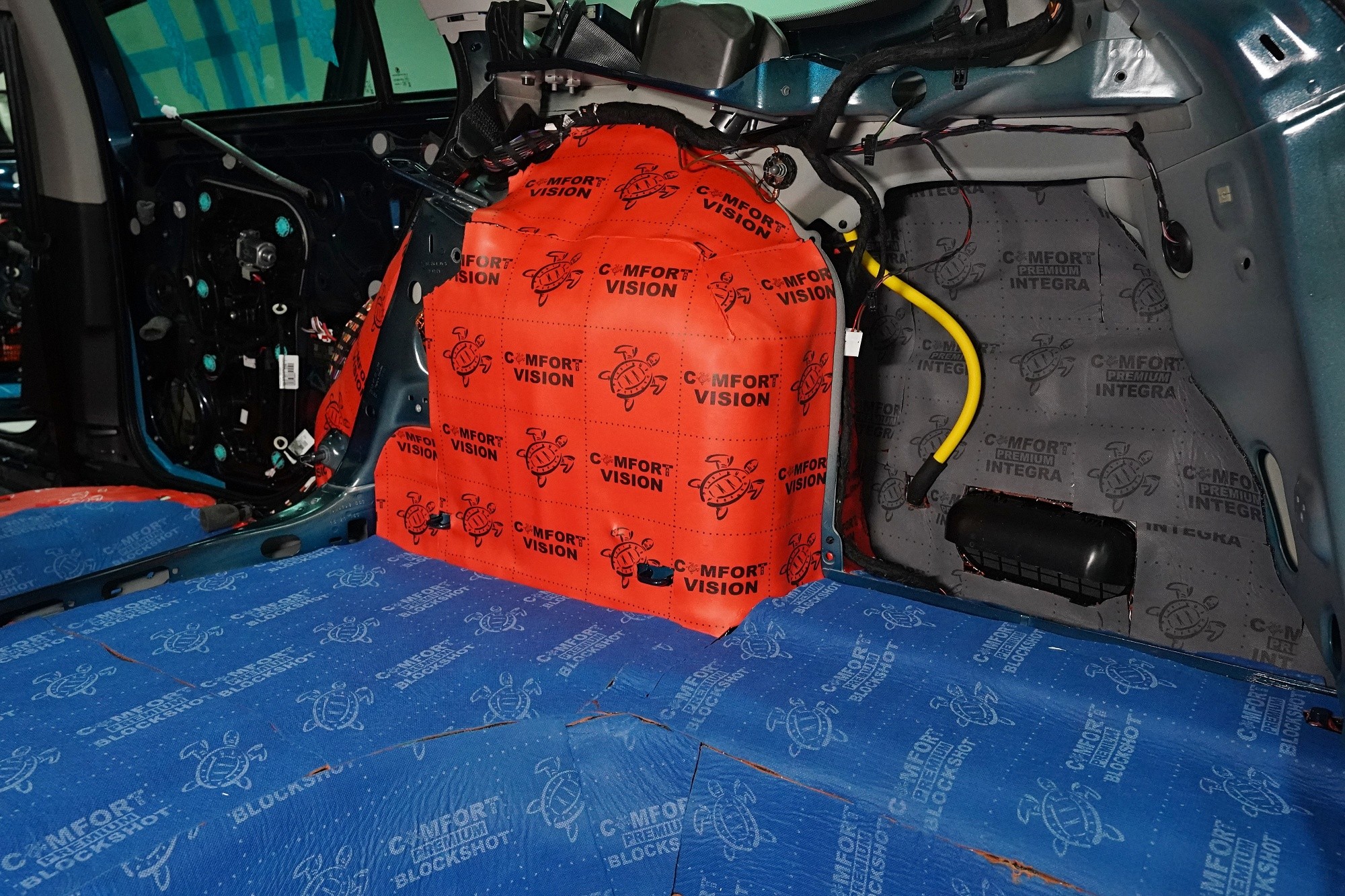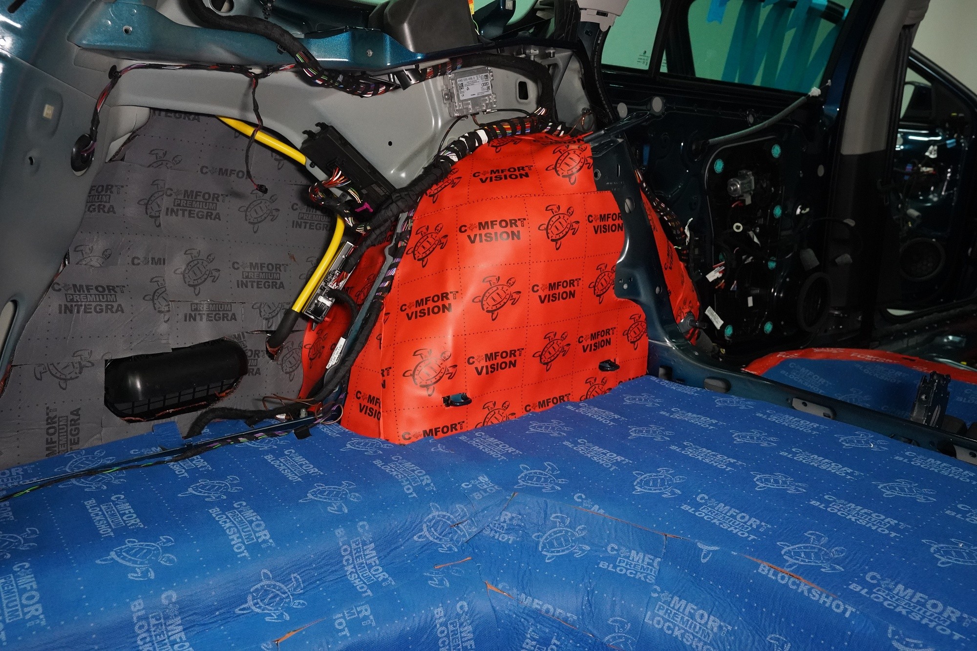 Ze stejného důvodu volíme rozdílné materiály i ve druhé vrstvě odhlučnění. Na dno kufru aplikujeme membránový zvukově izolační materiál Comfortmat Blockshot se schopností zvukové izolace až 31 dB. Materiál se vyznačuje dvouvrstvým složením s akustickou membránou, která až 2x zvyšuje účinnost materiálu. Co se týče podběhů, tak ty odhlučňujeme stejným způsobem jako podlahu, tedy červeným materiálem Comfortmat Vision ve druhé vrstvě, na který v dalším kroku aplikujeme membránu Comfortmat Blockator.