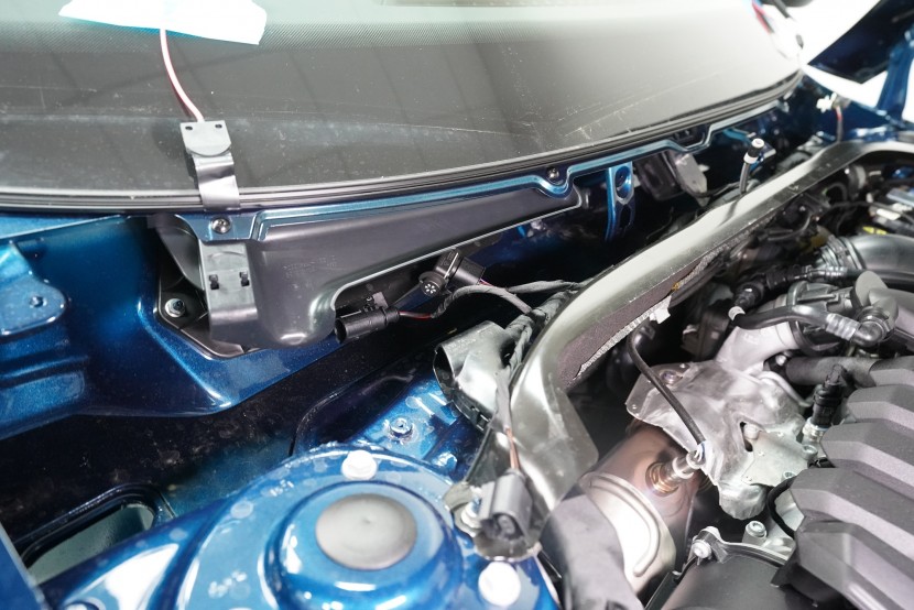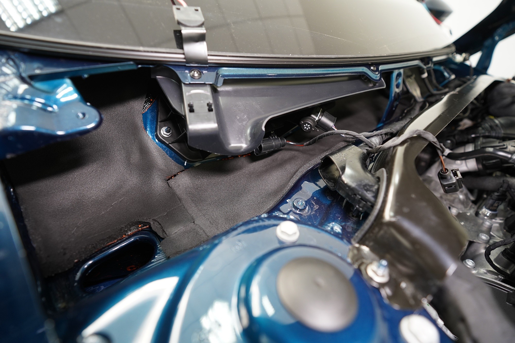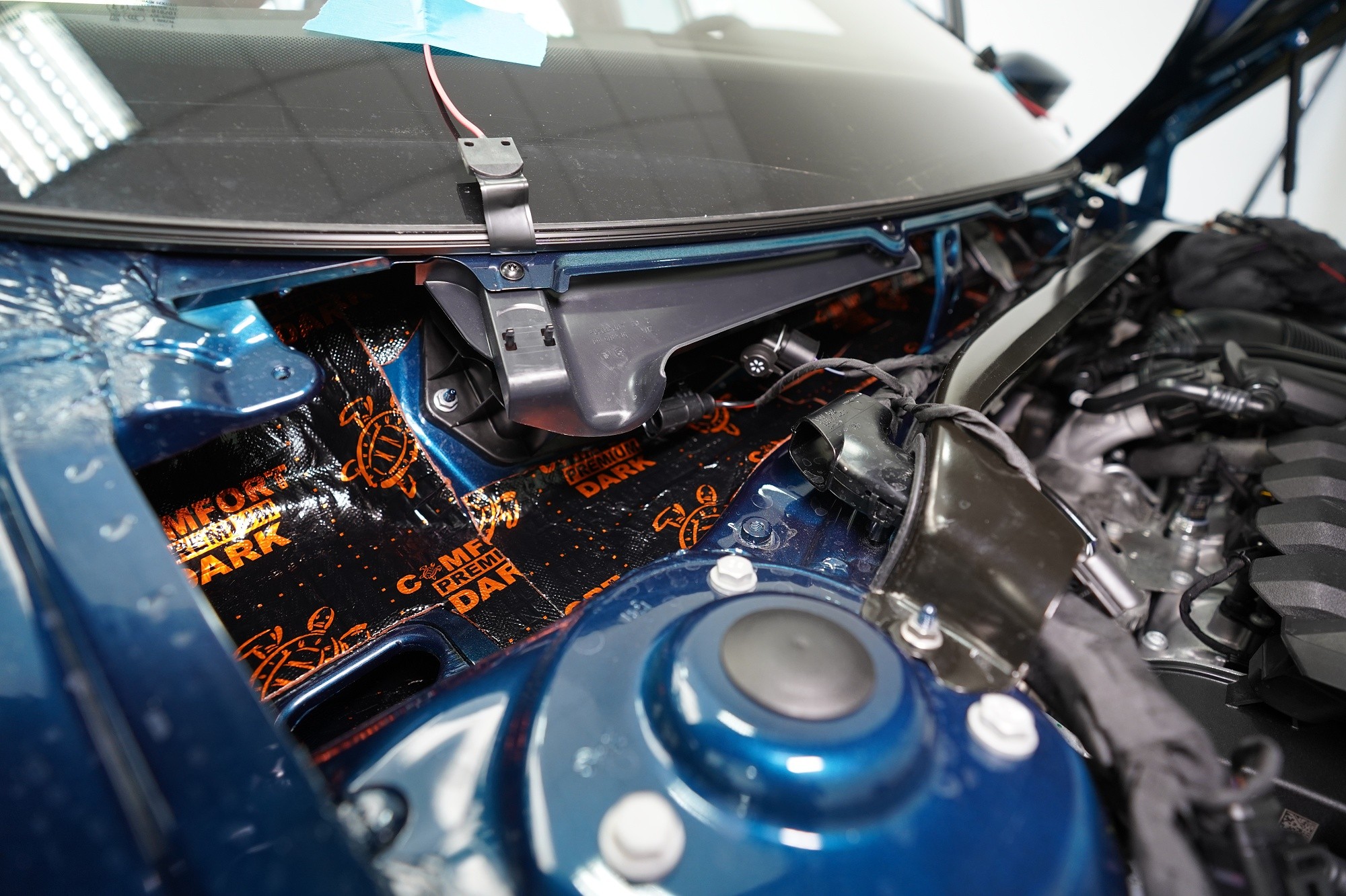 Také odhlučnění torpéda může přinést zajímavé výsledky. Stěrače jsou zdrojem silných vzduchových turbulencí a prostor pod spodním okrajem čelního skla je často veliký. Vytváří se zde efekt zvuku v jeskyni a to v bezprostřední blízkosti interiéru. Druhým důvodem k odhlučnění torpéda je snížení hluku od motoru. Nejprve tradičně aplikujeme antivibrační materiál, konkrétně Comfortmat Dark D2, který odfiltruje silné vibrace motoru.