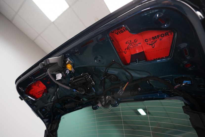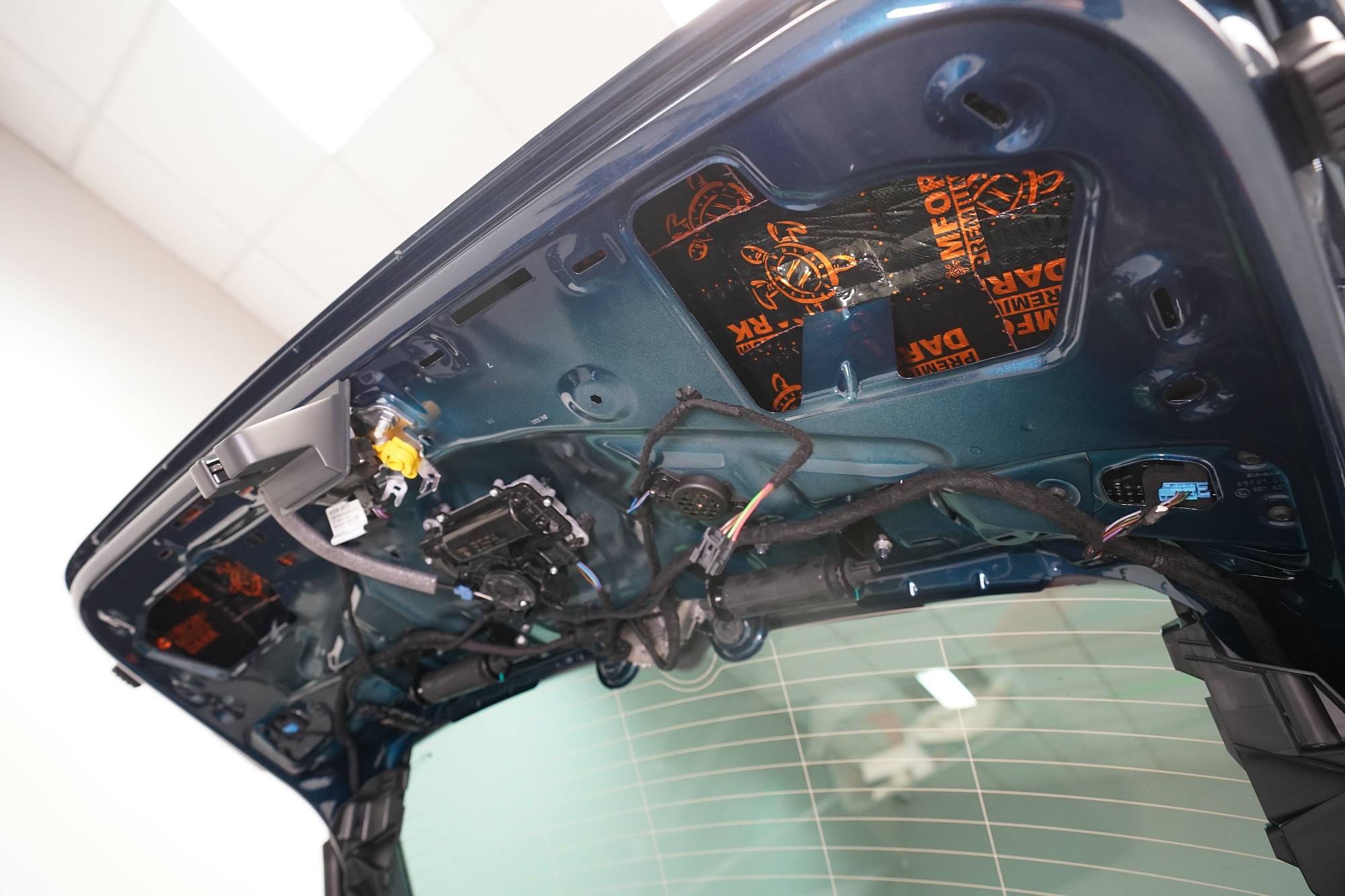 Věnujeme se samozřejmě i pátým dveřím, aby odhlučnění zavazadlového prostoru bylo kompletní. Jako první vrstvu volíme lehký antivibrační materiál Comfortmat Dark D2 o tloušťce 2,3 mm, který zamezí vibracím a nezatěžuje páté dveře zbytečnou hmotností.