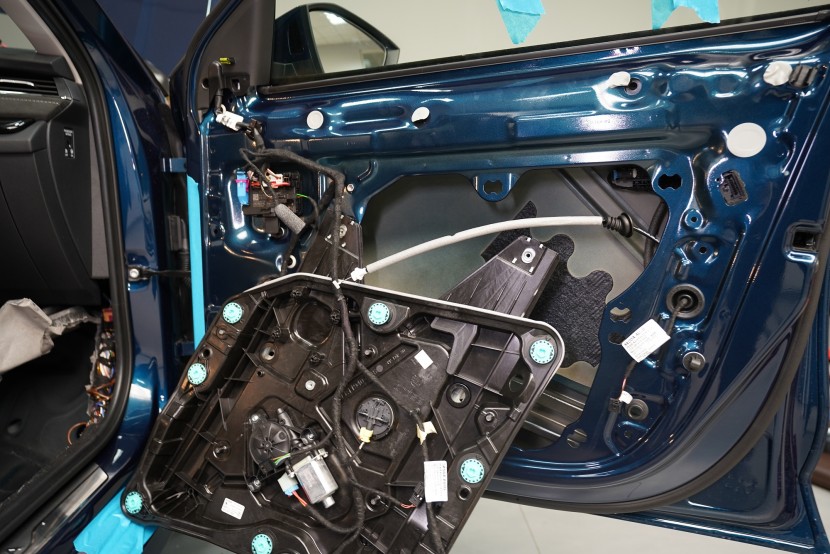 Na Vision finálně nalepíme 3 mm silný membránový materiál Comfortmat Blockator, který dle laboratorních testů je schopen zvukové izolace až 35 dB, pokud je aplikován jako třetí vrstva. Taková hodnota je již dostatečná pro zamezení výrazného hluku zejména o nízkých a středních frekvencí, který způsobují pneumatiky. Zavazadlový prostor je tedy důkladně odhlučněn materiály o celkové tloušťce až 13 mm a můžeme se pustit do odhlučnění dveří.