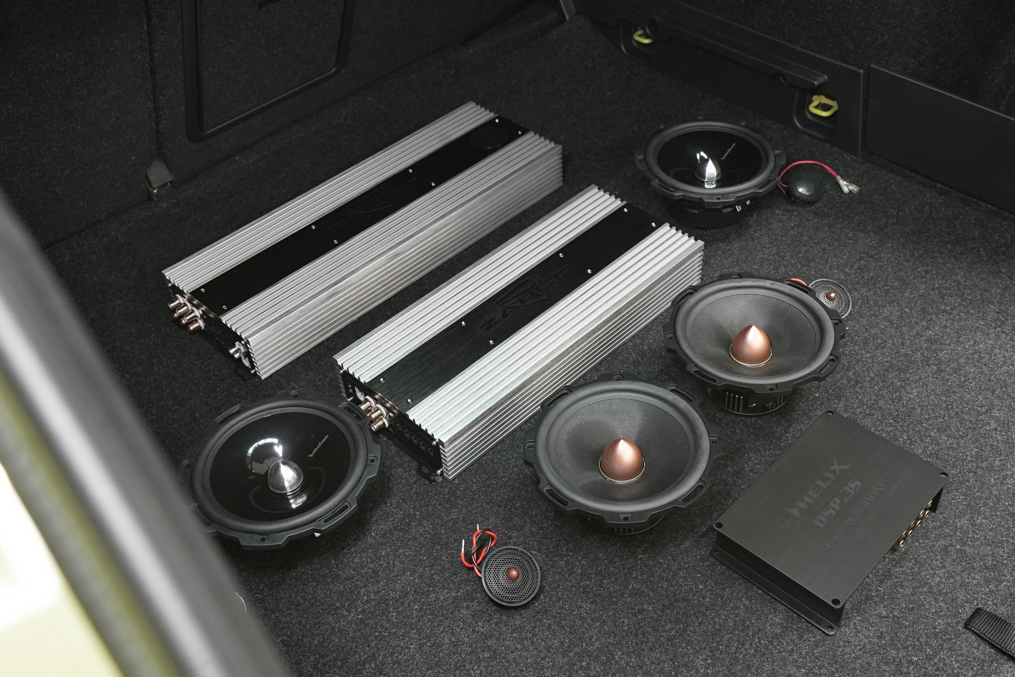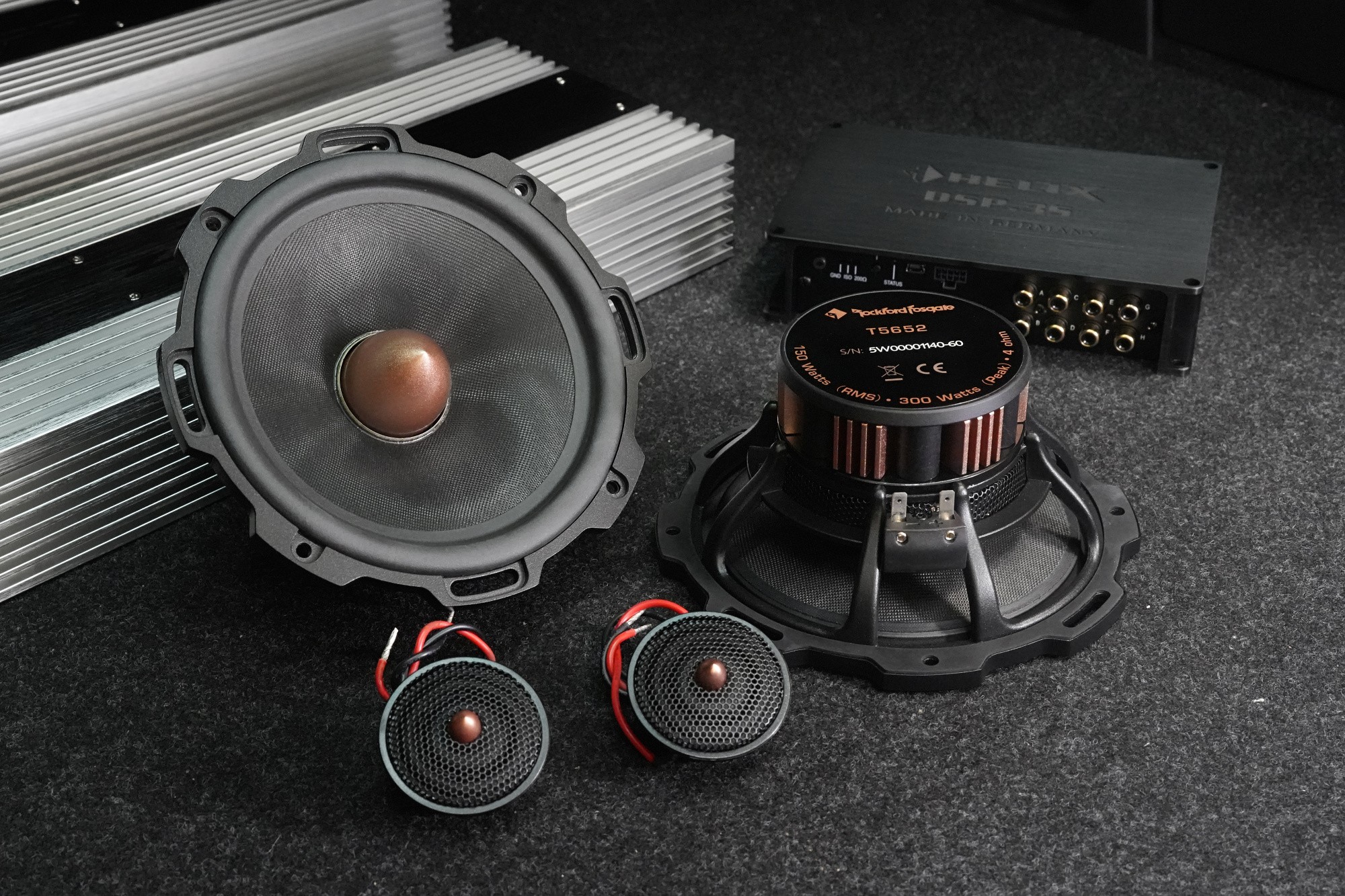 Pojďme se nejprve seznámit s produkty použitými v této zajímavé instalaci. Základem každého ozvučení jsou reproduktory, tentokrát od amerického výrobce Rockford Fosgate. A to rovnou z nejvyšší modelové řady T5! Ty logicky budeme instalovat do předních dveří a doplníme je komponenty téhož výrobce v zadních dveřích. O výkon i kvalitní zvuk se postará dvojice zesilovačů taktéž amerického výrobce Zapco a DSP procesor Helix.