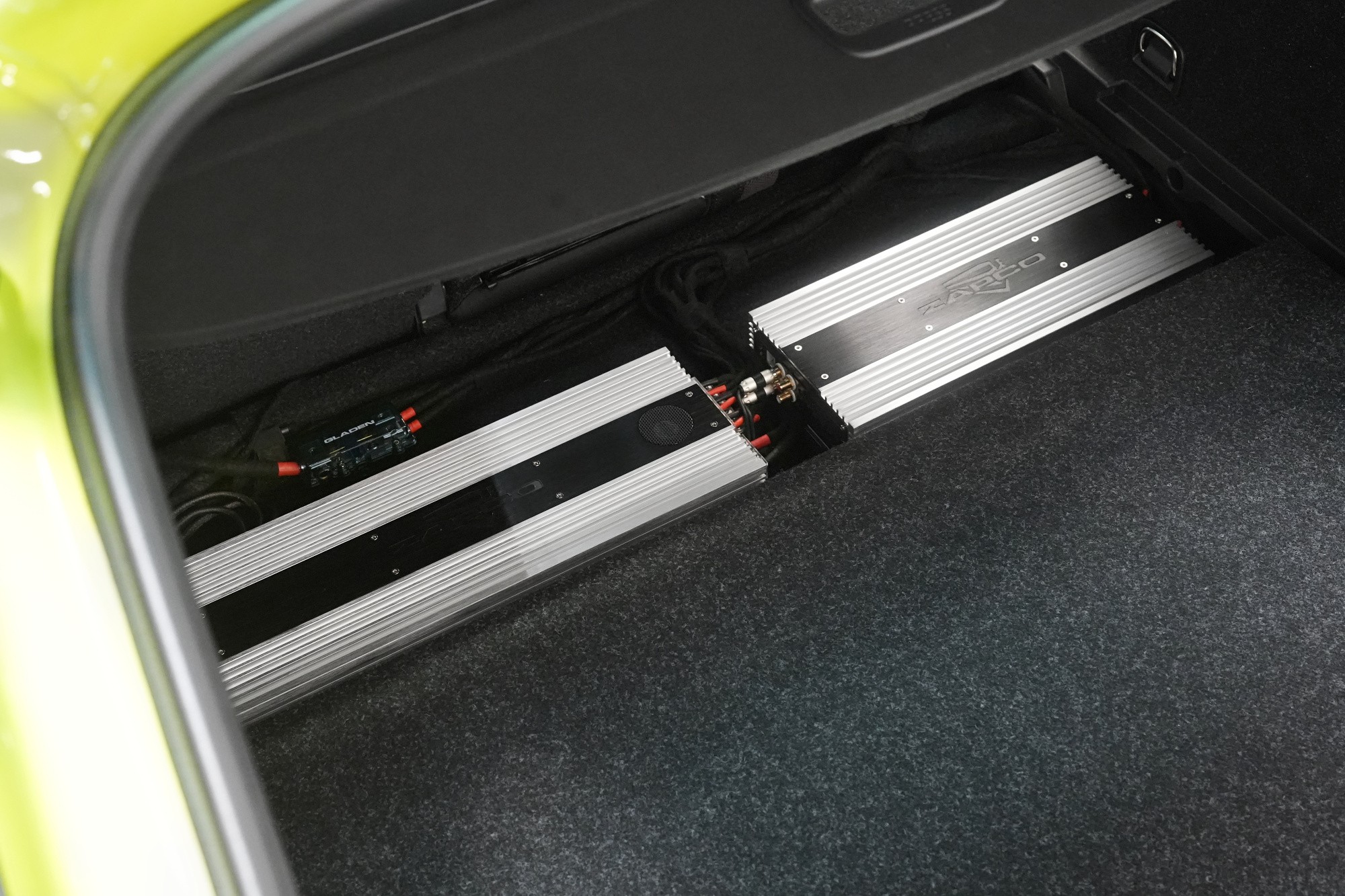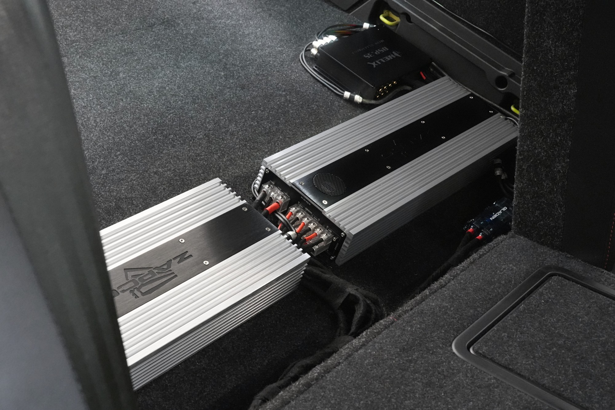Žádná kvalitní instalace se neobejde bez zesilovačů a v tomto případě i adekvátně výkonných. Pro napájení všech reproduktorů jsme zvolili 6kanálový zesilovač Zapco analogové třídy AB, jenž poskytuje reproduktorů nejen dostatečný výkon, ale i důležitou kvalitu zvuku. Zesilovač jsme doplnili digitálním monoblokem téhož výrobce a modelové řady. Vše doplněno DSP procesorem, díky kterému později naladíme zvuk.