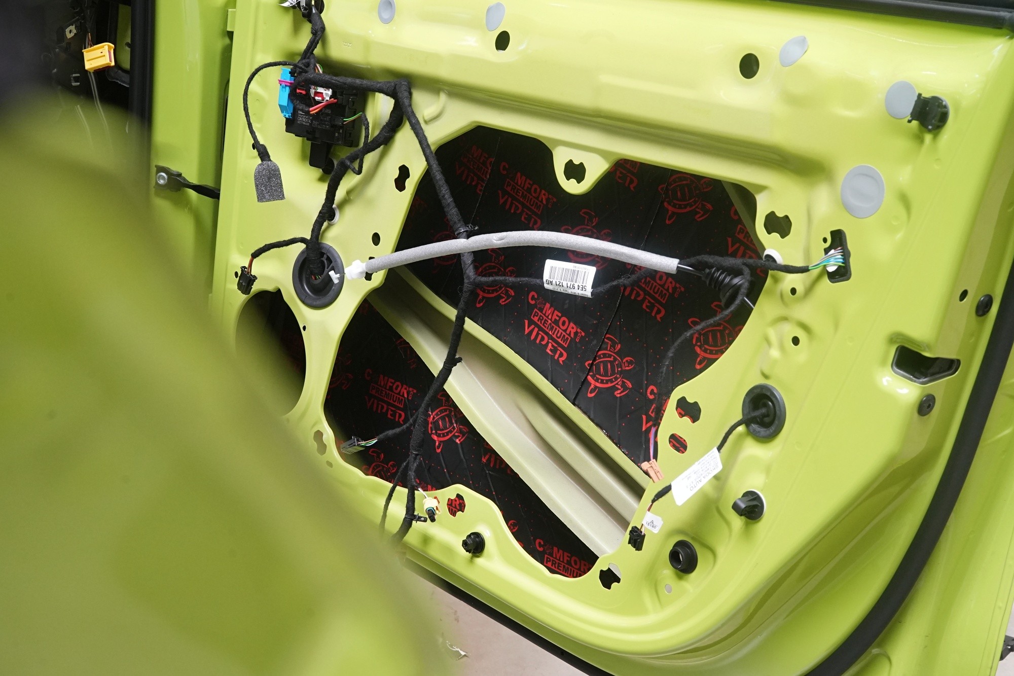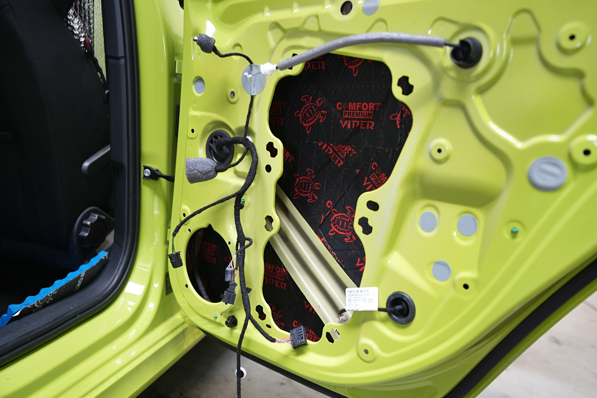 Plastové výplně dveří opatřujeme posledními dvěma vrstvami, konkrétně opět antivibračním materiálem Comfortmat Cobra a finálně materiálem pohlcujícím hluk Comfortmat Soft Wave Expert. Tato flexibilní pěna s tvarovou pamětí se lepí na plastové čalounění dveří z důvodu zamezení skřípání a vrzání nejen plastů, ale i drátů a dalších komponent uvnitř dveří a dodatečně i sníží hluk této oblasti.