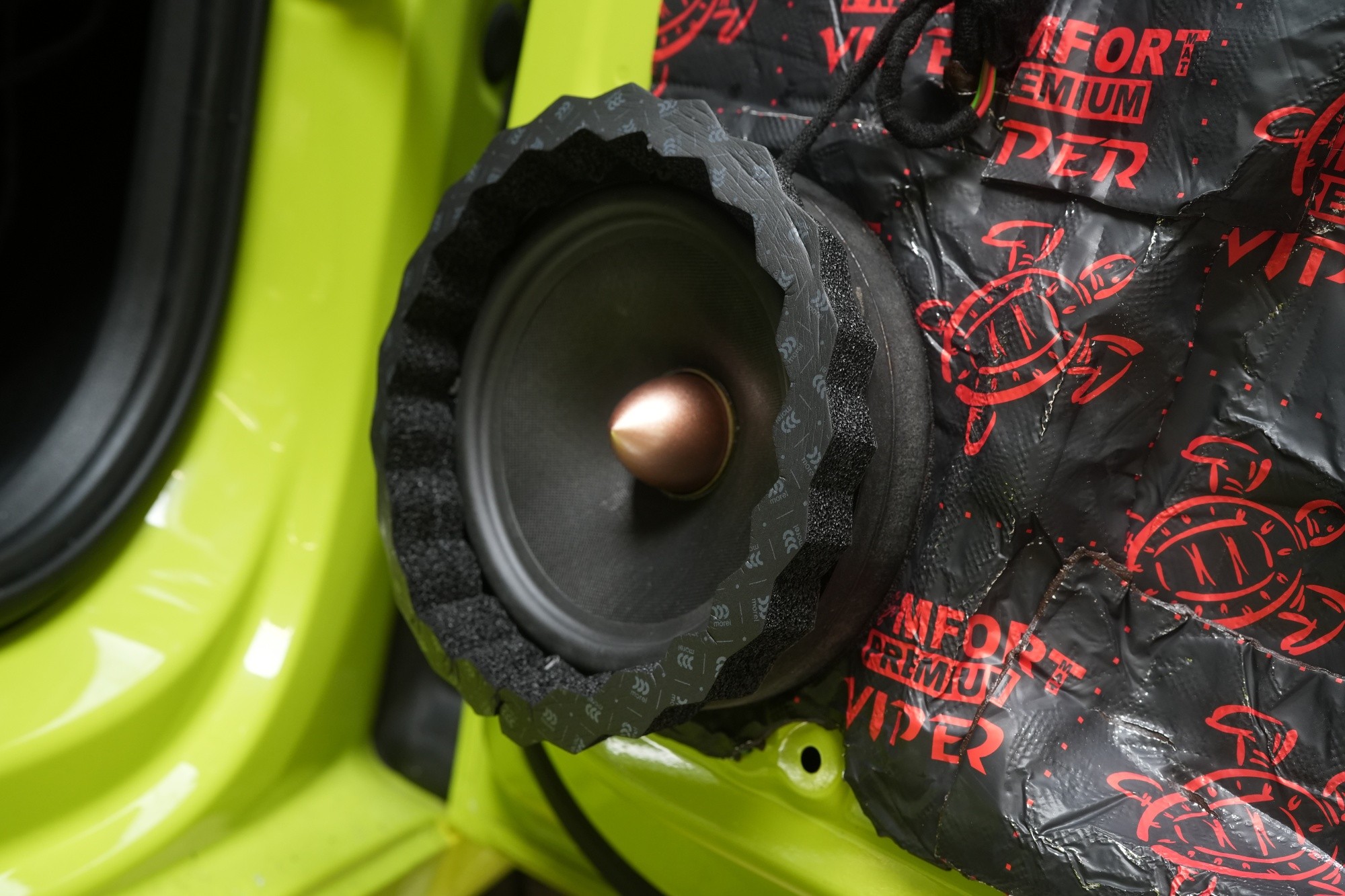 Nyní se kromě další vrstvy odhlučnění v podobě materiálu Comfortmat Viper podívejme i na krásný středobasový reproduktor. Ten na první pohled zaujme svým robustním fázovým vrchlíkem v měděné barvě, jenž zamezí fázovému posunu a poklesu středního rozsahu. Membrána vyrobená ze sendvičového materiálu na bázi polymerů tekutých krystalů vyniká zase svou lehkostí a tuhostí. Spolu s dalšími technologiemi je výsledkem velmi kvalitní zvuk a netradiční výkon středobasu.