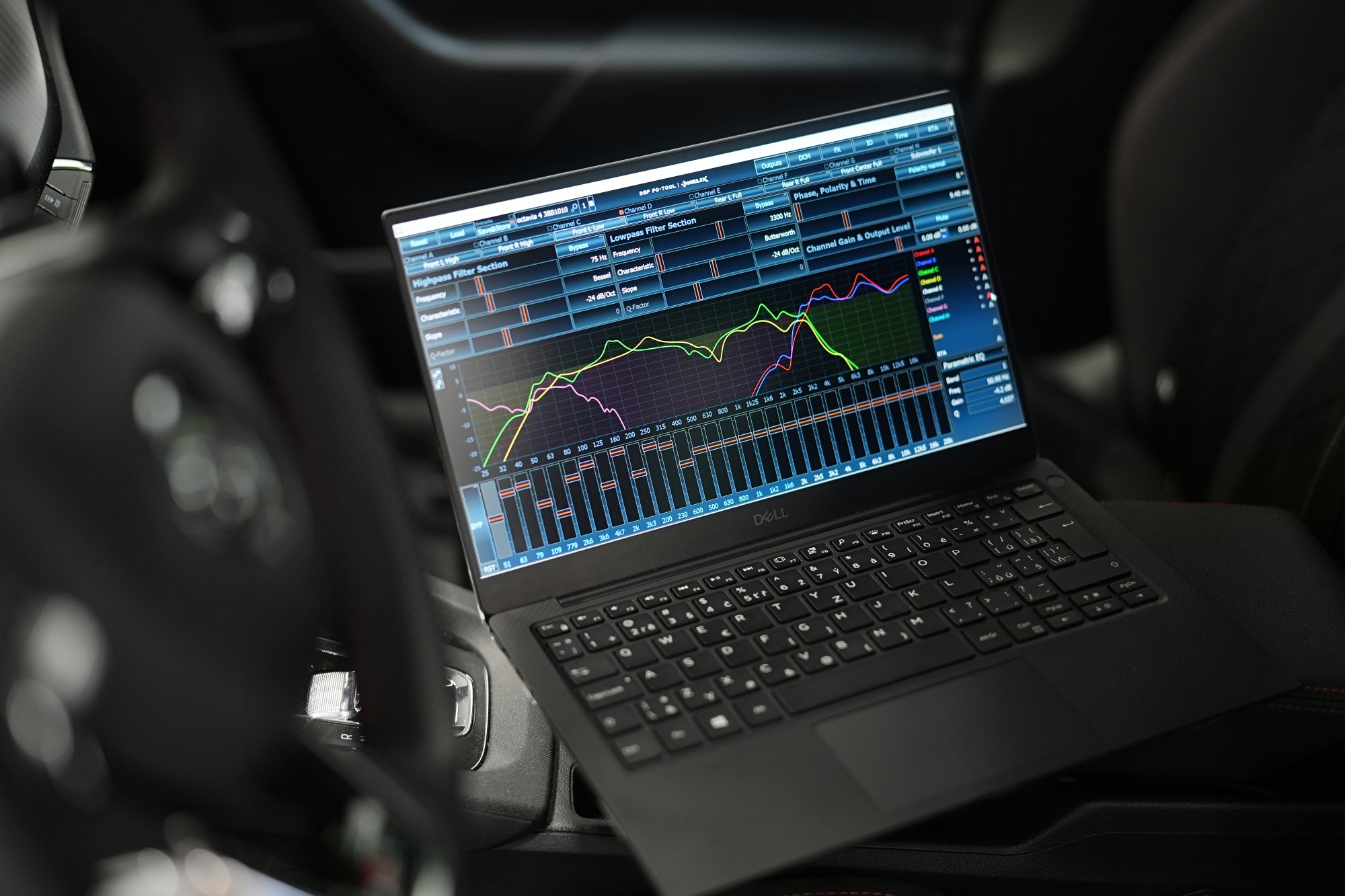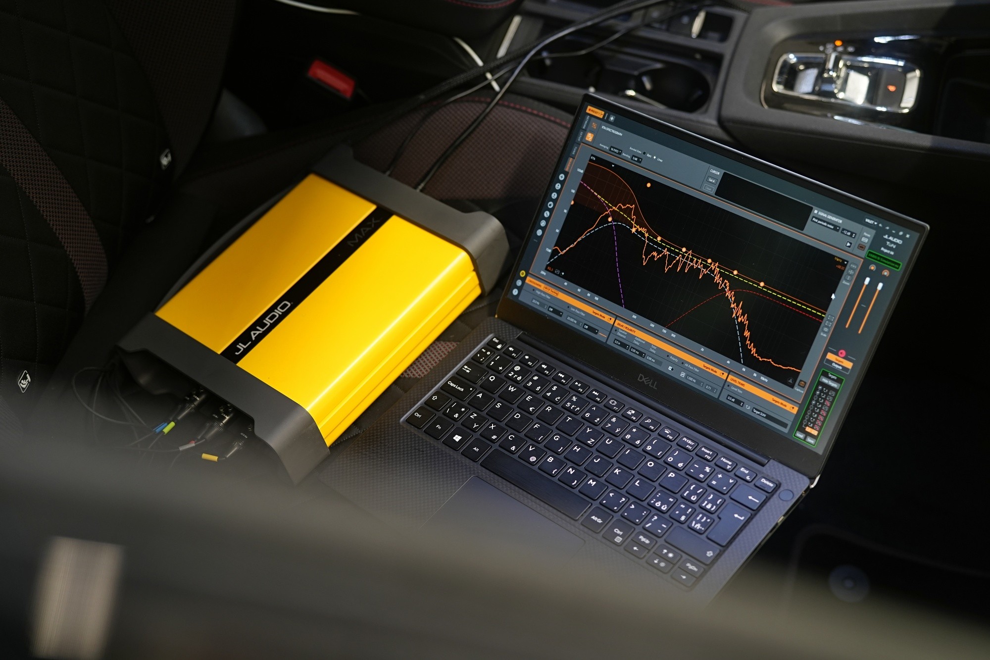 Nastává čas pro důkladné měření zvuku, které provádíme pomocí profesionálního měřícího systému JL Audio Max-Kit. Díky propracovanému systému s pěti kalibrovanými mikrofony umožní JL Audio Max-Kit s maximální přesností změřit frekvenční odezvu a fázi reproduktorů, zpoždění signálu i továrně nastavený zvuk. Právě správné nastavení zpoždění signálu (časových korekcí) patří k nejdůležitějším parametrům ozvučení vozu.