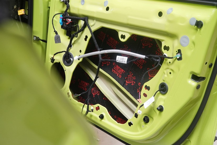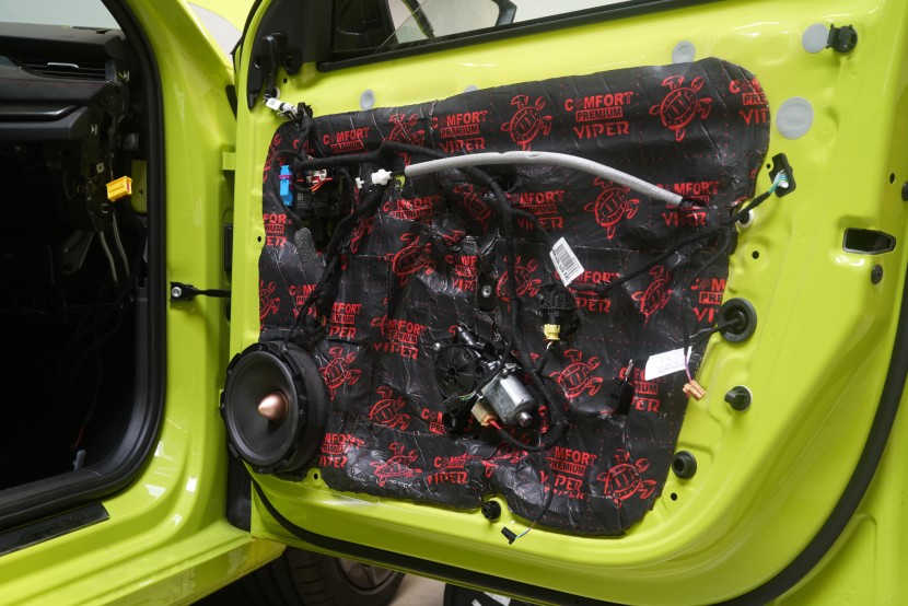 Pokračujeme instalací reproduktorů. Nejprve však aplikujeme antivibrační materiál na vnější plech dveří, konkrétně Comfortmat Viper o tloušťce 3 mm. Ten pohltí silné vibrace od reproduktorů a zpevní tenký plech dveří. Viper s akustickým ztrátovým činitelem 0,49 jednotek se pyšní nejlepším poměrem účinnosti a nízké hmotnosti na trhu a je optimálním řešením pro instalaci velmi výkonných reproduktorů. Materiál je samozřejmě voděodolný a má mimo jiné antikorozní vlastnosti.