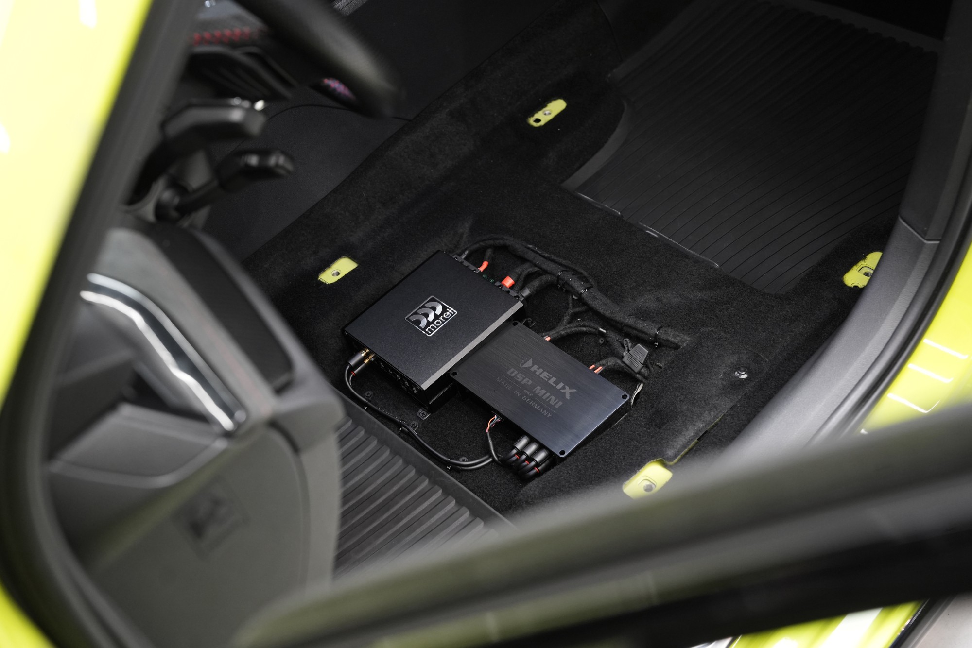 Pod sedačkou řidiče našly své místo DSP procesor Helix DSP Mini a kompaktní monoblok Morel řady MPD určený pro subwoofer. Tento způsob instalace ukazuje hlavní výhodu jednotlivých zařízení – samostatný DSP procesor i monoblok dokážou nabídnout daleko vyšší kvalitu zvuku než multikanálový zesilovač s integrovaným DSP. A to zejména v případě monobloku, který zajišťuje perfektní kontrolu, napájení a zvuk pro subwoofer.Helix díky kvalitním vnitřním součástkám umožňuje precizní nastavení celého systému, a to s maximální věrností a minimálním šumem. Samostatný monoblok pak představuje ideální řešení pro napájení subwooferu – oproti vícekanálovým zesilovačům má specializovanou konstrukci, která zajišťuje vyšší výkon, lepší kontrolu a menší zkreslení při reprodukci nejnižších frekvencí. Výsledkem je pevný, přesný a dynamický bas, který plynule navazuje na zbytek systému.