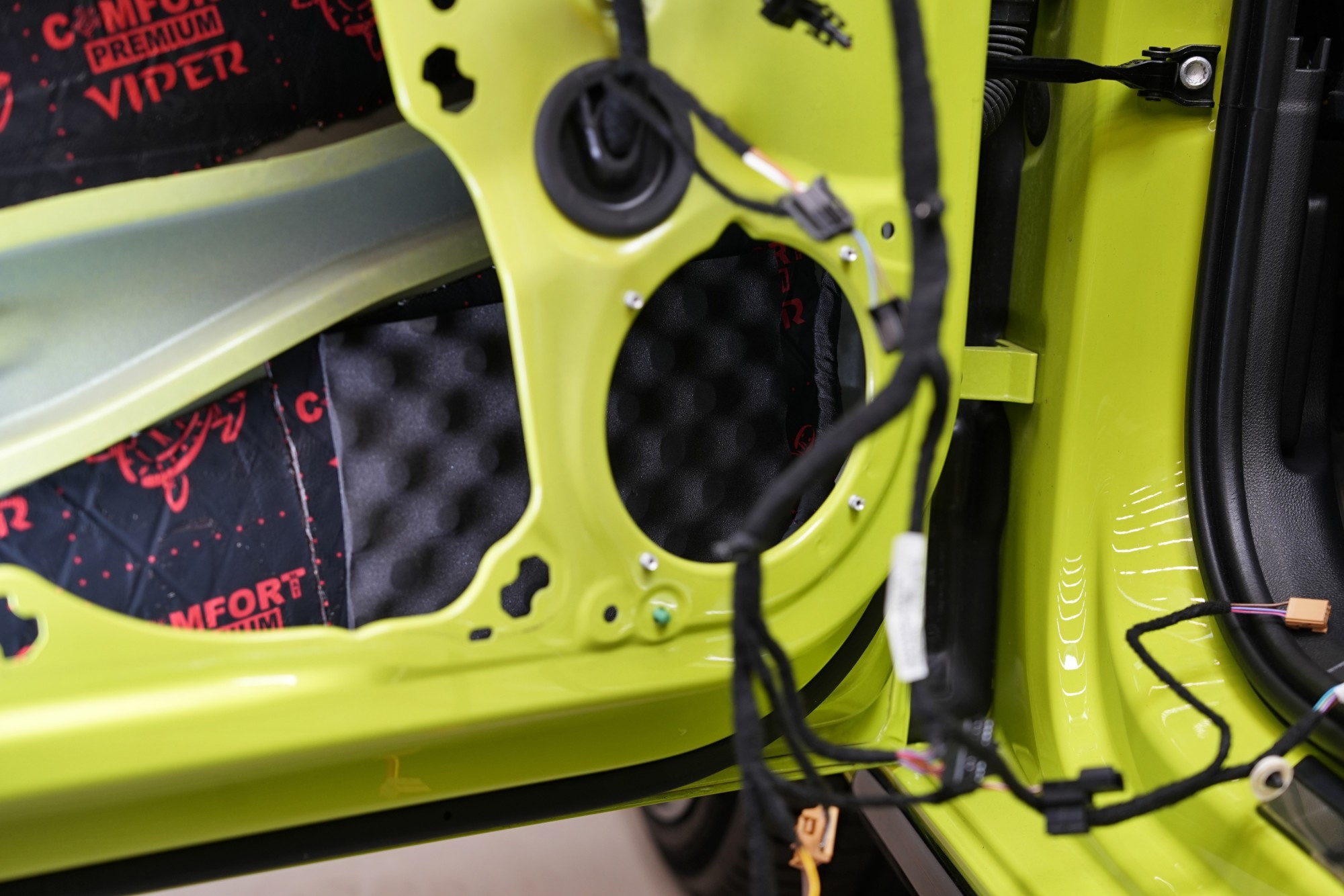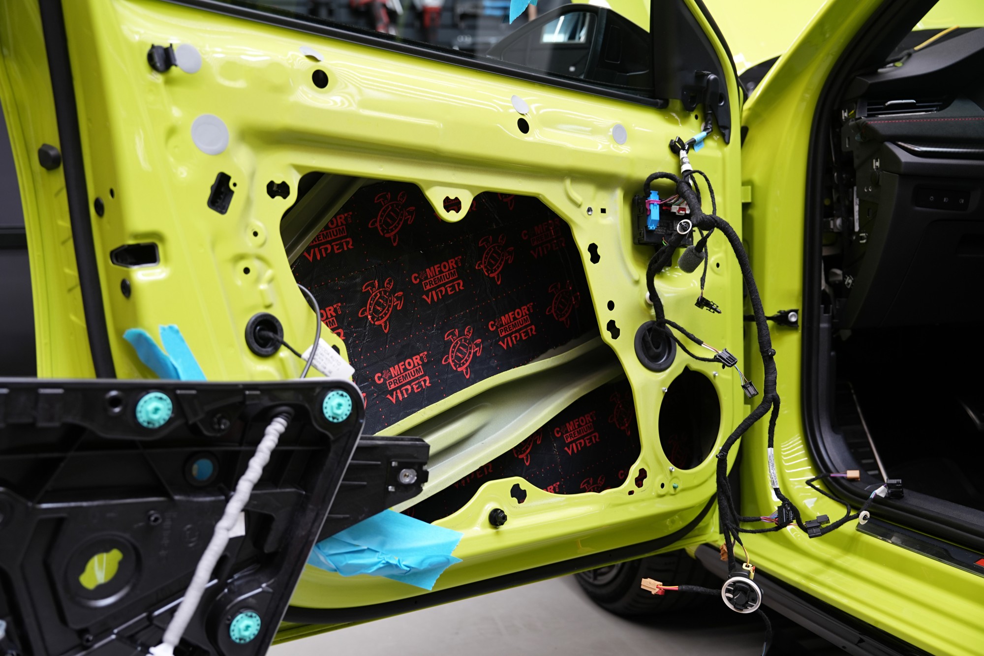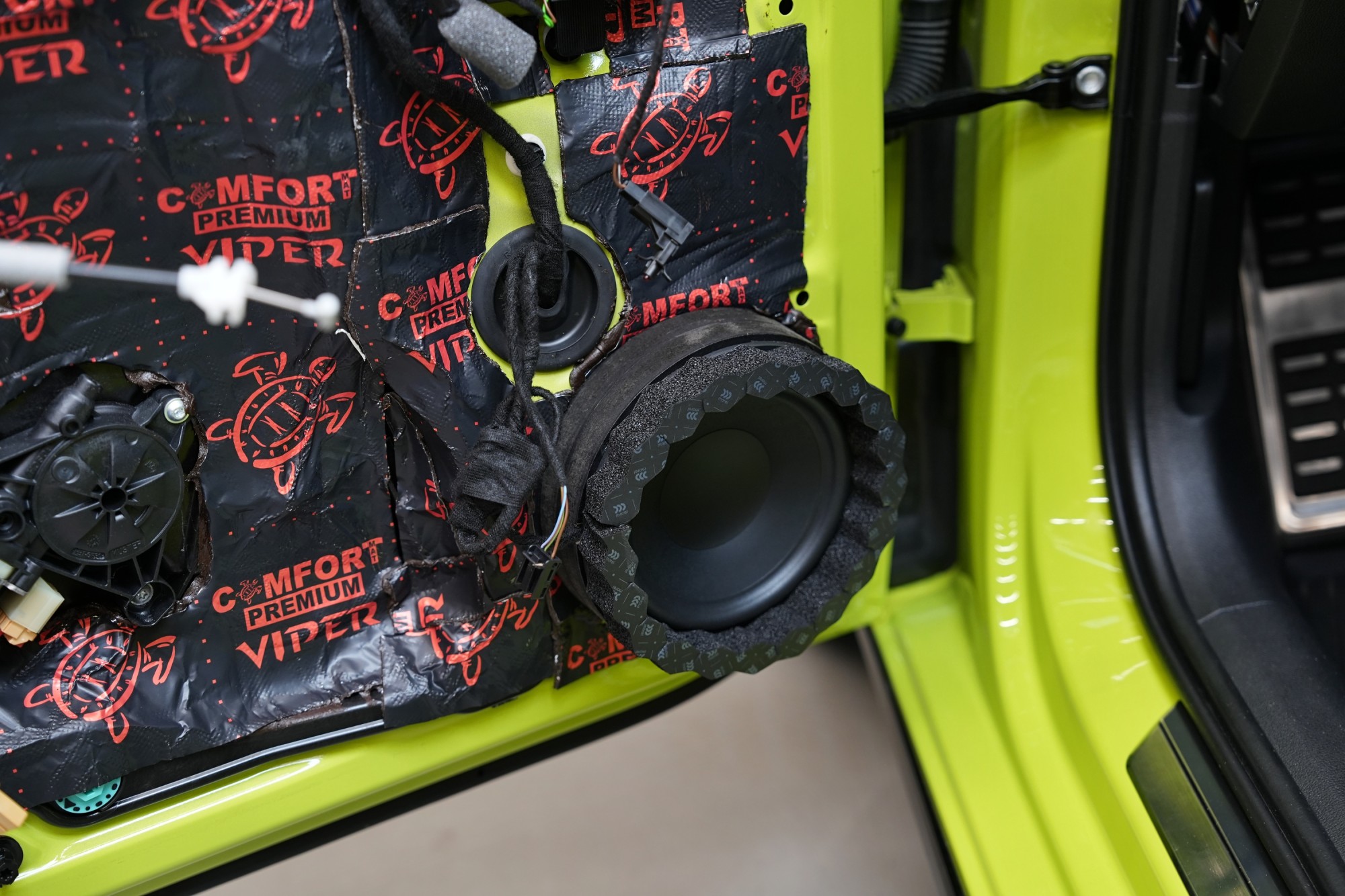 Abychom zaručili optimální akustické podmínky pro reproduktory, dveře jsme důkladně vytlumili. Z důvodu instalace výkonných reproduktorů volíme prémiový antivibrační materiál na vnější plech dveří, konkrétně Comfortmat Viper o tloušťce 3 mm s velmi nízkou hmotností. Ten zlikviduje vibrace, zamezí pronikání nízkofrekvenčního hluku a zpevní velmi tenký plech dveří.