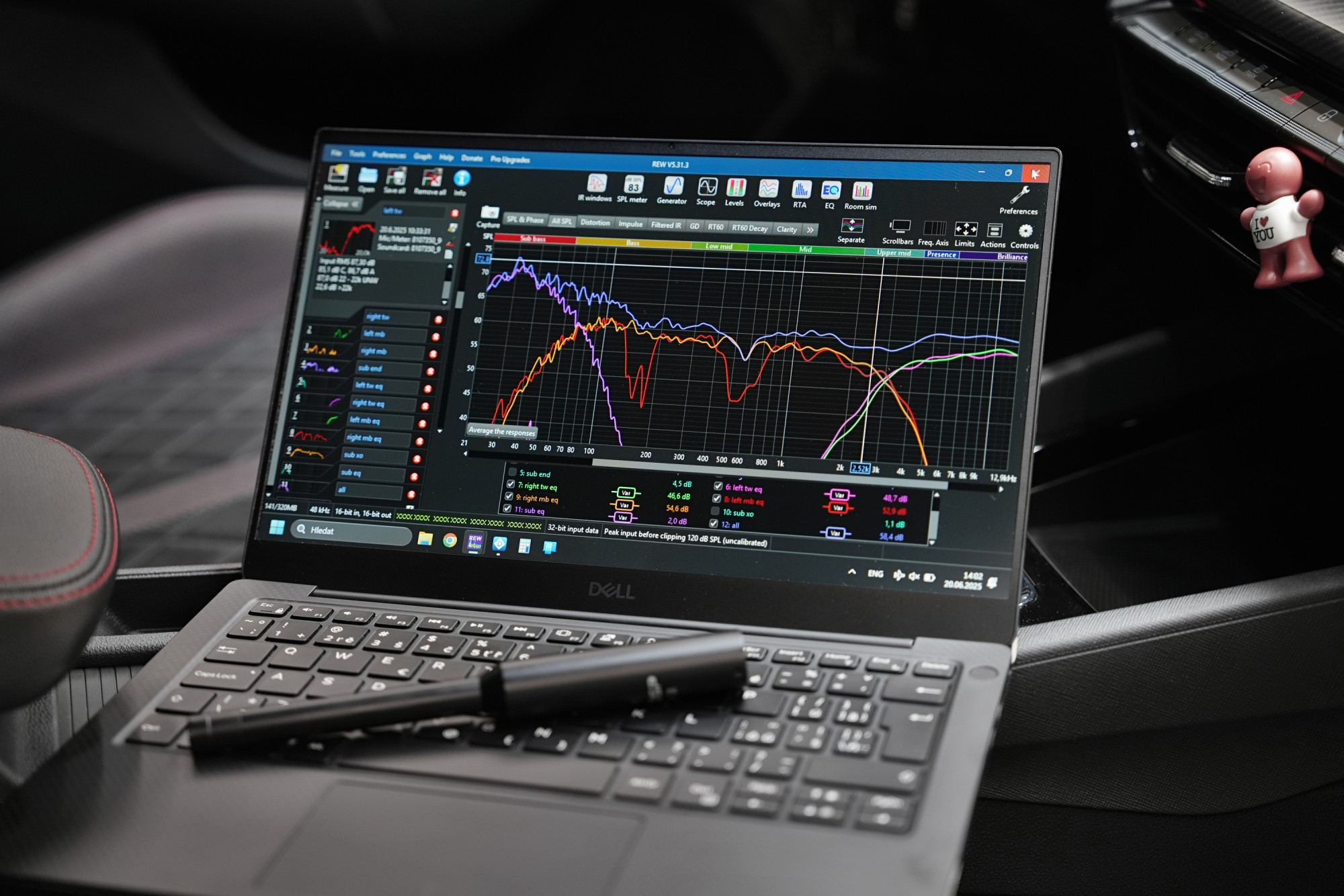 Na poslední fotografii je zobrazeno 5 různých měření v jednom grafu – konkrétně 2x výškové, 2x středobasové reproduktory a subwoofer. Klíčové je, aby levá a pravá strana vozu byly akusticky co nejvíce vyrovnané. Finální měření po správném nastavení časových korekcí a zfázování všech reproduktorů navíc umožní doplnit případné mezery ve frekvenční charakteristice v oblasti výhybek. Výsledkem je pak co nejlineárnější frekvenční odezva celého systému.