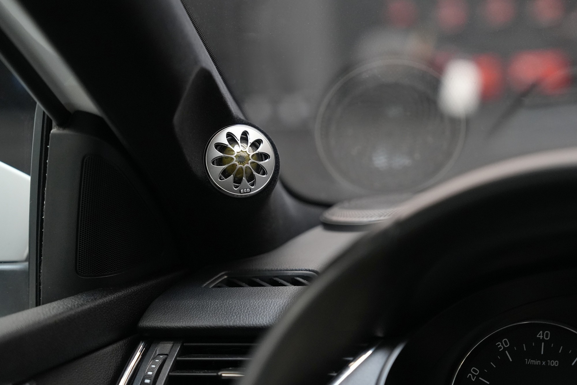 Výškový reproduktor ESB 9000 zaujme na první pohled svým charakteristickým „květinovým“ designem ochranné mřížky. Tento luxusní vzhled však nevznikl jen z estetických důvodů – tvar mřížky a přední části reproduktoru je navržen tak, aby minimalizoval akustické lomy na okrajích, snížil nežádoucí odrazy od skel a zlepšil vyzařování do stran. Výsledkem je širší poslechový úhel, lepší prostorovost a přirozenější podání výškového pásma. Zakázkově vyrobený A-sloupek umožňuje přesné směrování výškového reproduktoru na poslechovou pozici, což je zásadní pro správnou lokalizaci a výslednou scénu. Zároveň je tvar i povrchová úprava navržena tak, aby přirozeně zapadla do interiéru vozu a působila jako jeho originální součást.