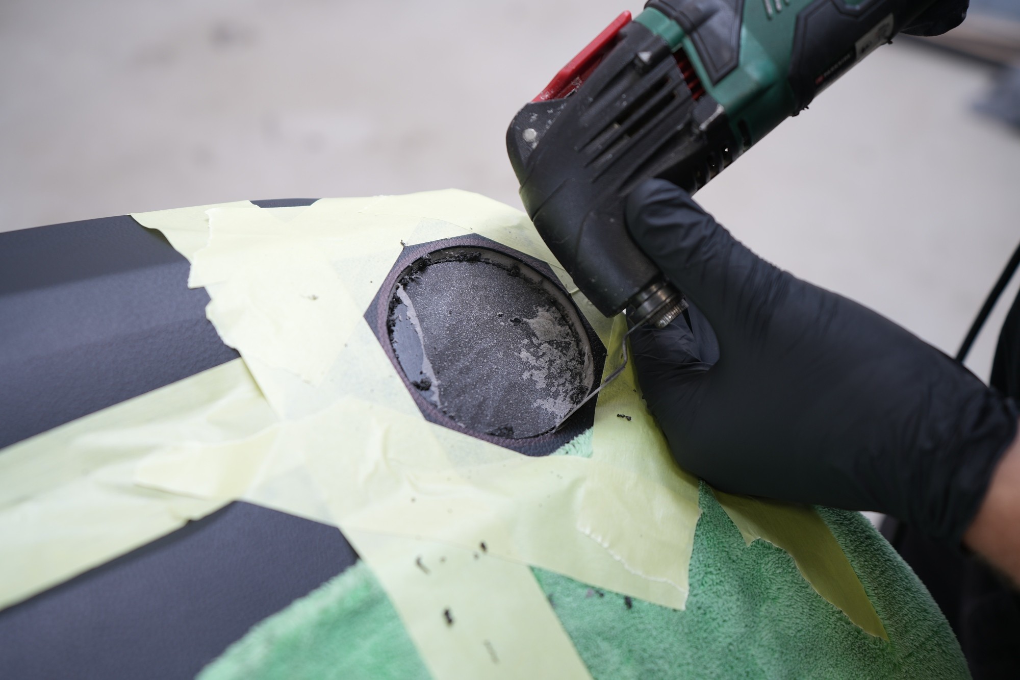 Příprava palubní desky pro instalaci středového reproduktoru. Nejprve určujeme ideální pozici středového reproduktoru s ohledem na akustiku a návaznost na ostatní pásma. Následně je přesně vyříznut otvor a palubní deska je z vnitřní strany důkladně vytlumena, aby nedocházelo k přenosu vibrací a nežádoucím rezonancím. Teprve poté je reproduktor pevně usazen, což je klíčové pro čistou, stabilní a přesnou reprodukci středního pásma.