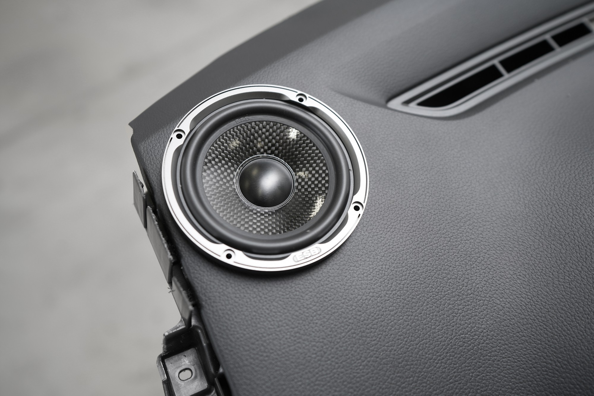 Středový reproduktor ESB 9000 již usazený v palubní desce, zatím bez finální ochranné mřížky. Ta bude následně lakována z původní stříbrné do černé barvy, aby byla dosažena co nejlepší vizuální integrace s tmavým interiérem vozu. V této fázi je však alespoň možné naplno vyniknout krásné karbonové membráně reproduktoru, která je nejen vizuálně působivá, ale zároveň přispívá k přesnému zvukovému projevu.