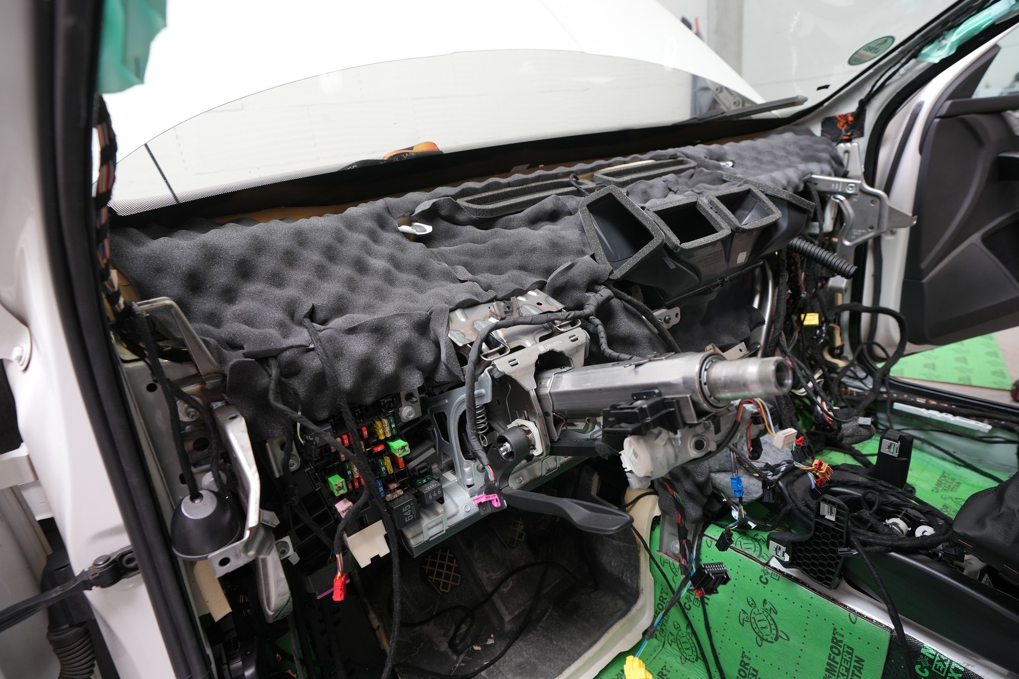 Vzhledem k tomu, že byla palubní deska kompletně demontována kvůli instalaci středových reproduktorů, využili jsme této příležitosti také k jejímu odhlučnění. Odhlučnění palubní desky má výrazný přínos zejména v oblasti snížení hluku od motoru a mechanických vibrací, což se pozitivně projeví nejen při jízdě, ale i při poslechu hudby v nižších hlasitostech. Interiér díky tomu působí klidnějším a dospělejším dojmem, což je u kvalitního audio systému zásadní.