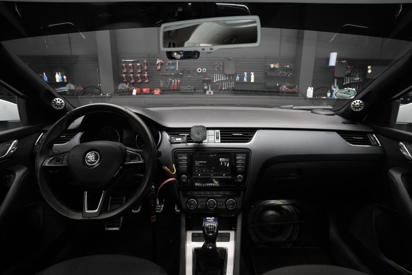 Pohled na kabinu ze zadního prostoru naznačuje výhody takového řešení. Můžete si všimnout lokace výškových reproduktorů, které jsou směrovány do středu mezi opěrky sedadel. Tím zvuk reproduktorů perfektně připravíme na další fázi v podobě měření frekvenční odezvy a následného naladění na DSP procesoru. Díky tomu získáme dokonale lineární frekvenční odezvu reproduktorů, která je cílem každé podobné instalace.