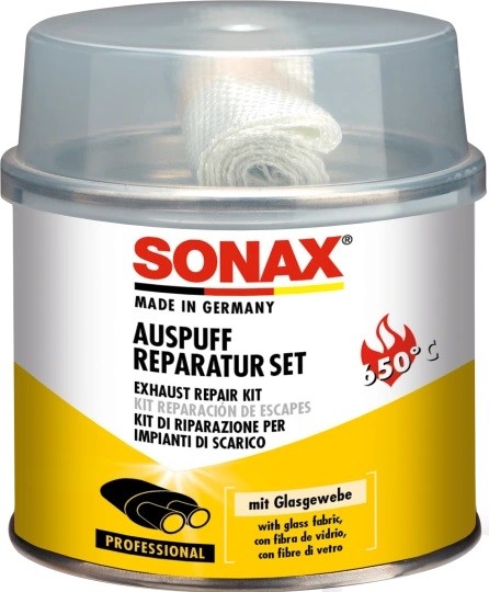 Sonax opravná sada na výfuky se skládá z pasty na opravu výfukového systému a žáruvzdorné textilní pásky ze skelného hedvábí. Trhlinky, otvory a netěsnící místa ve výfukovém systému uzavírá trvale, rychle a absolutně plynotěsně. Přípravek neobsahuje azbest a je extrémně žáruvzdorný.