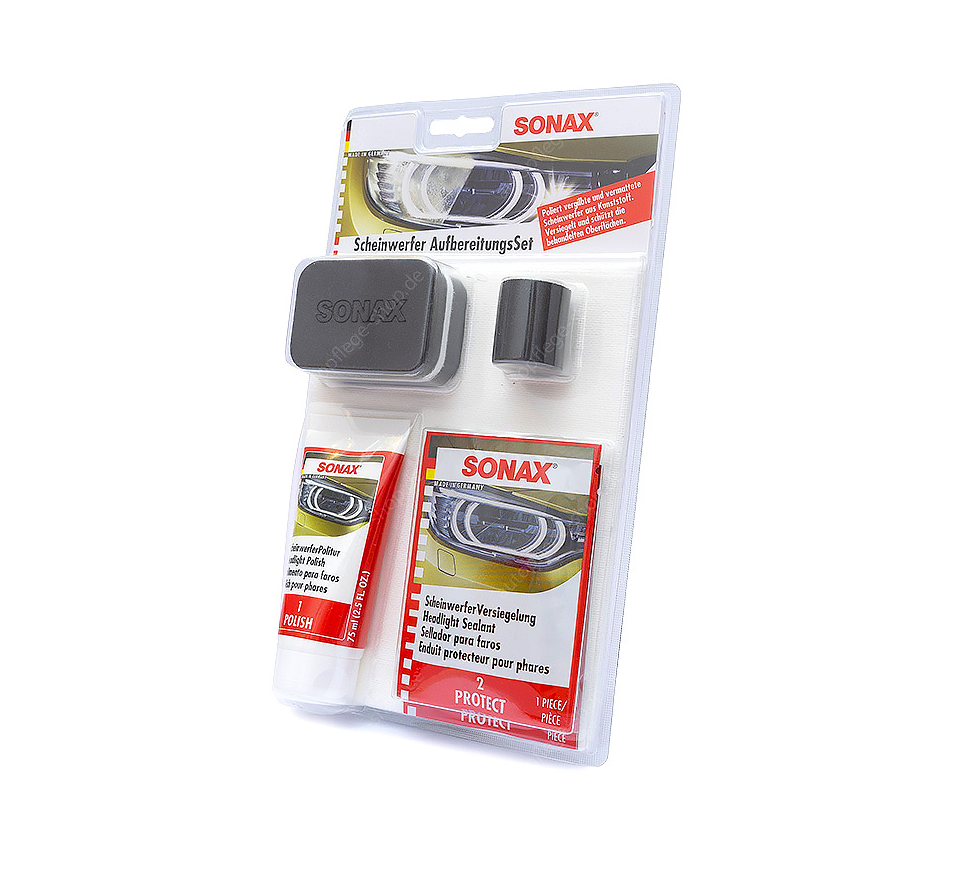 - Obsahuje: 75 ml brusnou pastu na světlomety SONAX, 2 x 5 ml tmelu na světlomety SONAX, 2 lešticí houbičky, 1 brusný blok, 8 brusných kotoučů (zrnitost 3000), 8 brusných podložek (zrnitost 5000), 6 lešticích utěrek