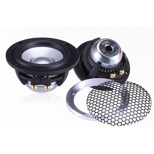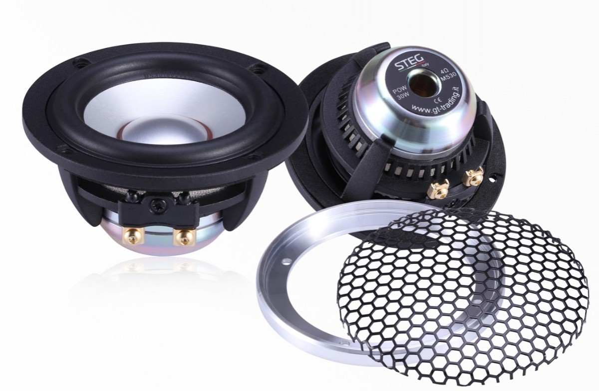 High-endové středové reproduktory značky STEG ručně vyrobené v Itálii. Hliníková ochranná mřížka je součástí balení.