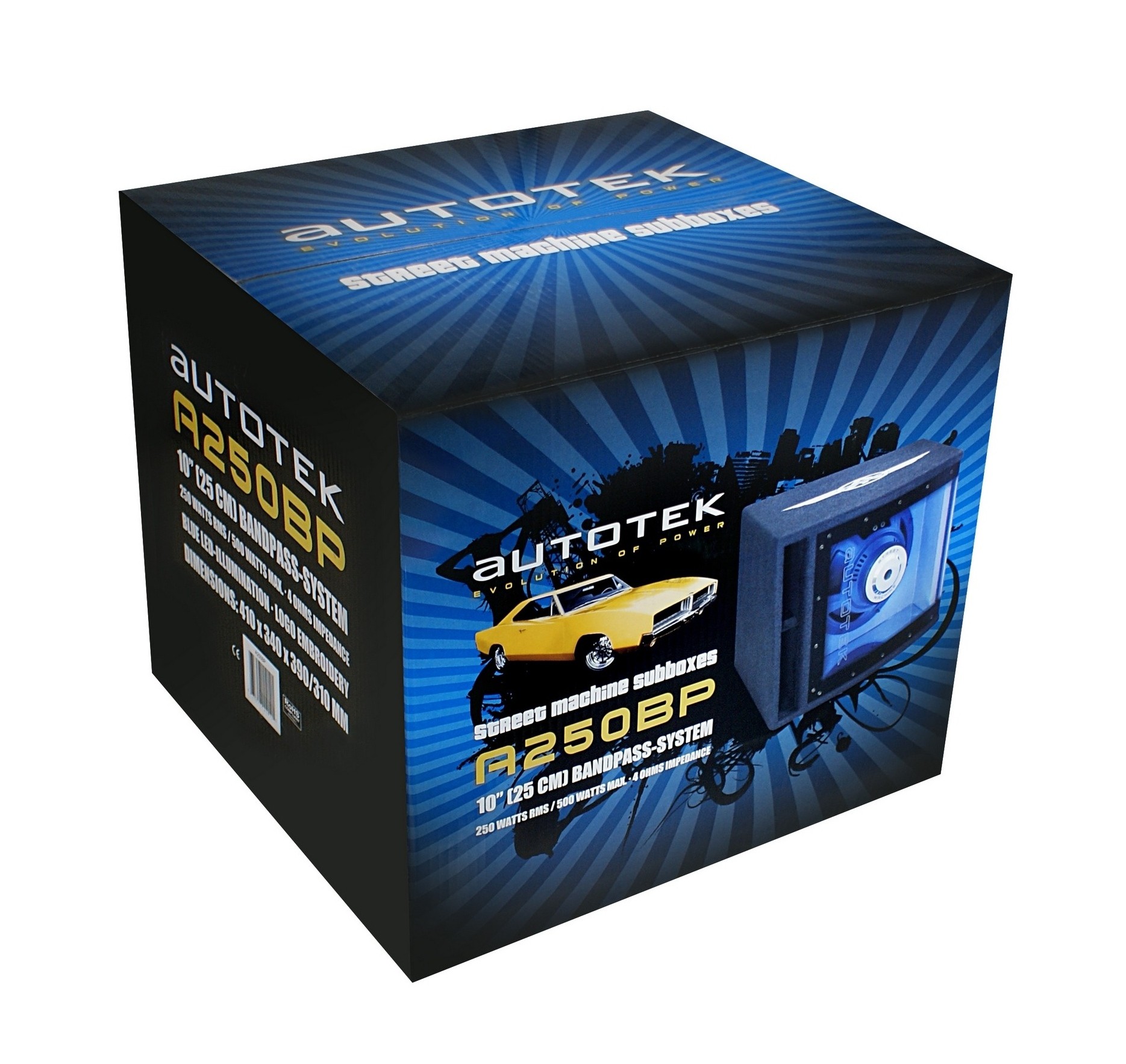 Autotek A250BP je kompaktní subwoofer v bandpass ozvučnici, navržený pro uživatele, kteří chtějí výrazné basové oživení systému bez složité instalace a ladění. Uvnitř ozvučnice pracuje 25 cm subwoofer s 50 mm kmitací cívkou, který je optimalizovaný pro vyšší akustický tlak v omezeném prostoru. Bandpass konstrukce zajišťuje důraznější a „tvrdší“ basový projev, který je dobře čitelný i v hlučnějším interiéru auta. Skříň je potažená kvalitním kobercem s vyšívaným logem a čelní strana je doplněná průhledným panelem s modrým LED podsvícením, které zvýrazňuje samotný subwoofer s chromovanou pólovou deskou. Díky kompaktním rozměrům je A250BP vhodný především do zavazadlových prostorů menších a středních vozů, kde nabídne výrazný basový efekt bez nároků na velký objem ozvučnice.