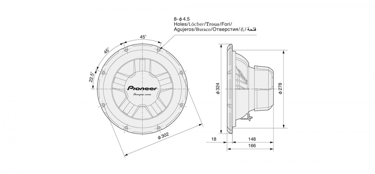 | Průměr subwooferuPrůměr subwooferu je uváděn na šroubovací díry. Celkový vnější průměr subwooferu je obvykle o 1-2 cm širší, dle rozměrové kategorie subwooferu. U 30-ti cm subwooferu je vnější průměr vč. ochranné gumy 31,8 cm a u 25-ti cm subwooferu je to 26,5 cm vč. ochranné gumy. | 300 mm (12") |