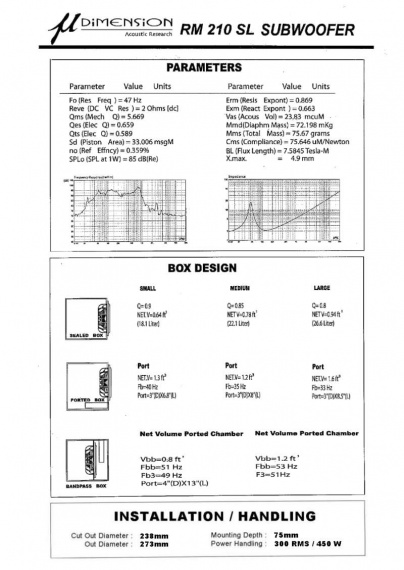 | Fs - rezonanční frekvenceFs - je spodní rezonanční kmitočet. Tento parametr je de facto volný vzduch rezonanční frekvence subwooferu. Jednoduše řečeno, je to bod, ve kterém se hmotnost pohybujících se částí subwooferu vyrovnává síle suspenze subwooferu, když je v pohybu. Pokud jste někdy viděli kousek provázku, který začal nekontrolovatelně broukat ve větru, viděli jste efekt dosažení rezonanční frekvence. Hmotnost pohyblivých částí a tuhost odpružení (surround a spider) jsou klíčovými prvky, které mají vliv na rezonanční frekvenci. Jako obecné pravidlo platí, že nižší Fs označuje subwoofer, který by byl pro reprodukci nízkých frekvencí lépší než subwoofer s vyšší Fs. Není tomu tak ale vždy, jelikož do výsledného zvuku vstupují pak i další důležité parametry subwooferu. | 47 Hz |