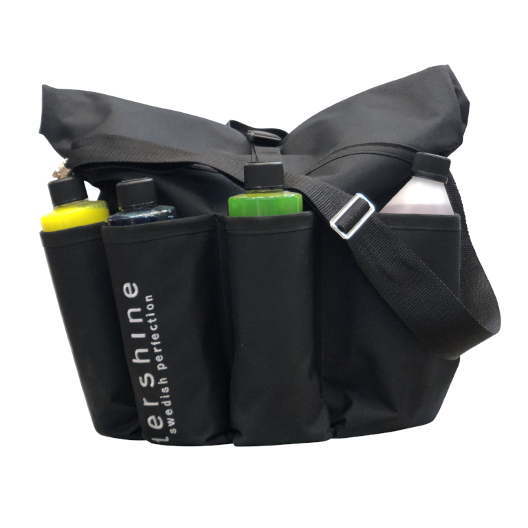 Tershine Detailing Bag je úžasná univerzální taška se spoustou místa na přípravky Tershine. Vysoká kvalita, zakázková výroba dle náročných požadavků Tershine. Taška má šest přihrádek na vnější straně pro 500ml lahve, dvě velké přihrádky na 1litrové lahve, kartáče atd. Suchý zip na zadní straně je praktický pomocník pro upevnění v kufru automobilu, součástí je také ramenní popruh.