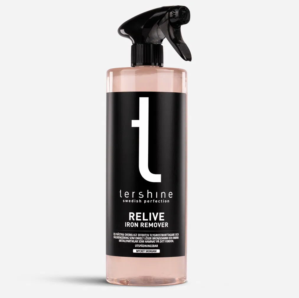 Tershine Relive - Iron Fallout je čistič kol a laku od polétavé rzi s neuvěřitelnou účinností, který během několika minut rozpustí veškerou polétavou rez z laku a kol. Přípravek je pH neutrální a bez kyselin, což znamená, že pracujete s šetrným čističem, který lze použít na téměř všechny povrchy, včetně plastů a kovů nebo na leštěném povrchu. Má nízkou viskozitu, produkt je tak možné nanášet maximálně rovnoměrně na povrch a tím dosáhnout rovnoměrného odstranění brzdového prachu a polétavé rzi. Má také skvělé čisticí vlastnosti a umí současně lehce odstranit běžné nečistoty, dokonce i zbytky hmyzu na přední části vozidla. Jakmile je produkt připraven k opláchnutí, změní se barva na fialovou, obvykle to trvá 1 až 3 min. po aplikaci.