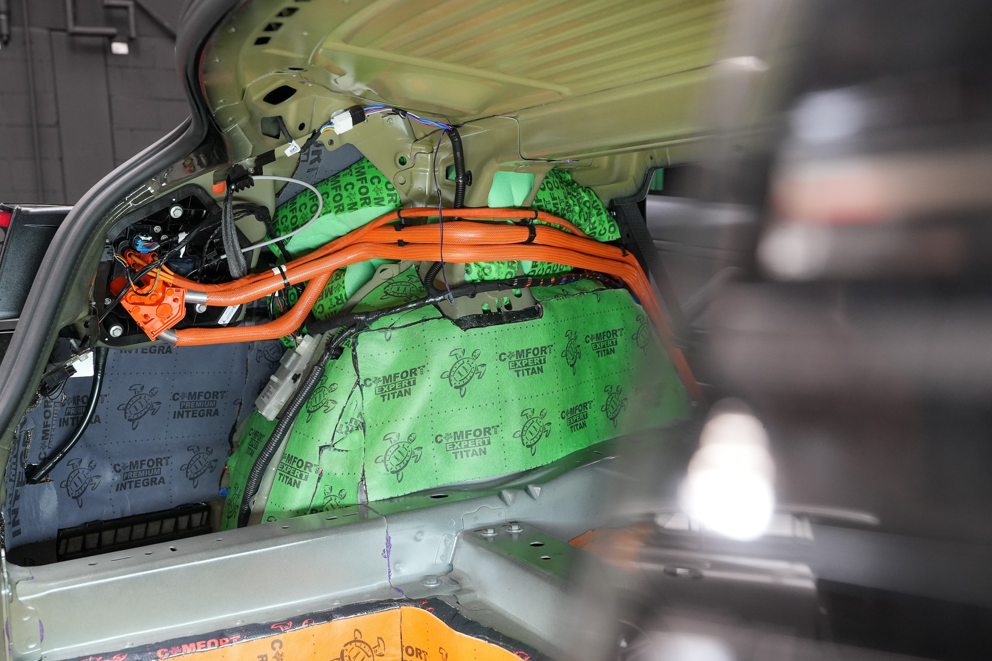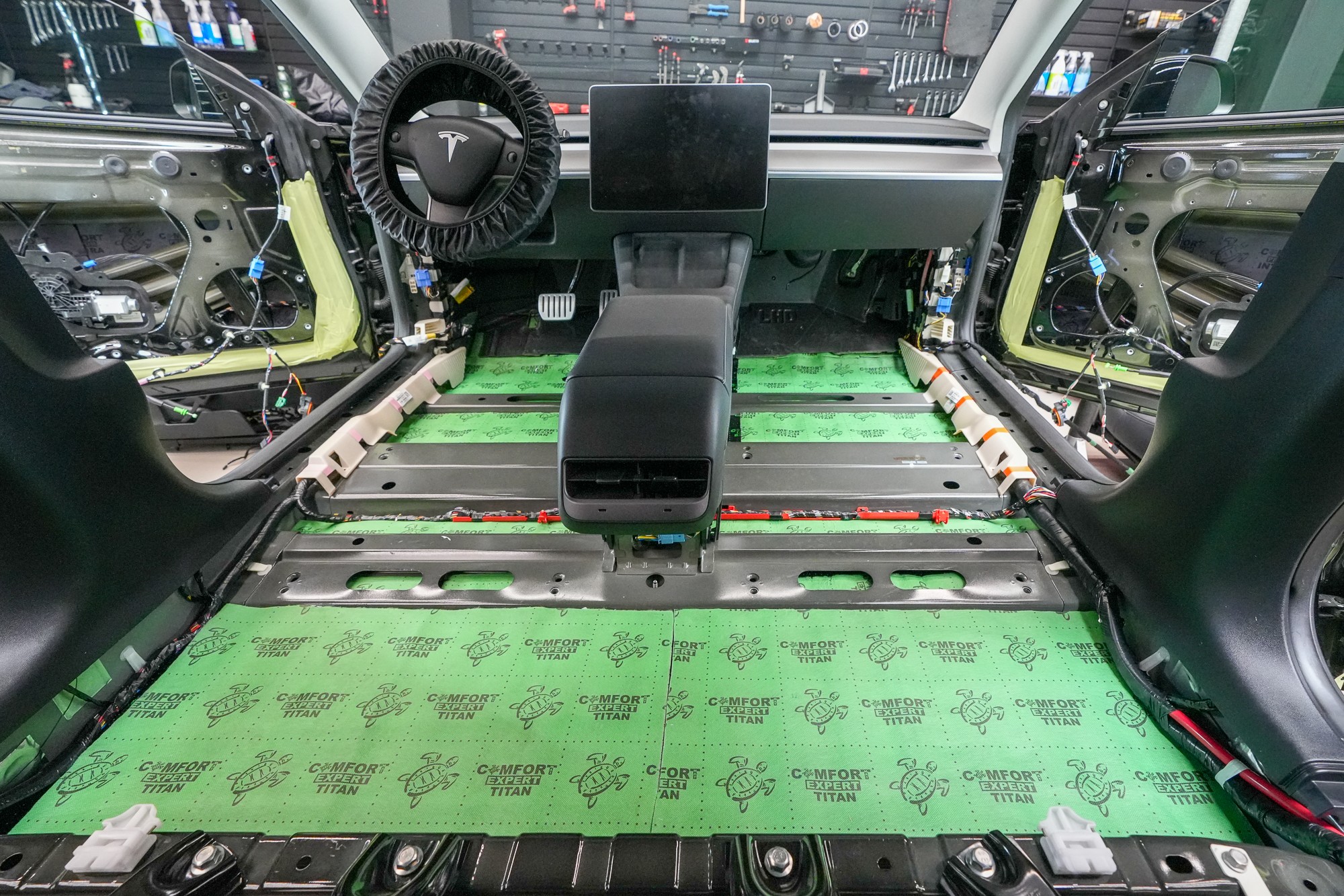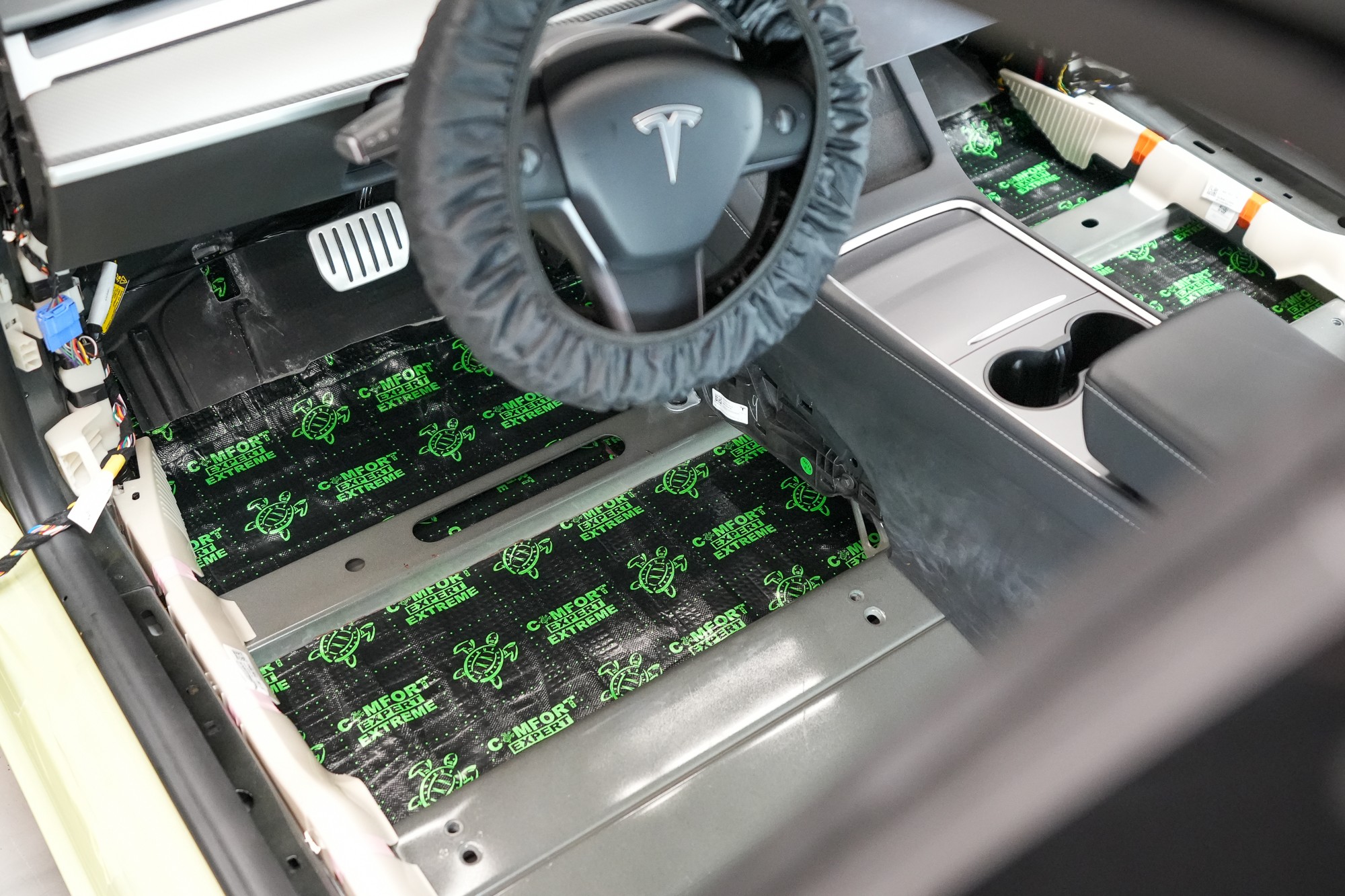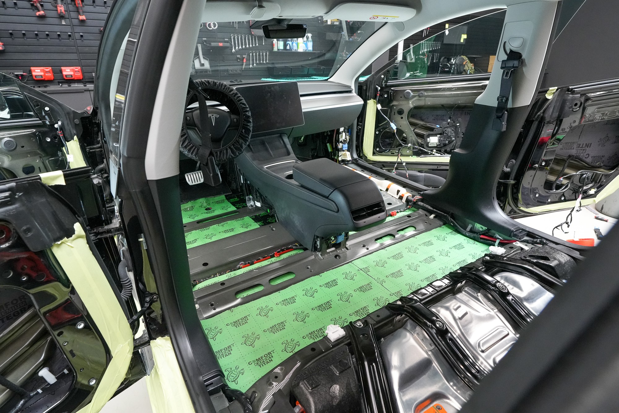 Práce na odhlučnění vozu Tesla Model 3 začínají demontáží interiéru. V tomto případě ve voze zůstává středový panel a opěradla zadních sedadel. Po odstrojení zůstane odkrytá karoserie, na níž je okamžitě patrná minimální úroveň továrního odhlučnění. Většina ocelových ploch je zcela bez úpravy, jen místy se nachází tenká vrstva základního antivibračního materiálu, která však nedokáže účinně eliminovat hluk a vibrace.