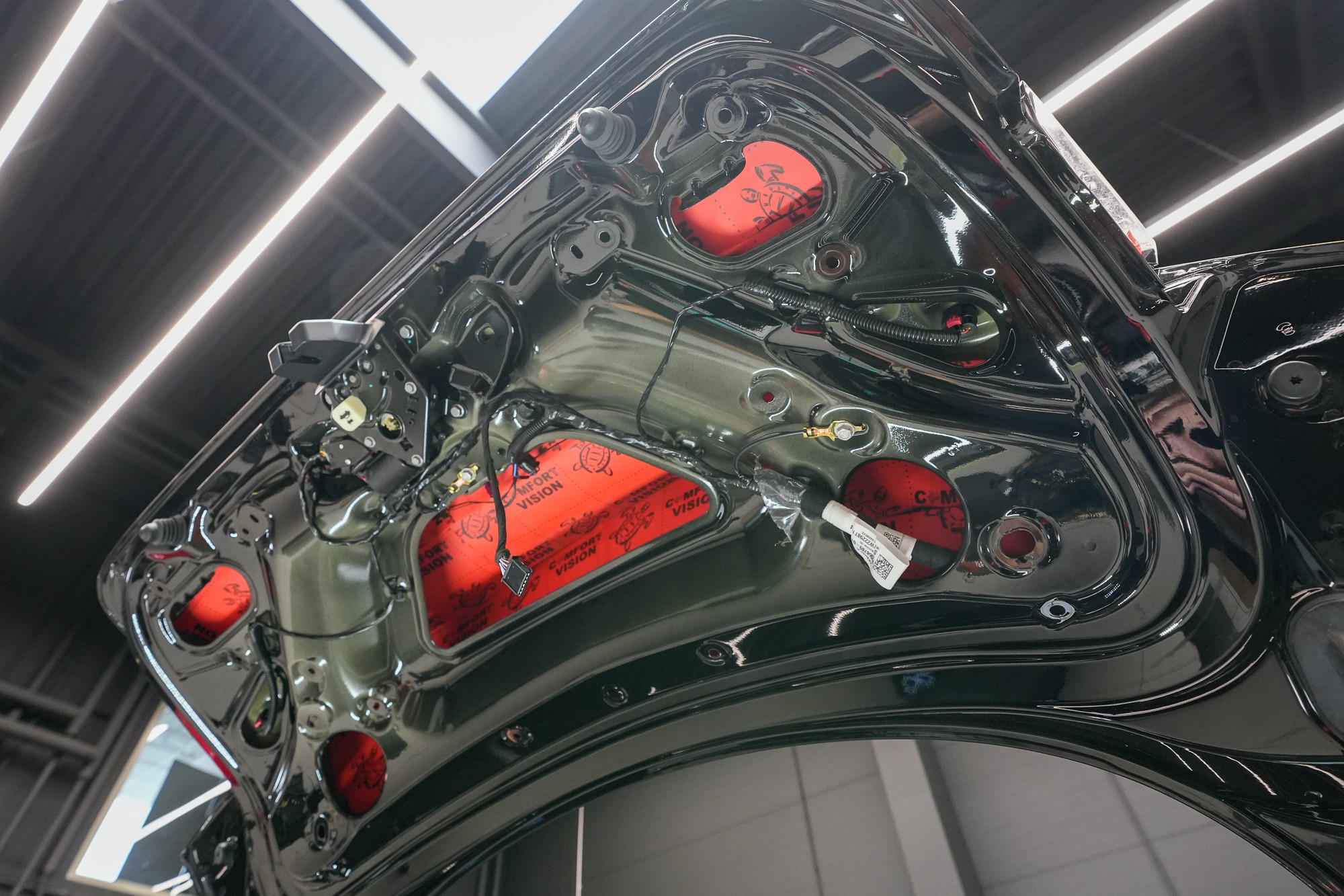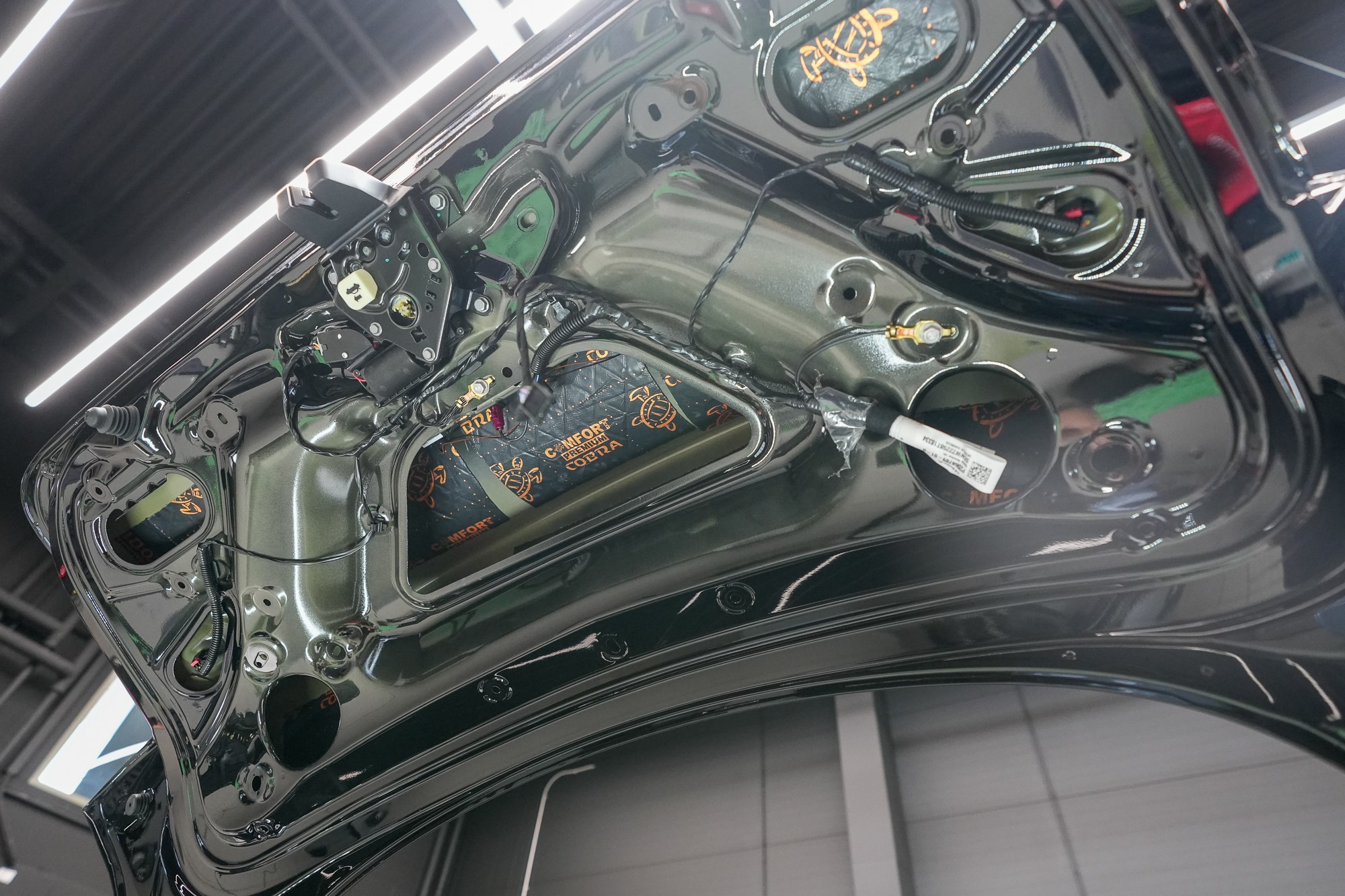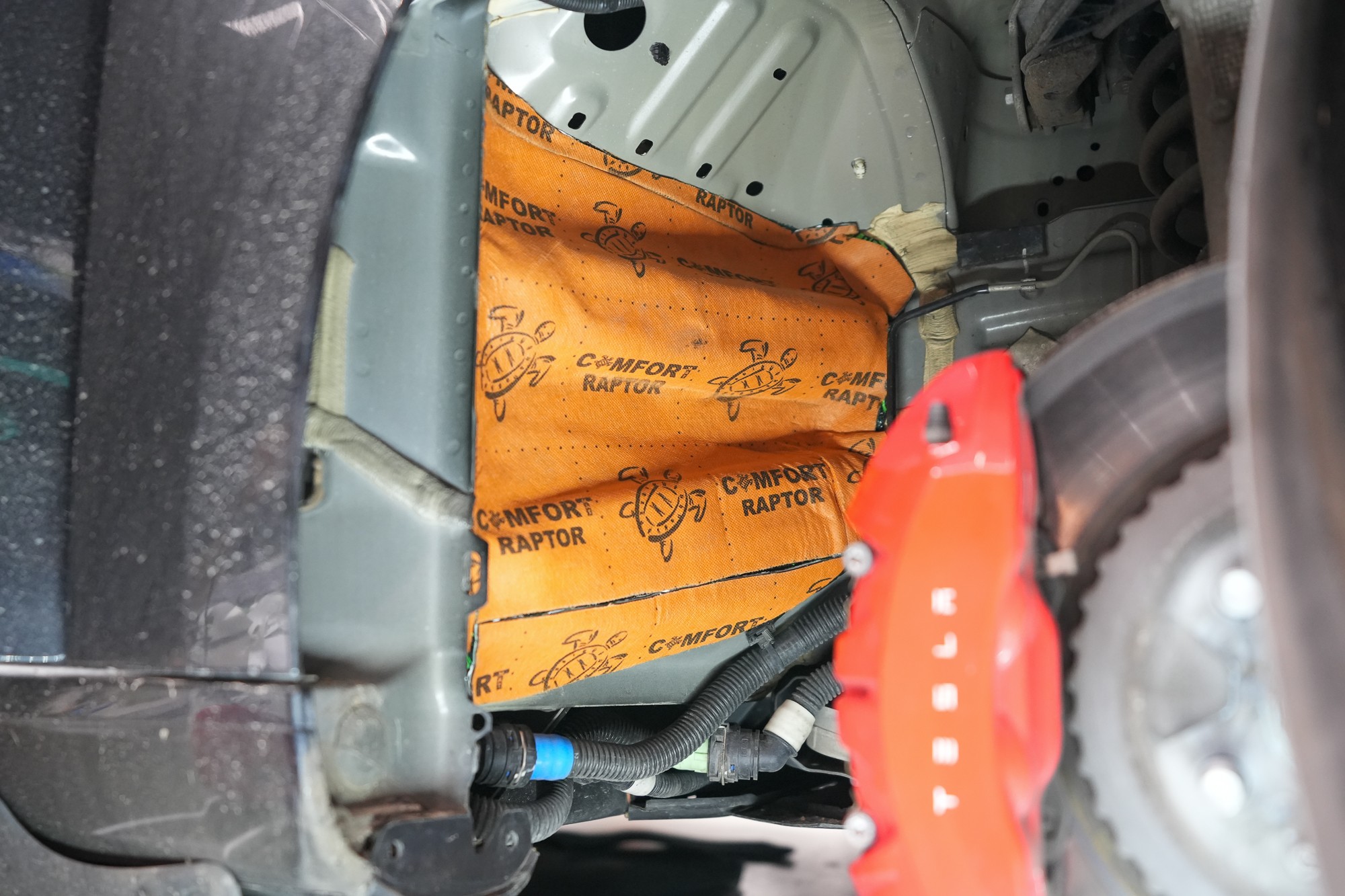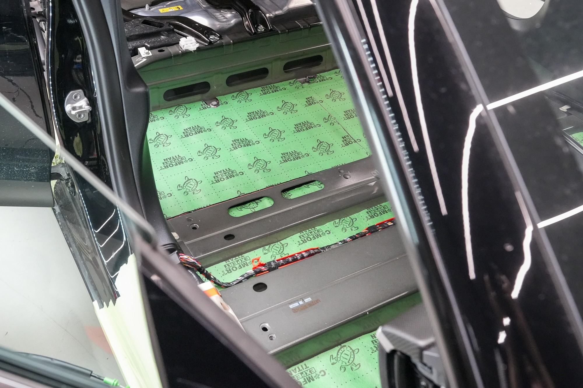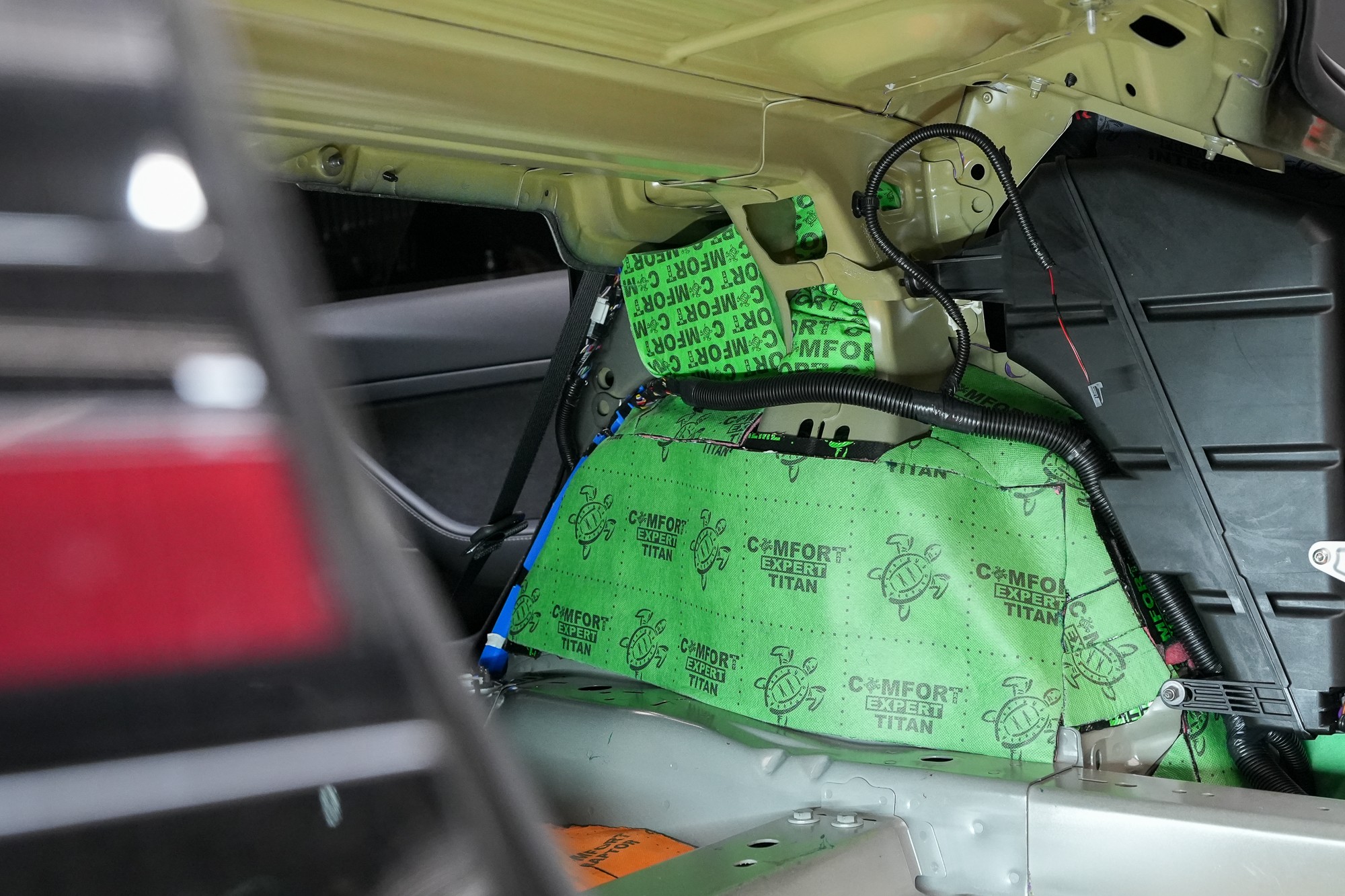 Zadní podběhy opatříme stejným zvukově izolačním materiálem, jaký jsme použili i na odhlučnění podlahy. Comfortmat Titan se vyznačuje rekordní schopností zvukové izolace a kde jinde tento materiál použít, než na zadní podběhy. Nezapomínáme ani na blatníky, na které aplikujeme lehký membránový materiál Comfortmat Integra. Tento materiál využíváme i při odhlučnění dveří, kde ještě více vyniknou jeho vlastnosti.