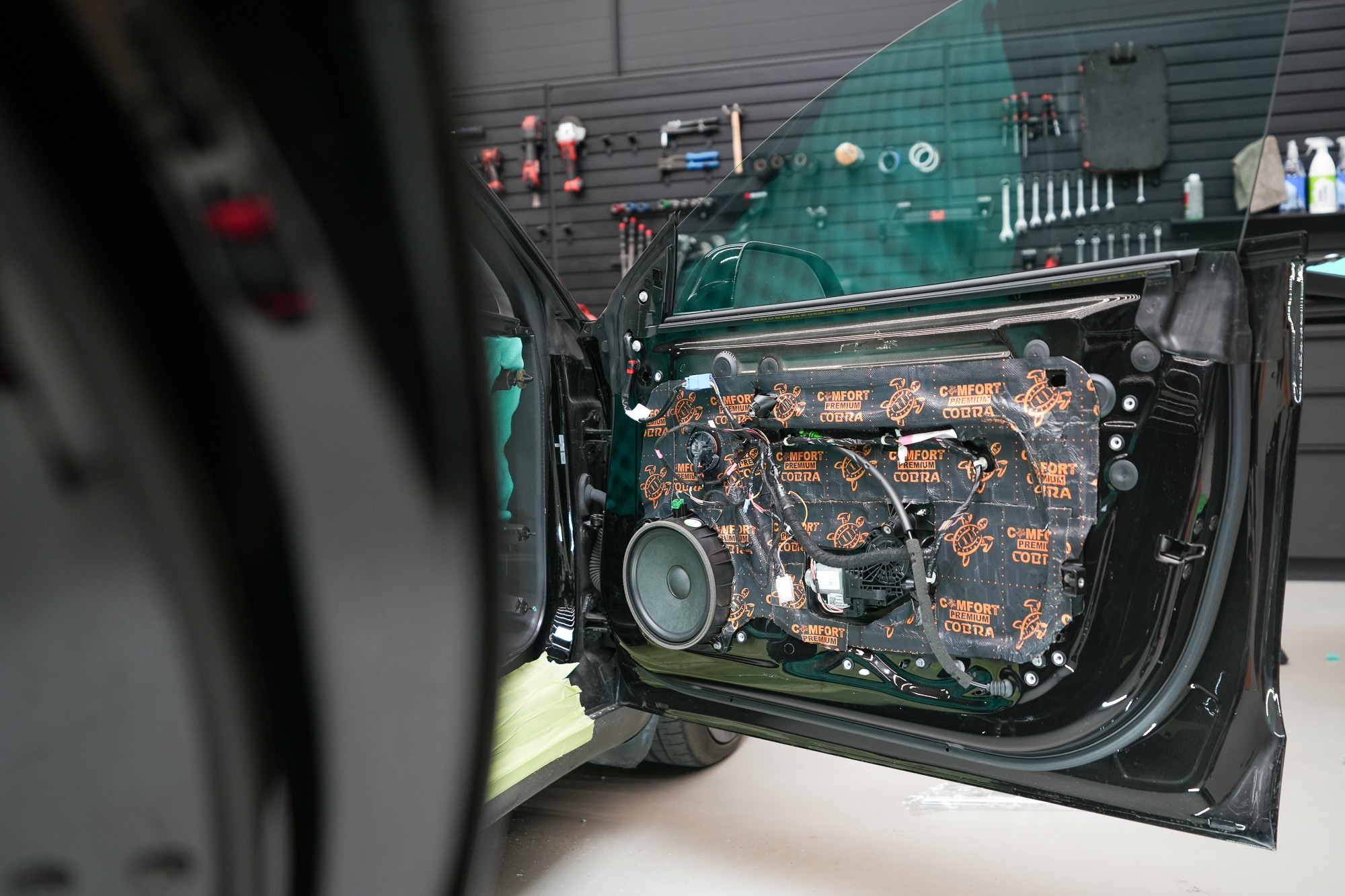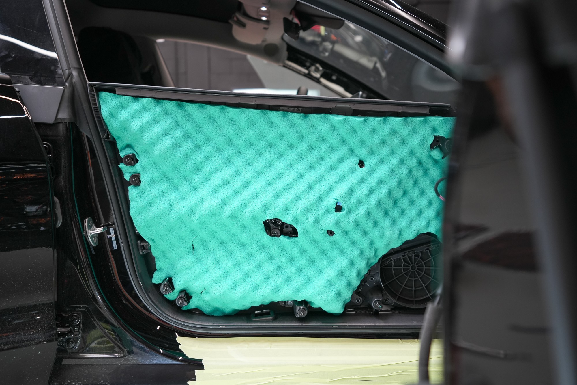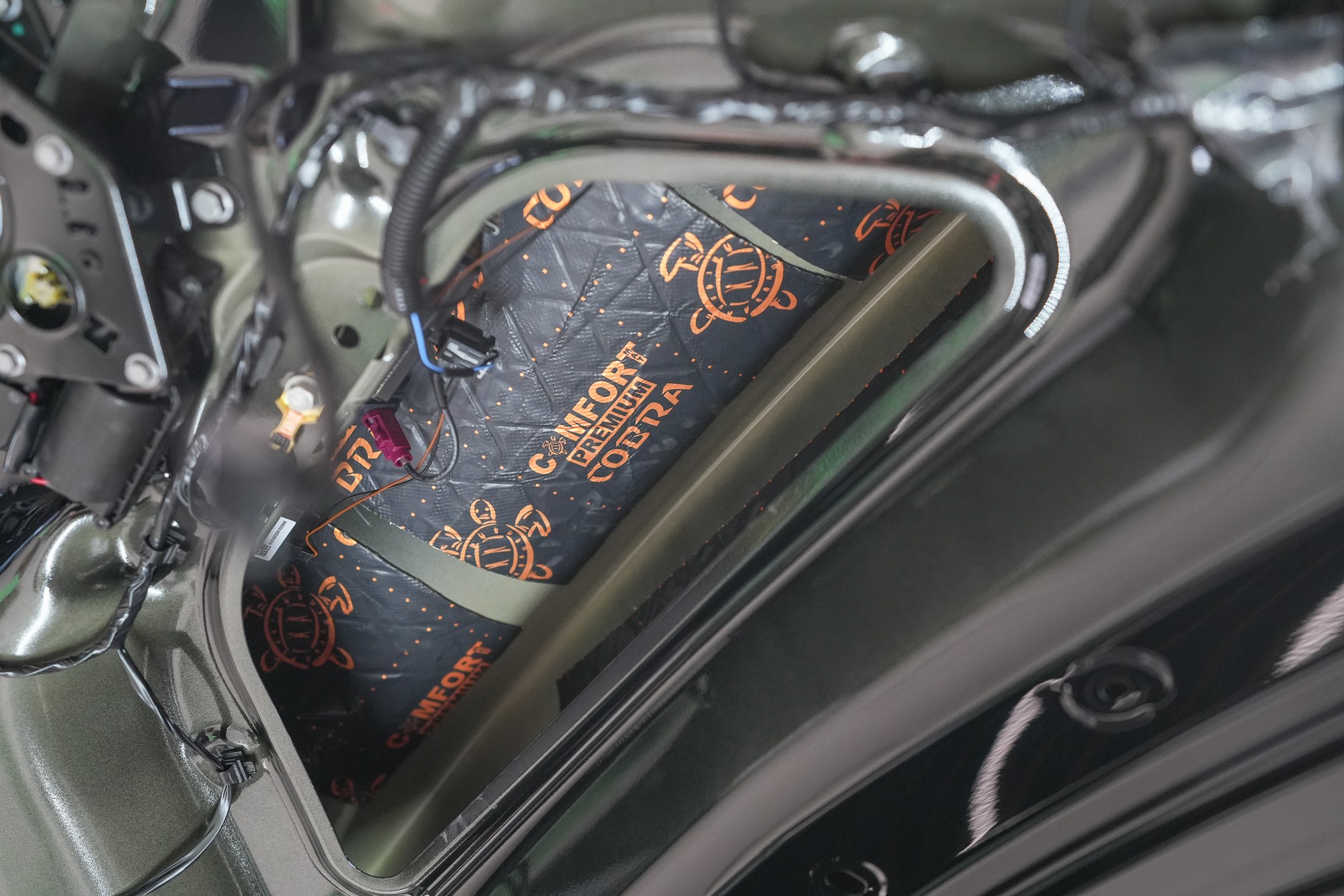 Následně aplikujeme antivibrační materiál Comfortmat Cobra, který se pyšní nejnižší hmotností ze všech antivibračních materiálů na trhu v dané tloušťce 2,3 mm. Tato vrstva slouží k zamezení vibrací a rezonancí vnitřního plechu dveří a u většiny vozidel i k vytvoření uzavřené ozvučnice pro reproduktory, což má za následek zlepšení ozvučení.