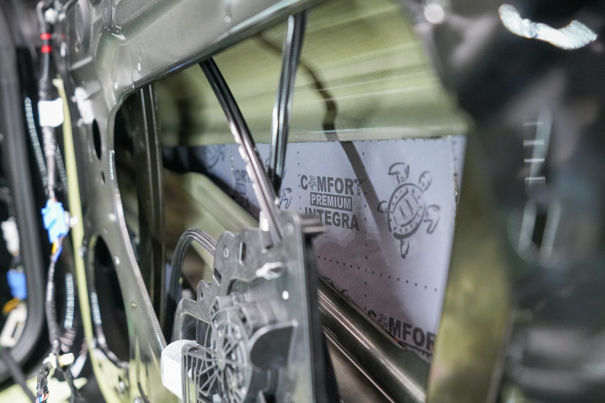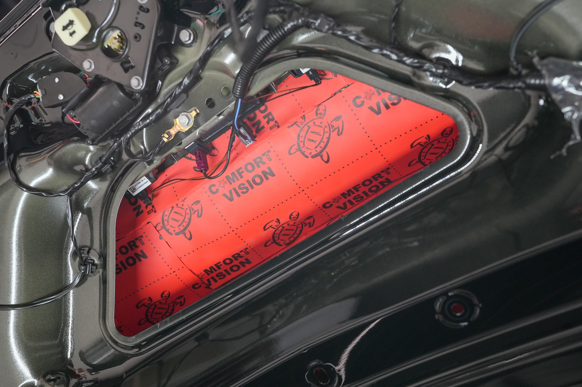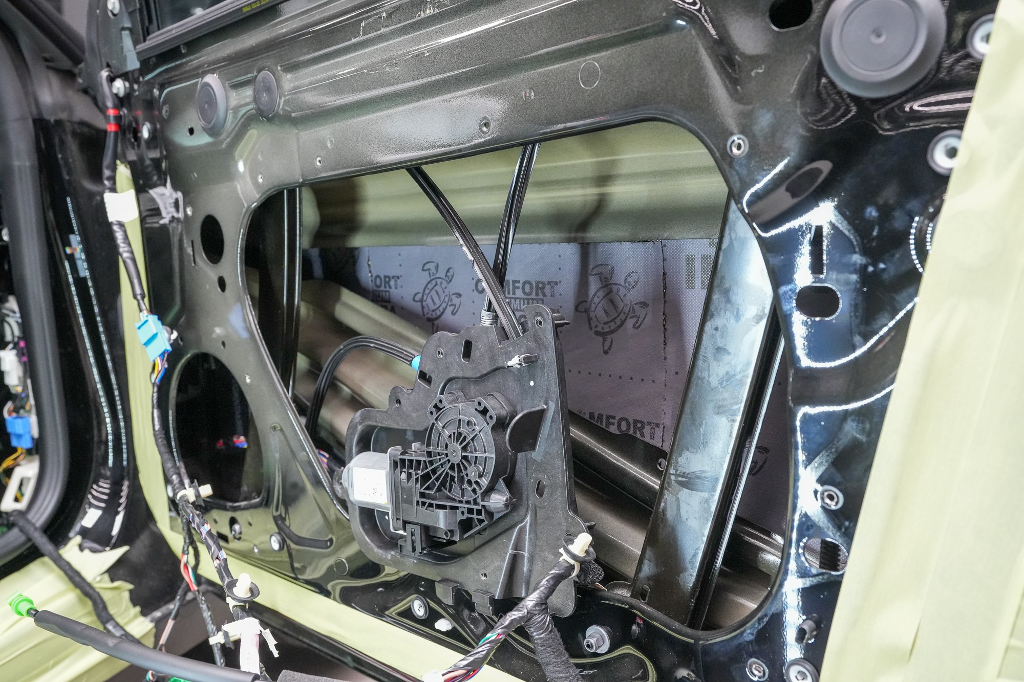 Následně aplikujeme antivibrační materiál Comfortmat Cobra, který se pyšní nejnižší hmotností ze všech antivibračních materiálů na trhu v dané tloušťce 2,3 mm. Tato vrstva slouží k zamezení vibrací a rezonancí vnitřního plechu dveří a u většiny vozidel i k vytvoření uzavřené ozvučnice pro reproduktory, což má za následek zlepšení ozvučení.