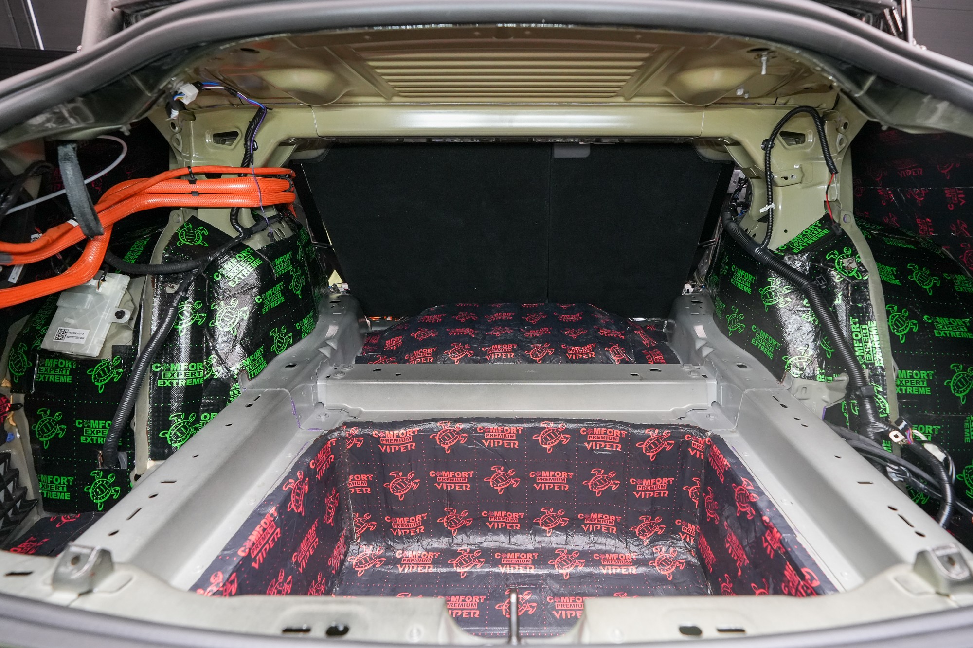 Zavazadlový prostor odhlučňujeme podobným způsobem, protože je nezbytné co nejvíce zamezit všudypřítomným vibracím a hluku od pneumatik pronikat do interiéru. A i proto volíme totožné materiály jako v případě odhlučnění podlahy. Na dno kufru aplikujeme materiál Comfortmat Viper o tloušťce 3 mm a MLF 0,49. Ten nejen absorbuje veškeré vibrace, ale sníží i nízkofrekvenční hluk, který je typický pro tuto oblast.