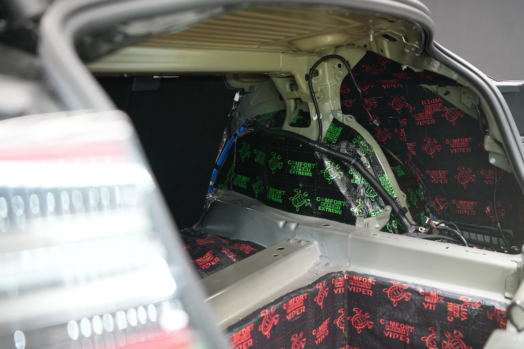 Na zadní podběhy, které jsou nejvíce zatížené vibracemi i hlukem, aplikujeme v první vrstvě stejně jako na podlahu antivibrační materiál Comfortmat Extreme. Tloušťka 3,5 mm a akustický ztrátový činitel 0,63 jednotek umožní důkladné zamezení veškerých vibrací a nízkofrekvenčního hluku od pneumatik, který je typický pro zadní podběhy.
