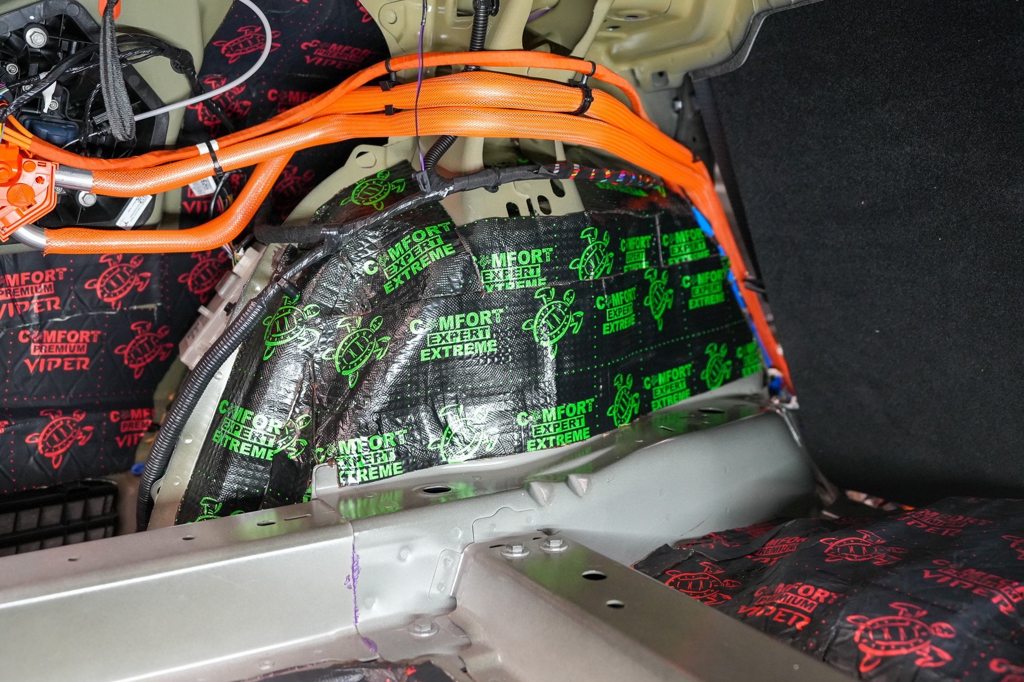 Startujeme tradičně odhlučněním podlahy, která je kvůli výrazným vibracím a hluku zejména o nízkých frekvencích nejvíce náročná na použití správných materiálů. I proto u balíčku Premium Plus používáme profesionální antivibrační materiál Comfortmat Extreme, který při své tloušťce pouhých 3,5 mm poskytuje akustický ztrátový činitel (MLF) 0,63 jednotek. To z něj dělá nejúčinnější antivibrační materiál na trhu o tloušťce do 4 mm a perfektně se tedy hodí do našich instalací zaměřených na maximální účinnost.
