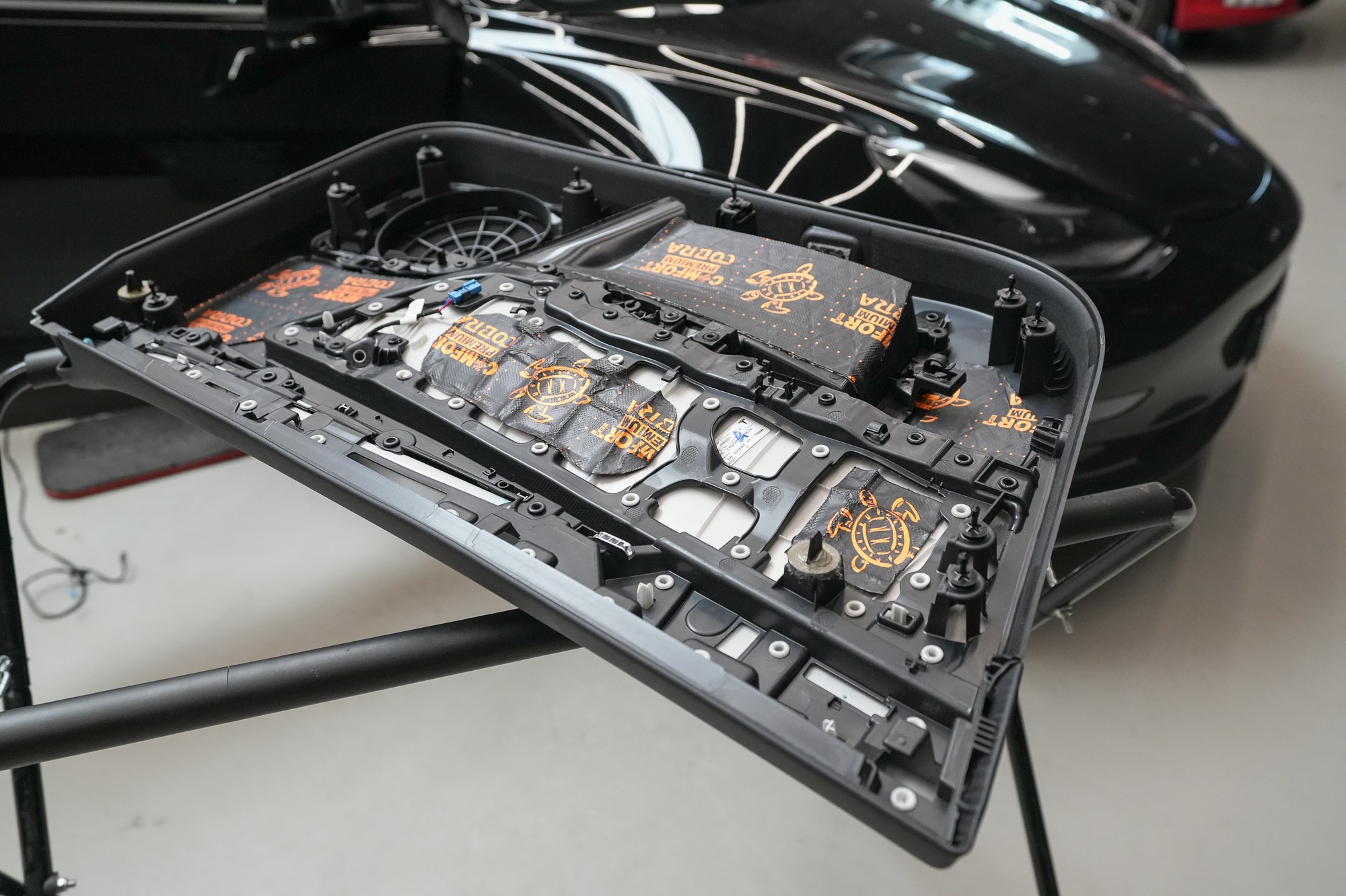 Čtvrtou vrstvou odhlučnění dveří je opět Cobra, který aplikujeme i na plastové výplně dveří. Tím plast zejména zpevníme a snížíme různé vibrace a zvuky, které by mohly v budoucnu znepříjemnit jízdu například při poslouchání hudby. Zde již materiál aplikujeme pouze bodově, což k danému účelu naprosto dostačuje a nedojde ke zbytečnému navýšení hmotnosti.