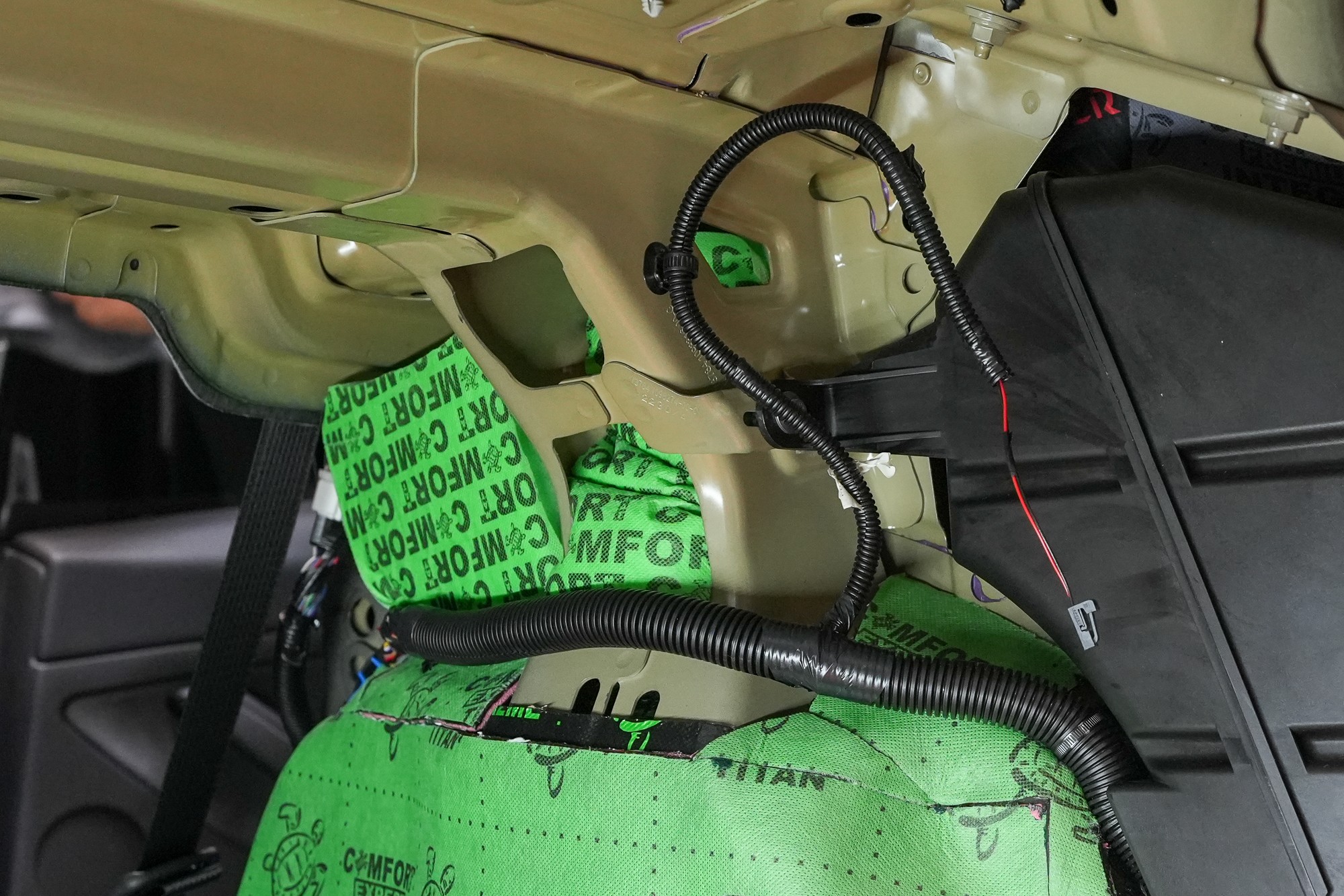 Pro dutiny karoserie v zadní části vozu, kde nelze aplikovat klasický tlumicí materiál, jsme použili Comfortmat Soundtrap. Jedinečná pěna s mikroporézní viskoelastickou strukturou a otevřenými buňkami vysoké hustoty poskytuje maximální absorbci hluku v širokém frekvenčním rozsahu.