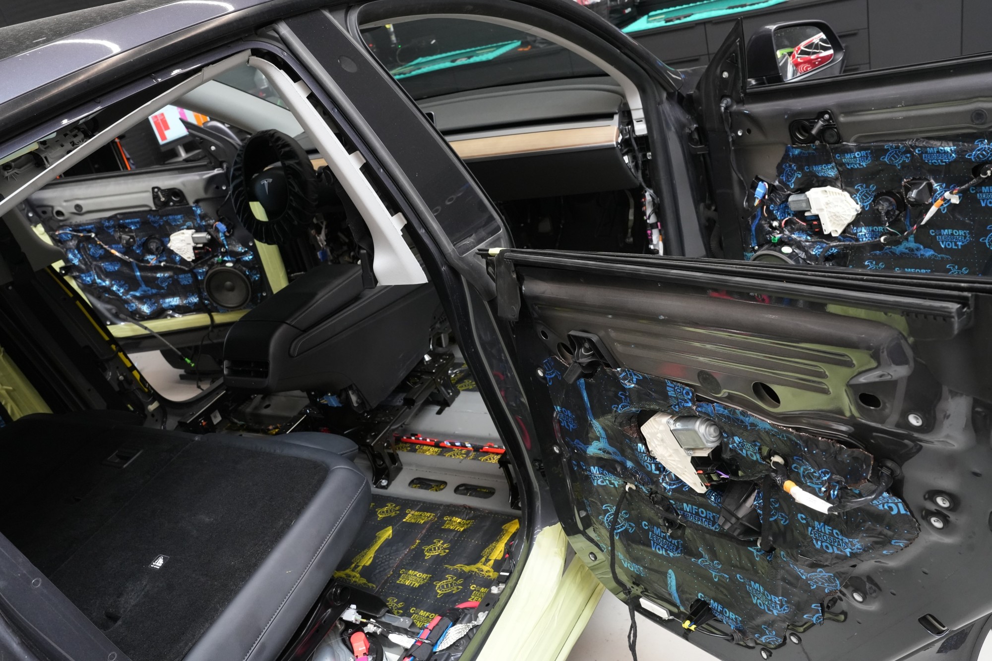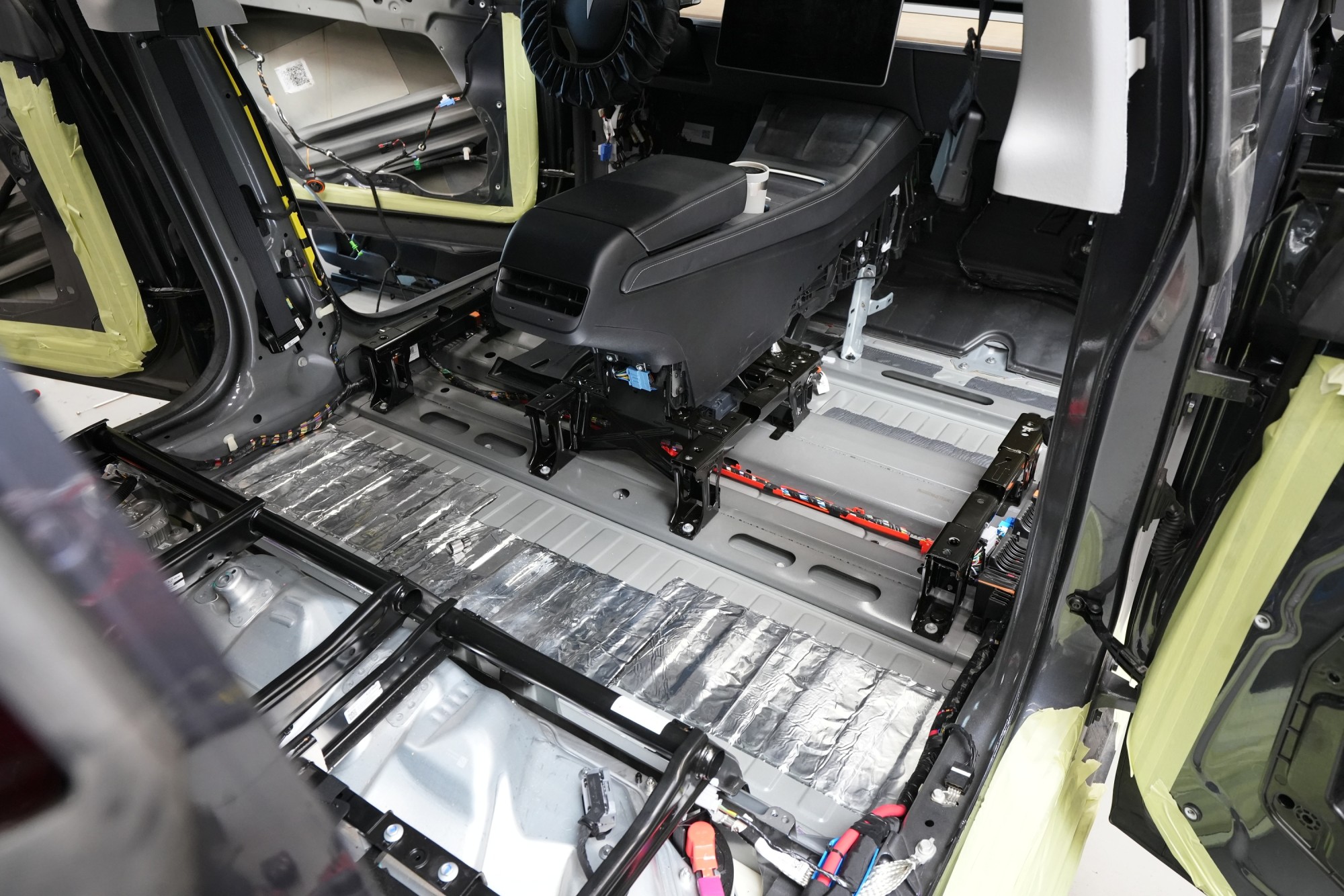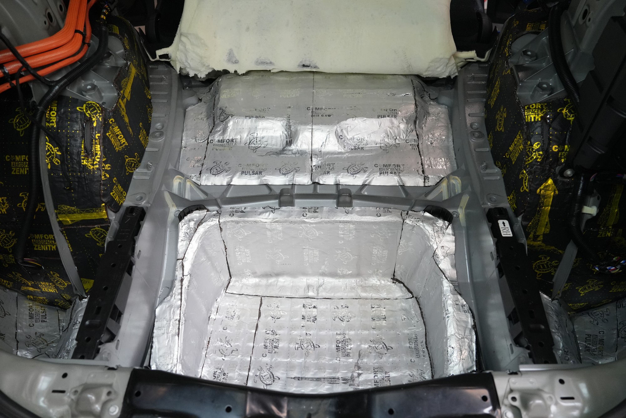 Prvním krokem při odhlučnění Tesly Model Y je kompletní rozebrání interiéru. Demontujeme sedadla, středový tunel, obložení sloupků i čalounění podlahy a zavazadlového prostoru, takže karoserie zůstane zcela odhalená. Už v této fázi je patrné, jak skromně výrobce pracuje s tovární izolací – plechové části jsou většinou bez jakékoli ochrany a jen na několika málo místech je nalepena tenká vrstva základního materiálu, která prakticky neplní svou funkci. Ať už jde o elektromobil nebo klasický spalovací vůz, situace je stejná – sériové odhlučnění je nedostatečné a v případě Modelu Y na to zákazníci často narážejí, protože tichý pohon ještě více zdůrazňuje hluky od podvozku, kol a proudícího vzduchu.