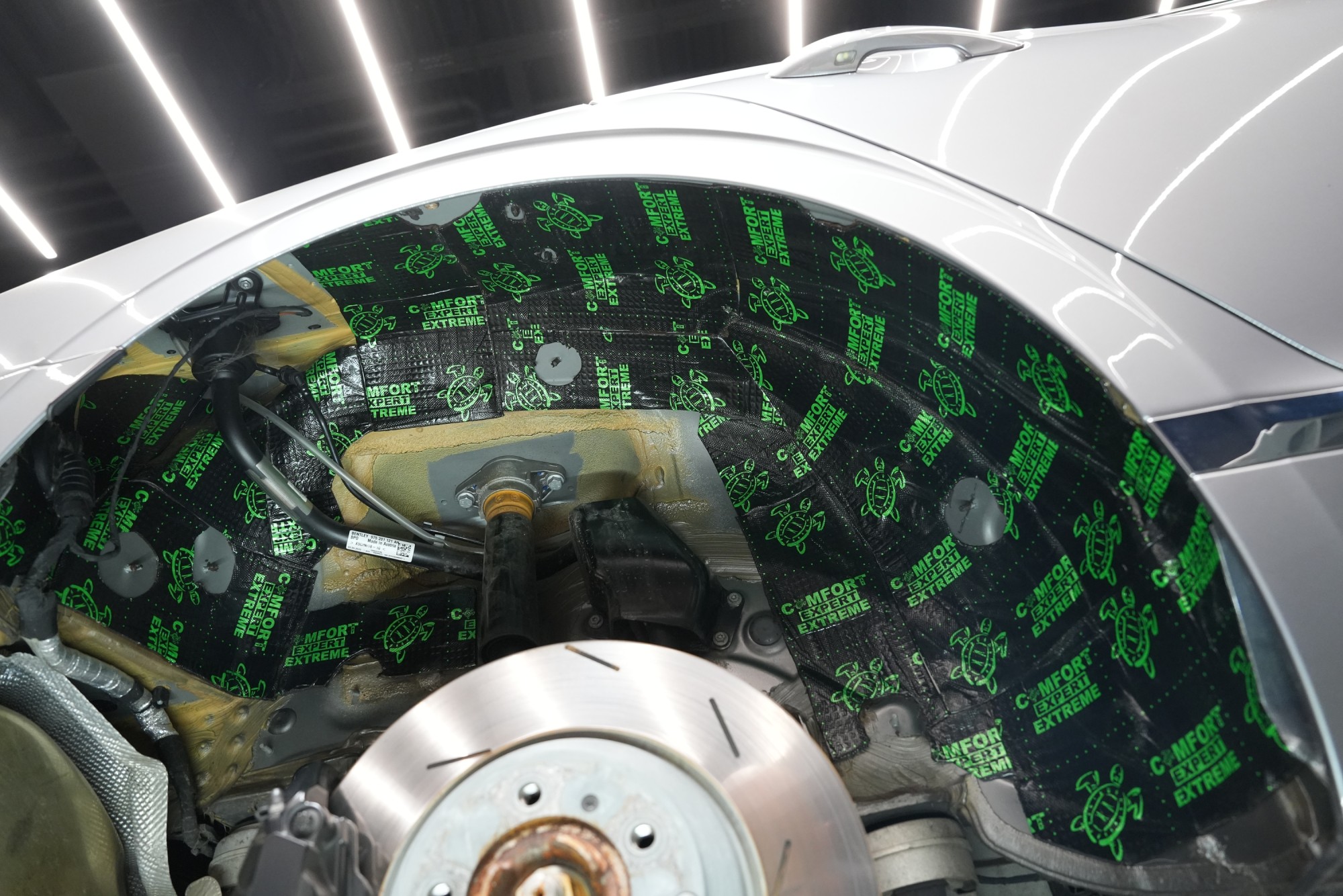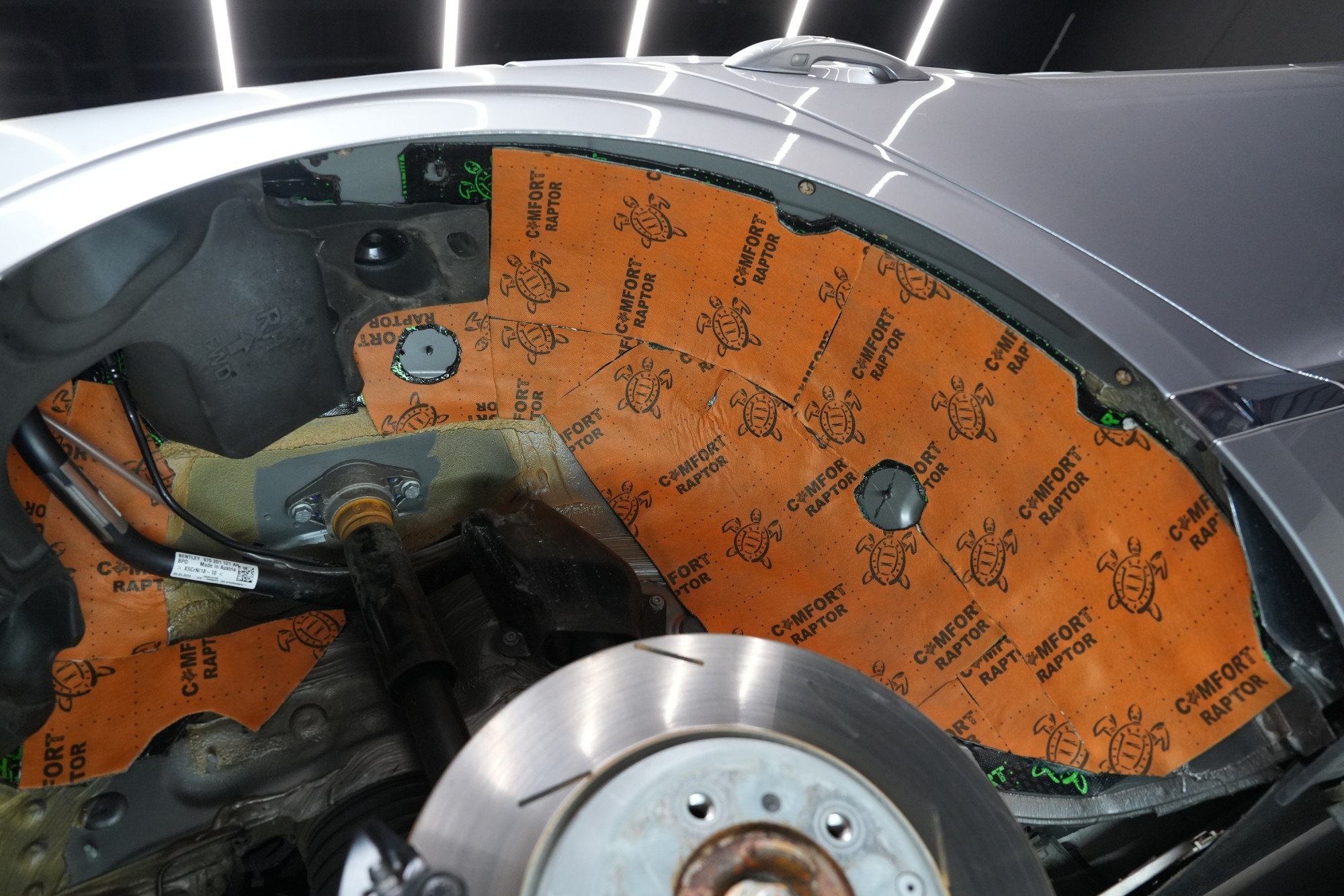 Aplikace špičkového antivibračního materiálu Comfortmat Extreme na vnější stranu podběhu. Řešení snižuje strukturální hluk od kol (především nízké frekvence), potlačuje rezonance a přispívá k vyššímu akustickému komfortu zejména při jízdě po hrubém povrchu.