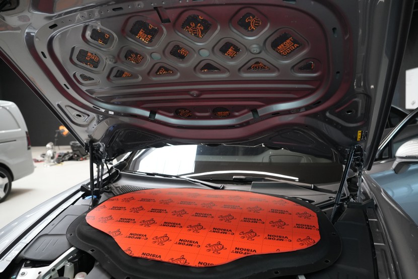 Odhlučnili jsme i kapotu. V první vrstvě aplikujeme opět lehký antivibrační materiál Comfortmat Cobra. Tím kapotu zpevníme, zamezíme vibracím, které se přenáší do dalších částí vozu a zmizí i typický plechový zvuk při zavření kapoty. Na originální kryt kapoty následně aplikujeme zvukově i tepelně izolační materiál Comfortmat Vision.