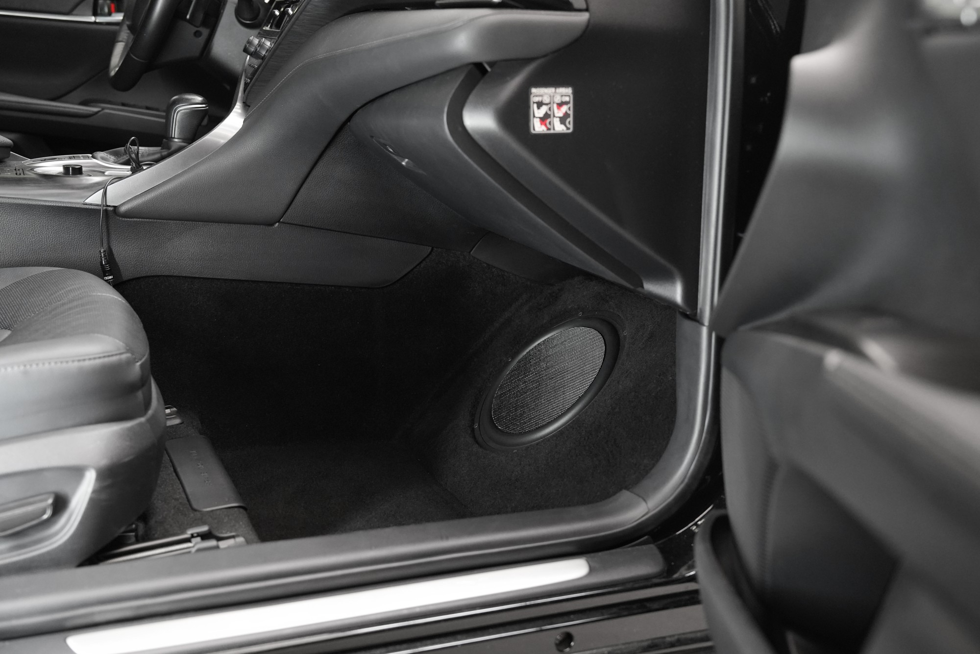 Zakázková uzavřená ozvučnice předního subwooferu tvarovaná přesně podle prostoru pod palubní deskou spolujezdce. Konstrukce využívá maximální možný objem bez zásadního omezení místa pro nohy a je navržena s důrazem na pevnost a integraci do interiéru vozu.