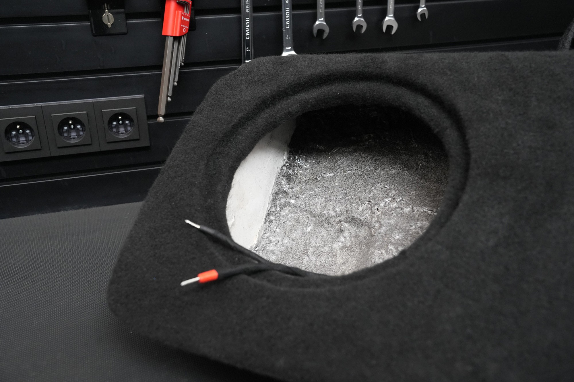Konstrukce je vytvořena z laminátového tmelu, zesílena příměsí železného prachu pro maximální pevnost a potlačení nežádoucích rezonancí. Čelní MDF deska zajišťuje stabilní uchycení subwooferu a je potažena kobercem v barvě interiéru, aby výsledná instalace přirozeně zapadla do vzhledu vozu.