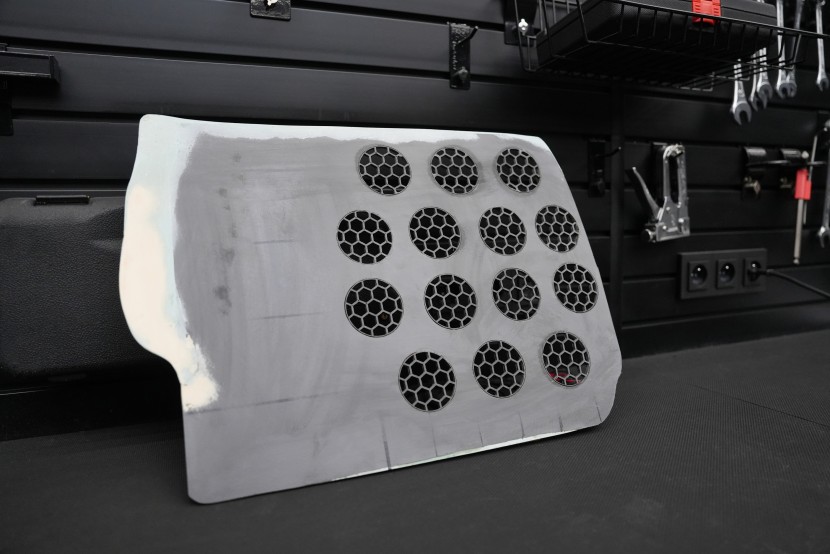 Krycí deska ve fázi před finálním potahem s integrovanými ochrannými mřížkami. Otvory jsou navrženy tak, aby neomezovaly průzvučnost, zachovaly správnou funkci subwooferu a zároveň poskytly mechanickou ochranu při kontaktu s nohama spolujezdce.