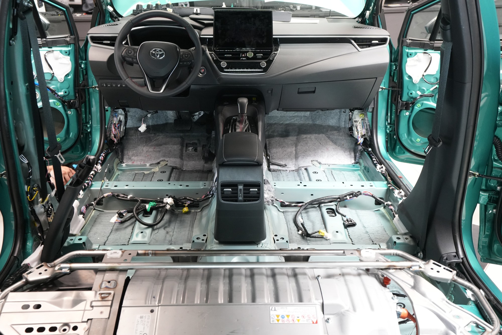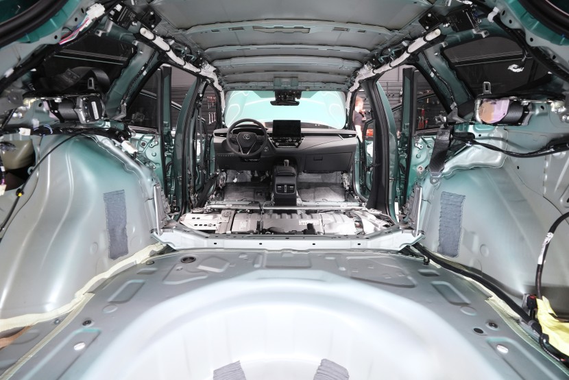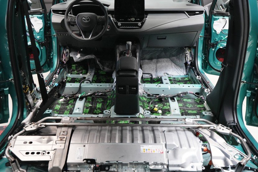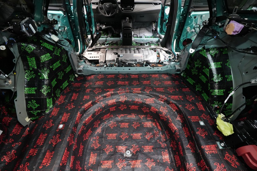 Proces odhlučnění Toyoty Corolla začíná kompletním rozebráním interiéru. Postupně vyjmeme sedadla, středovou konzoli, koberec s čalouněním podlahy, obložení sloupků i výplně zavazadlového prostoru. Auto se tak promění v odkrytou karoserii, na níž je dobře patrné, jak slabě Toyota řeší sériovou zvukovou izolaci. Většina plechových panelů zůstává zcela bez ochrany, případně pokrytá jen bodově základního antivibračního materiálu.