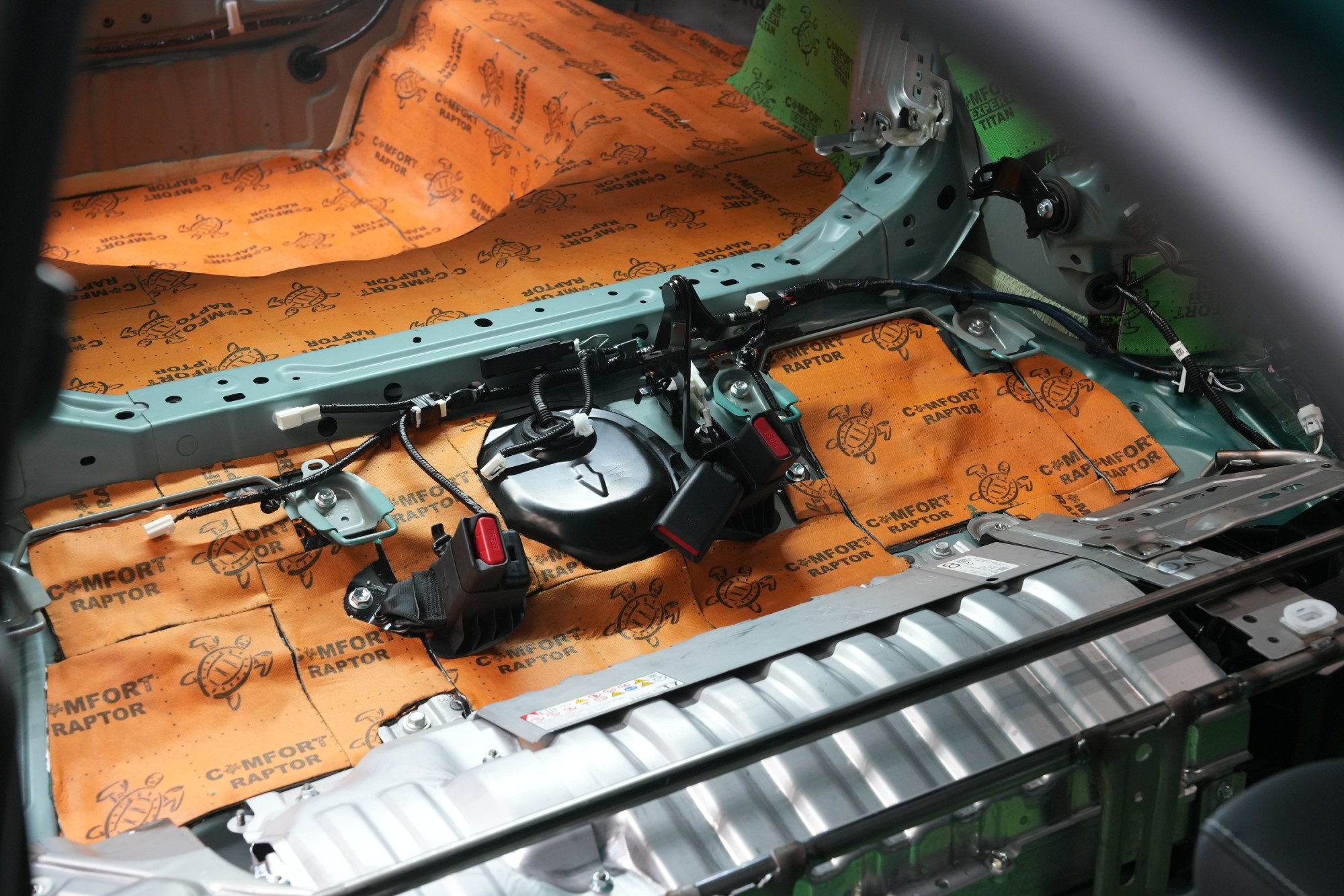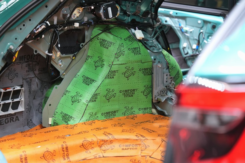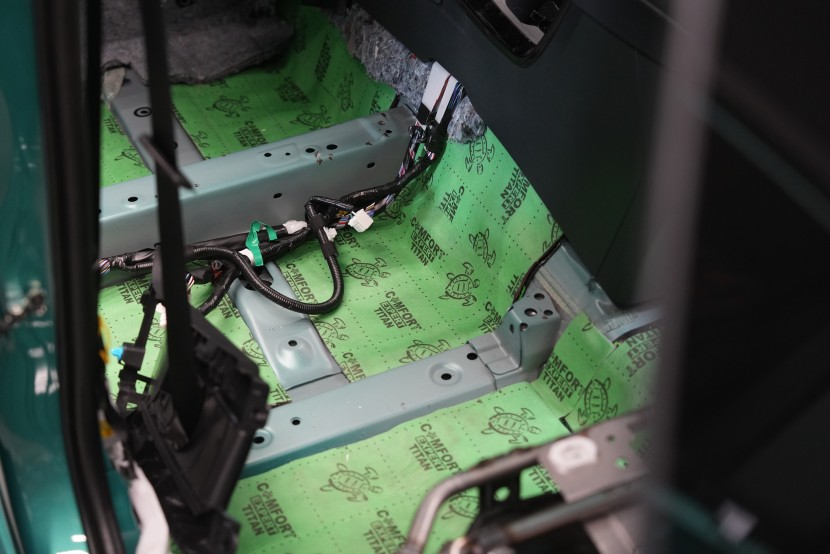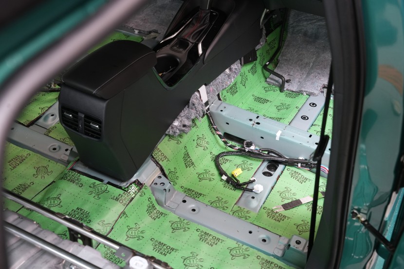 Tento materiál nahrazuje díky svému složení hned dvě vrstvy odhlučnění. Spodní část tvoří červená zvukově izolační vrstva o tloušťce 4 mm a na ní navazuje polymerová membrána o tloušťce taktéž 4 mm. Právě membrána mnohonásobně zvyšuje účinnost materiálu a hluk nepropustí do interiéru vozu. Titan spolu s Extremem aplikujeme na všechny přístupné oblasti, abychom umožnili izolaci maximálního množství vibrací a hluku. V přední části podlahy se dostáváme až pod palubní desku, díky čemuž důkladně odhlučníme i přední podběhy z vnitřní části vozu, kde je přístup k větší ploše karoserie. Tovární odhlučnění v přední části vozu samozřejmě ponecháváme pro další zvýšení účinku našeho odhlučnění.