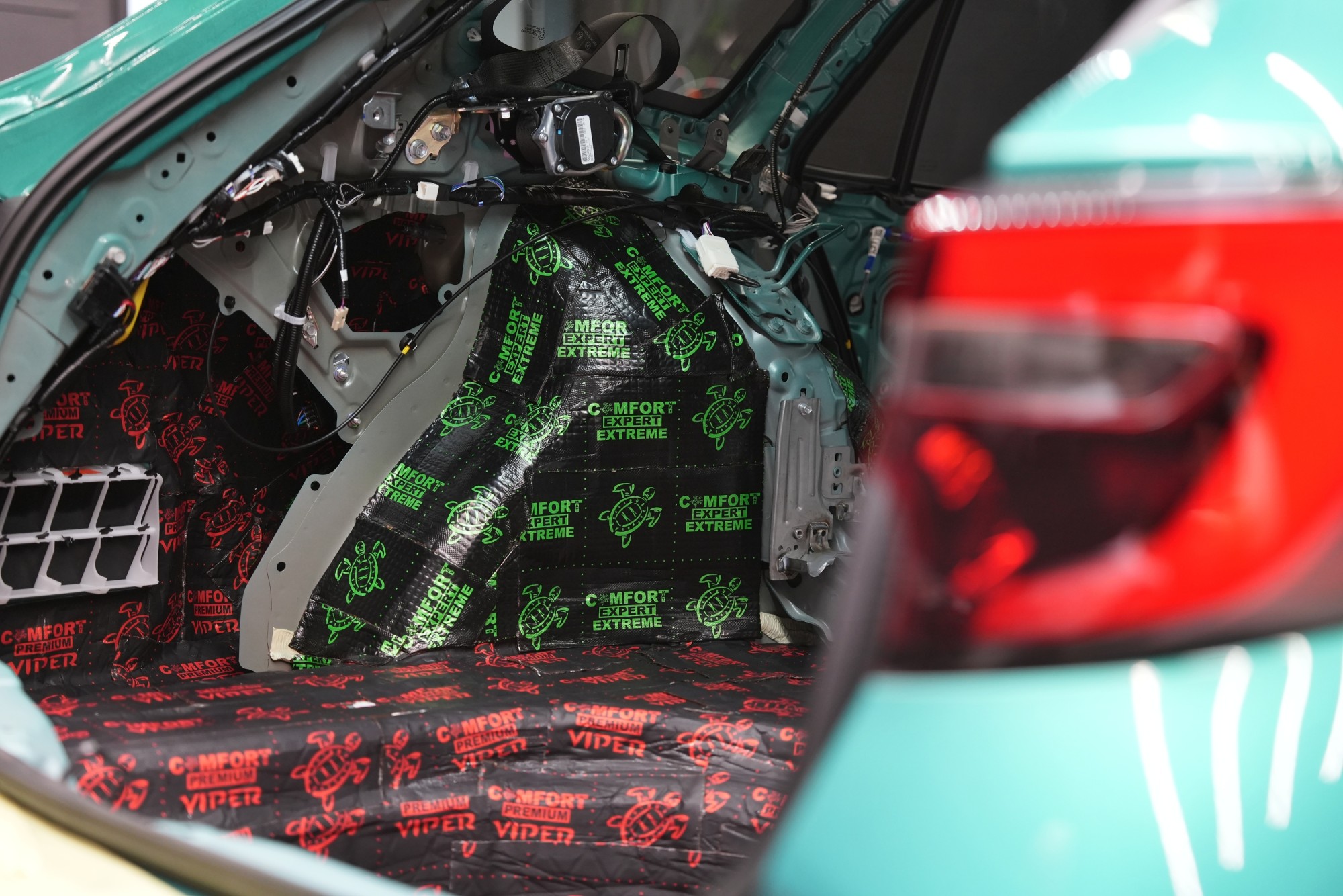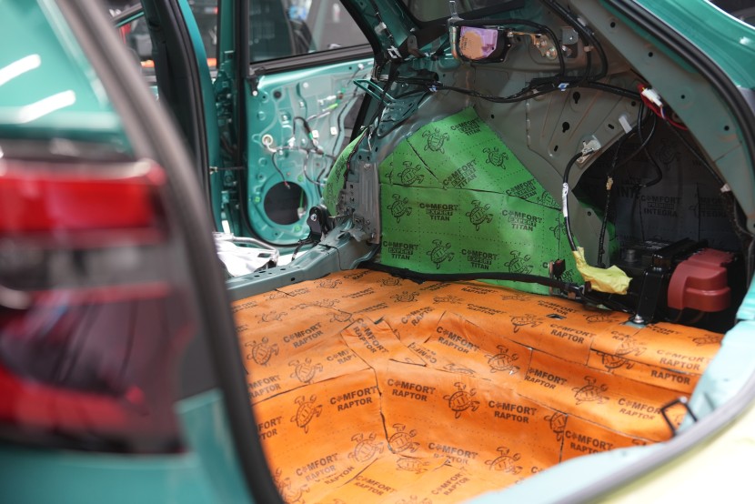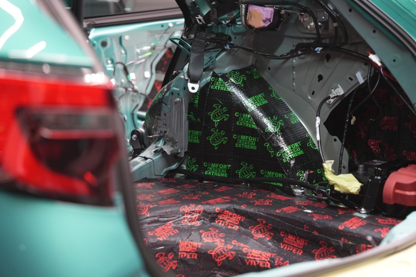 Zavazadlový prostor odhlučňujeme podobným způsobem, protože je nezbytné co nejvíce zamezit všudypřítomným vibracím a hluku od pneumatik pronikat do interiéru. A i proto volíme totožné materiály jako v případě odhlučnění podlahy. Na dno kufru aplikujeme stejný materiál jako pod zadní sedačky, tedy Comfortmat Viper o tloušťce 3 mm a MLF 0,49. Ten nejen absorbuje veškeré vibrace, ale sníží i nízkofrekvenční hluk, který je typický pro tuto oblast.