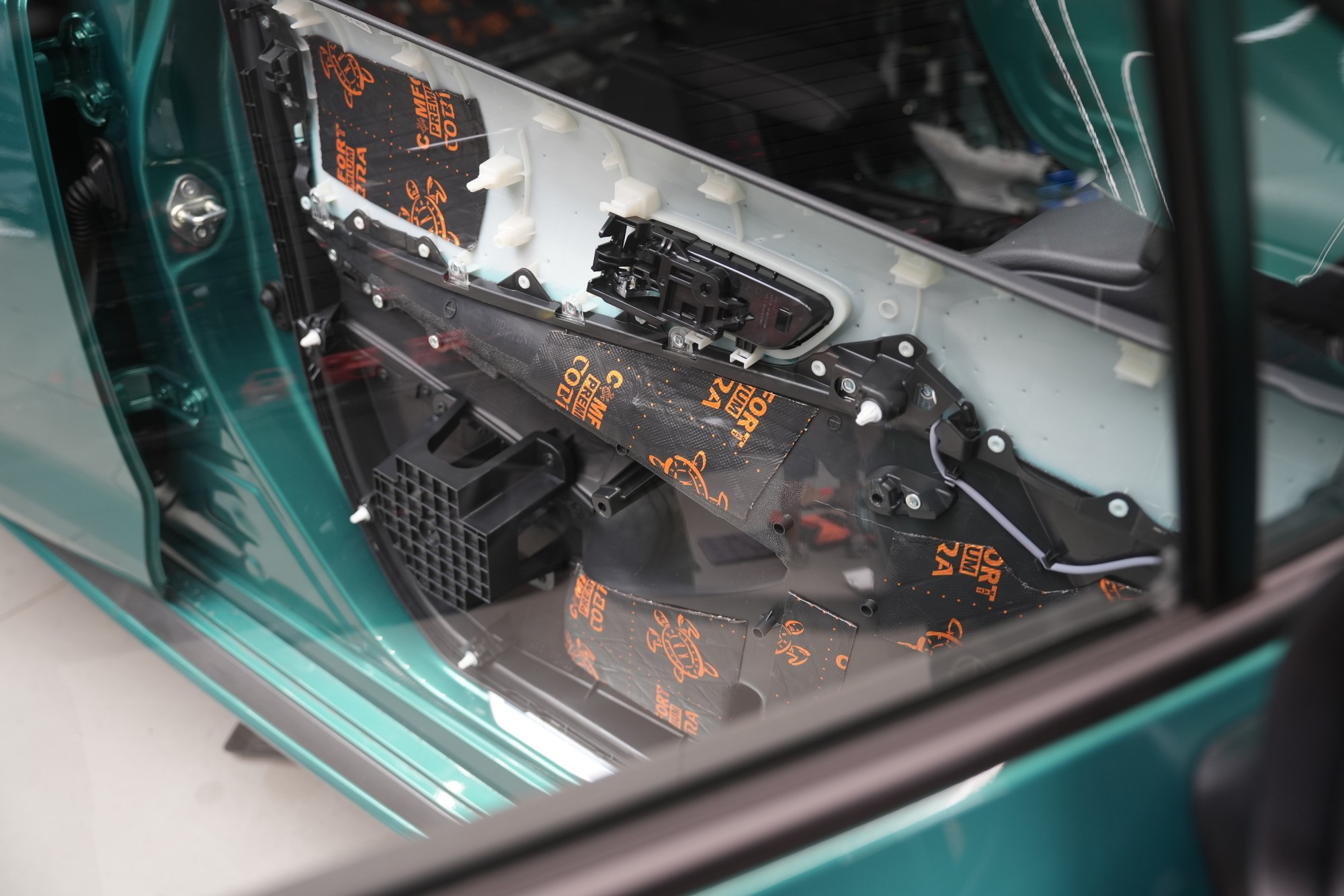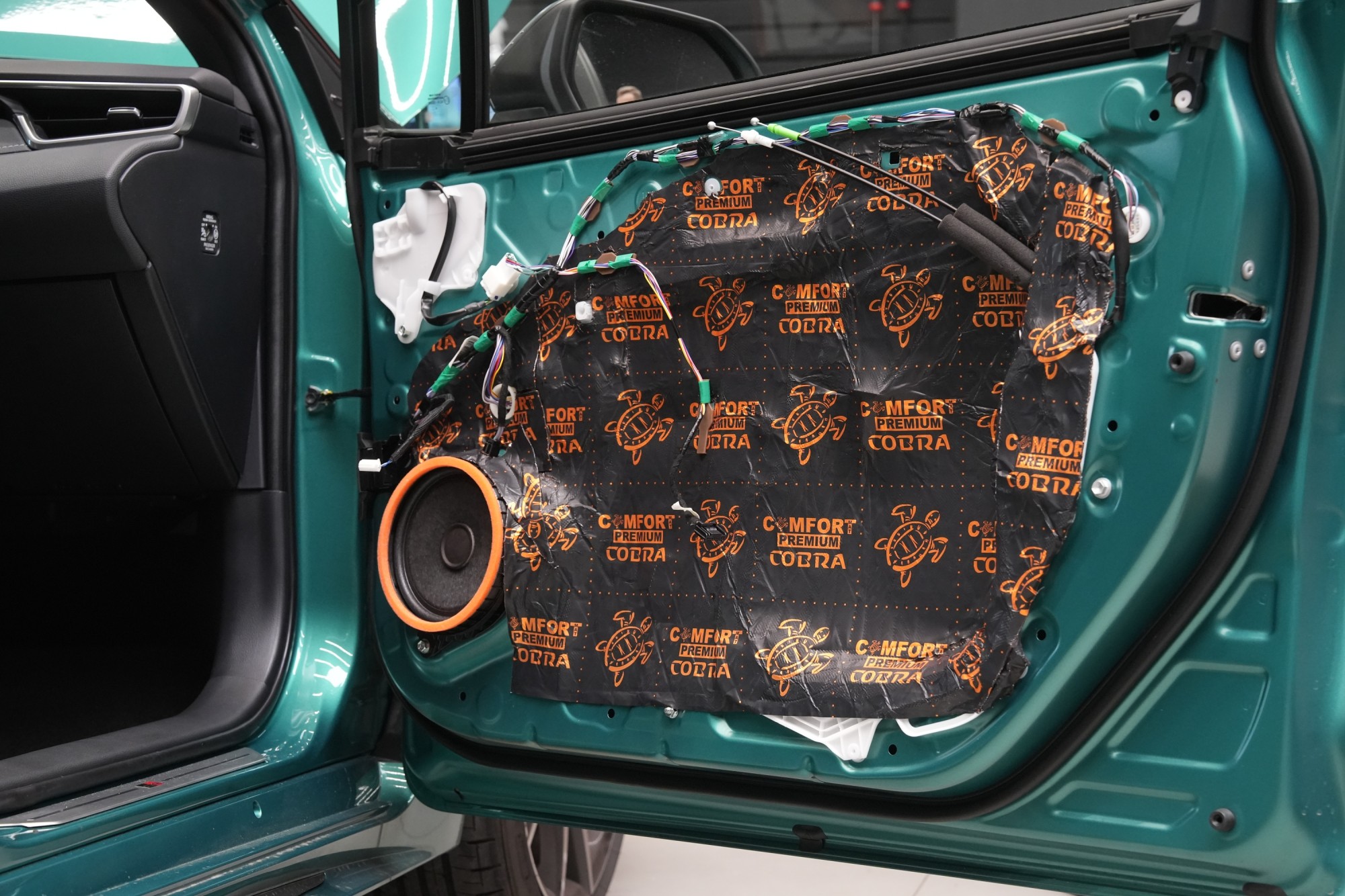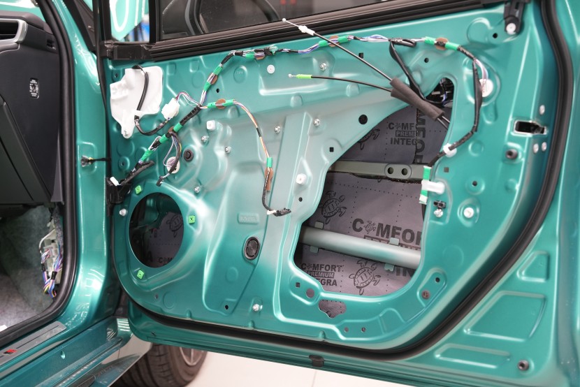 Dalším krokem je aplikace antivibračního materiálu Comfortmat Cobra o tloušťce 2,3 mm, jenž patří k nejlehčím ve své kategorii. Tato vrstva účinně eliminuje vibrace a rezonance vnitřního plechu dveří a zároveň u většiny vozidel vytváří uzavřenou ozvučnici pro reproduktory. Výsledkem je nejen tišší interiér, ale i kvalitnější podání hudby.